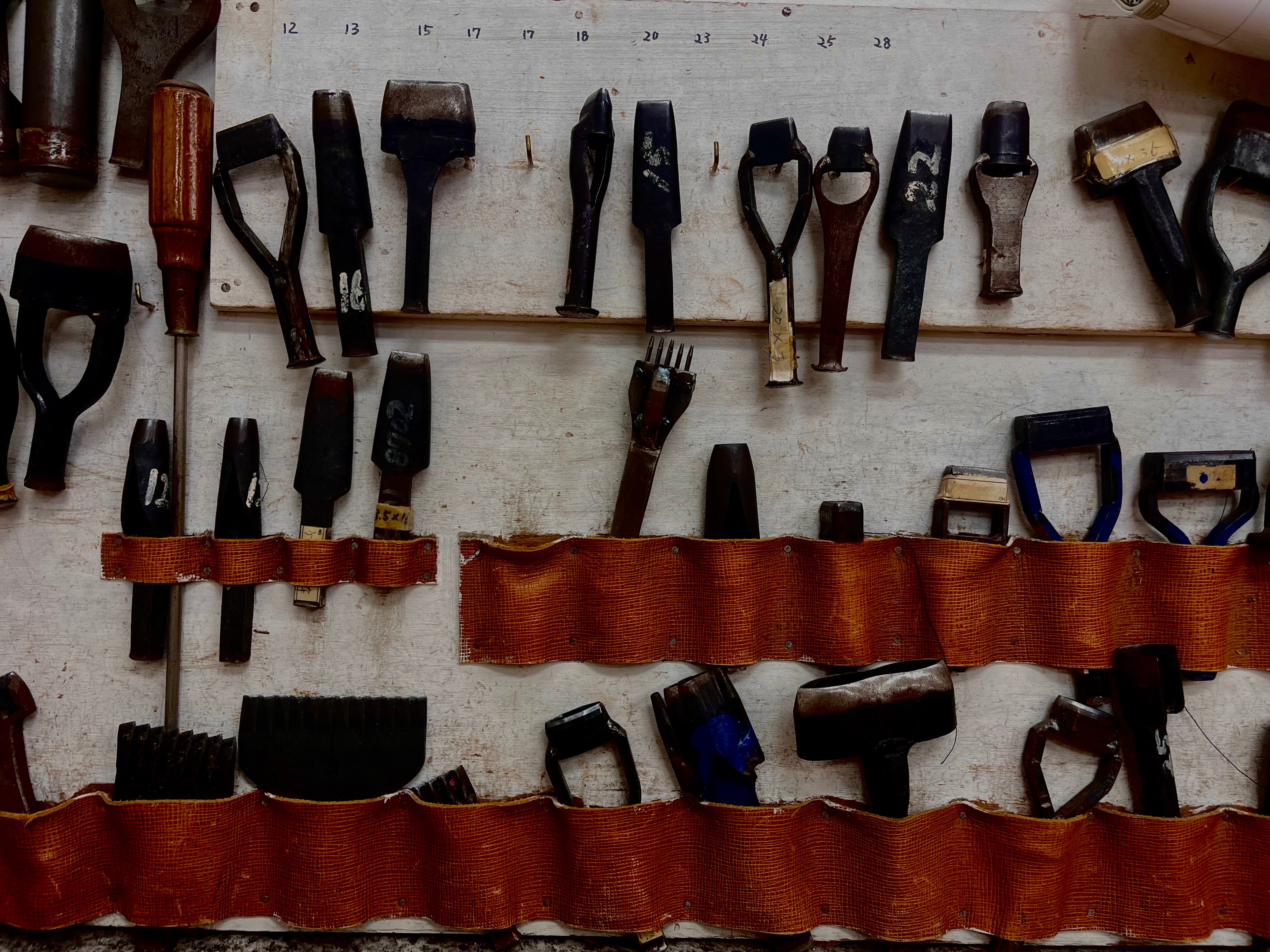 私たちのものづくりは東京浅草橋の本社内にある、「バッグスタジオ」と呼ばれる工房からはじまります。十数機の多種多様なミシン、革漉き機、裁断機、CADオペレーター等々、バッグと財布を作るのに必要なものを一通り揃え、当社在籍の職人が日々仕事をしています。デザイナーと職人が打ち合わせ、プロトタイプを何度も試行錯誤し、新しいものが生まれるその場所は私たちにとって特別な空間です。私たちの製品は海外や、日本の提携工場で量産されますが、ものづくりはこの工房ではじまり、細部にわたるまで、目と手の届くこの場所で行われます。このバッグスタジオでのものづくりが私たちの強みであり、当社製品のクオリティや使いやすさに繋がっています。FUKUROMONO STUDIOという名前には、そんな私たちのものづくりへの想いを込めました。