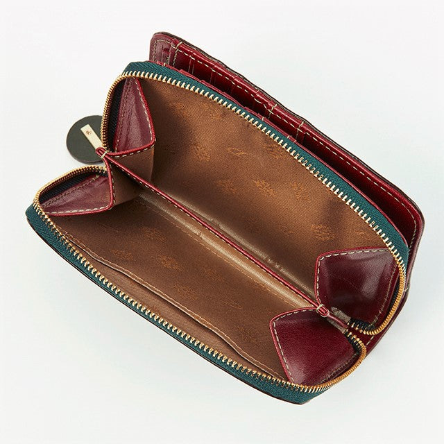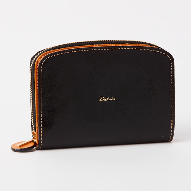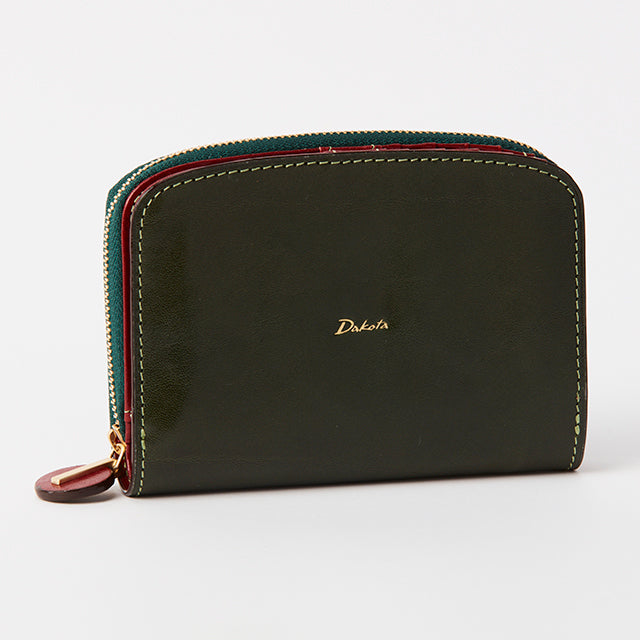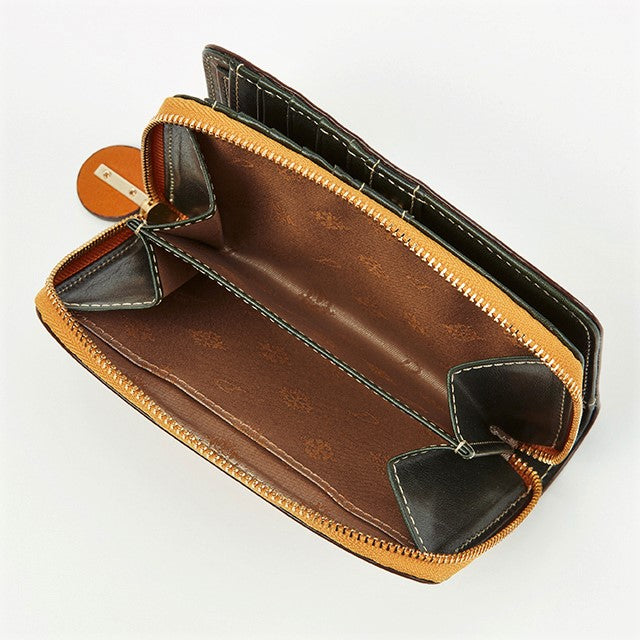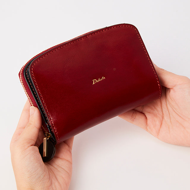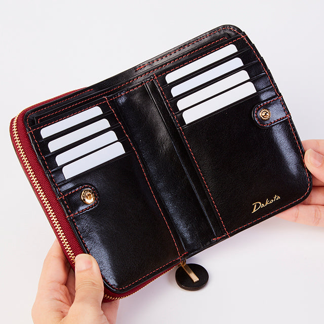 ラウンドファスナー小銭入れタイプの2つ折り財布です。フロント部分はホックを開くと、カードが8枚収納でき、フリーポケットが4つ備わっています。お札入れは、内部が2つに仕切られているので、紙幣を分けて入れることができます。