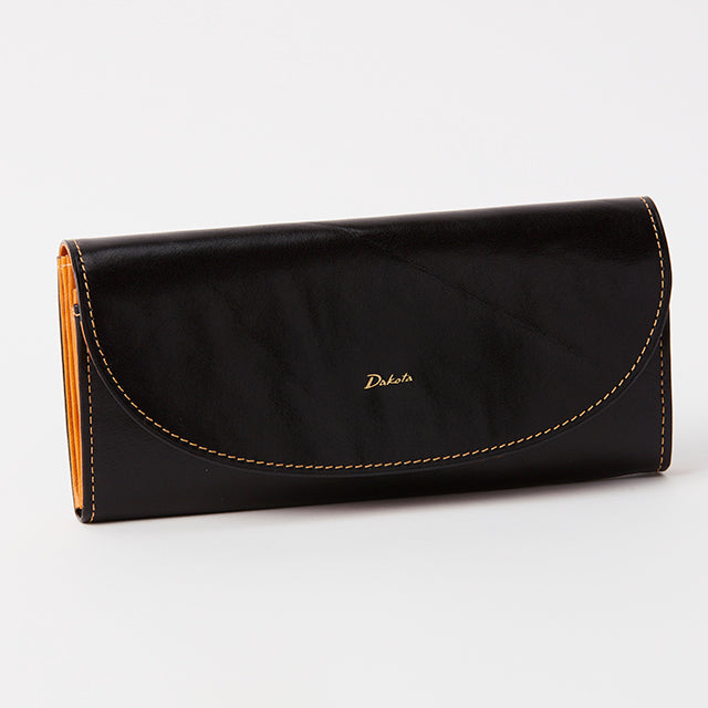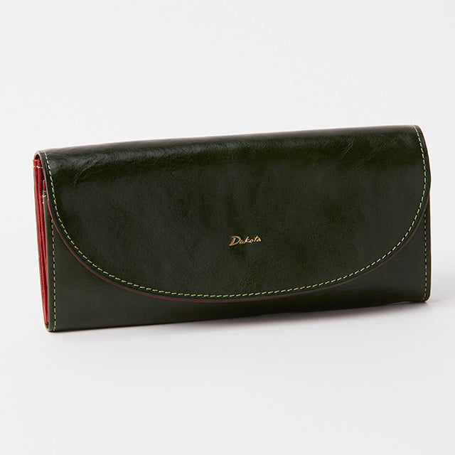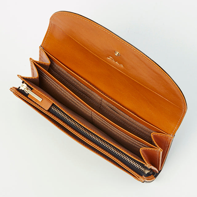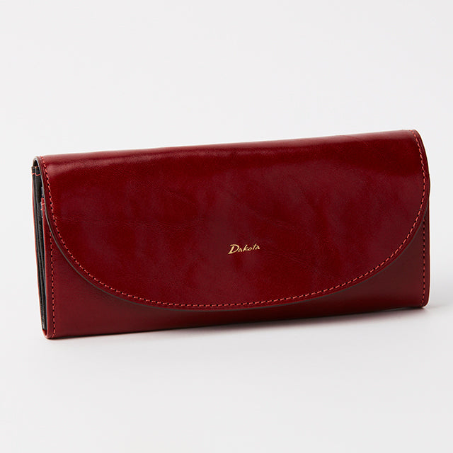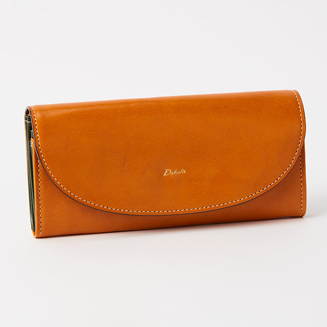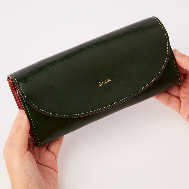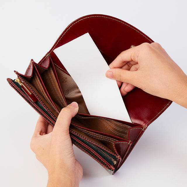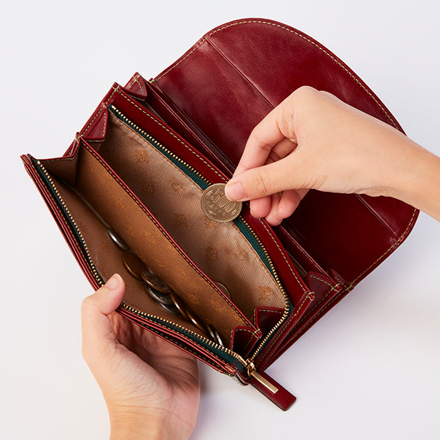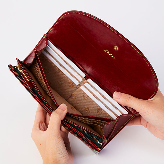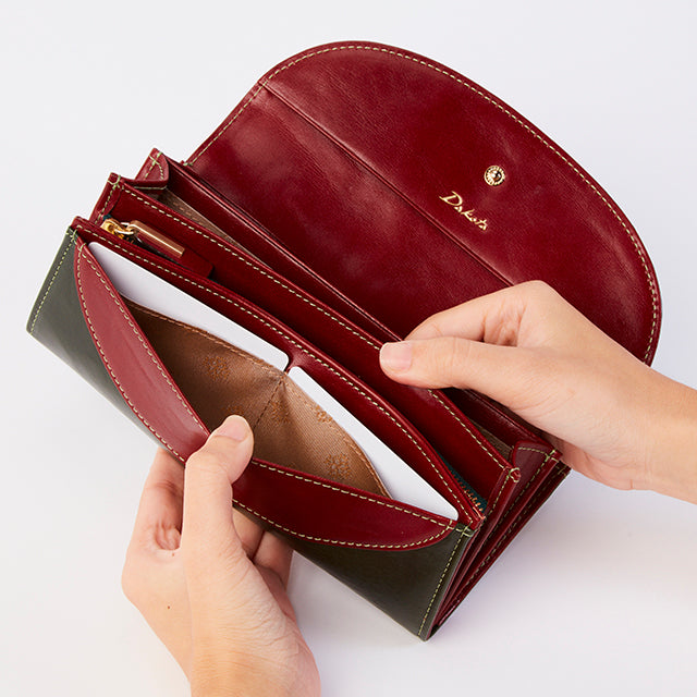 丸みのあるフラップが印象的な長財布です。お札入れスペースは、2箇所備わっており、小銭入れは、中が2つに仕切られています。背面ポケットは、中にカードが2枚収納できるので、すぐに取り出したいカードを入れておくのにも便利です。