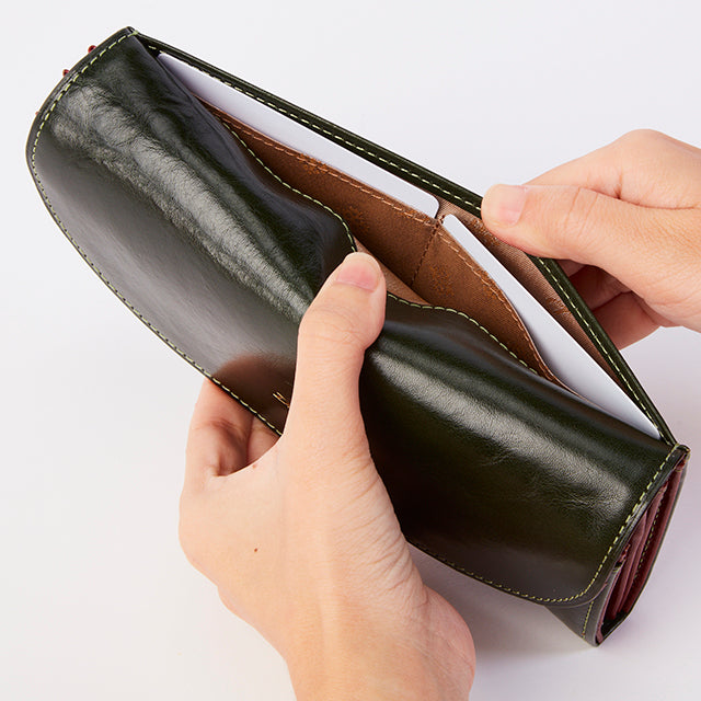 ショルダー革の天然シボなど、革そのものの美しさを存分に味わっていただくため、デザインは極力シンプルに仕上げました。丸みを帯びた特徴的なフォルムや、内装とのカラーコンビでアクセントを効かせた、モダンなお財布シリーズです。