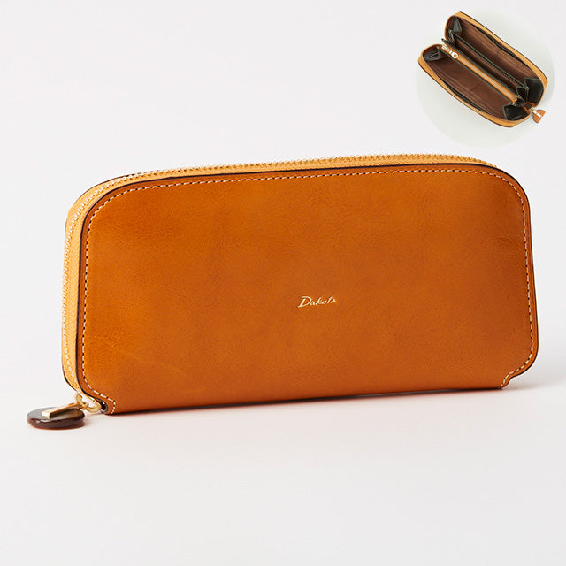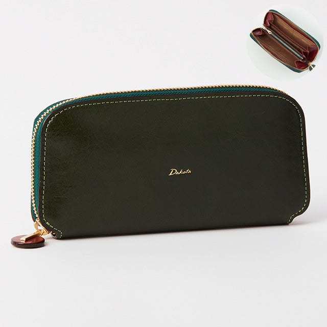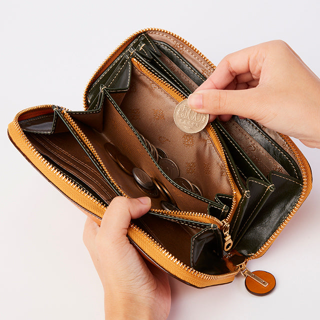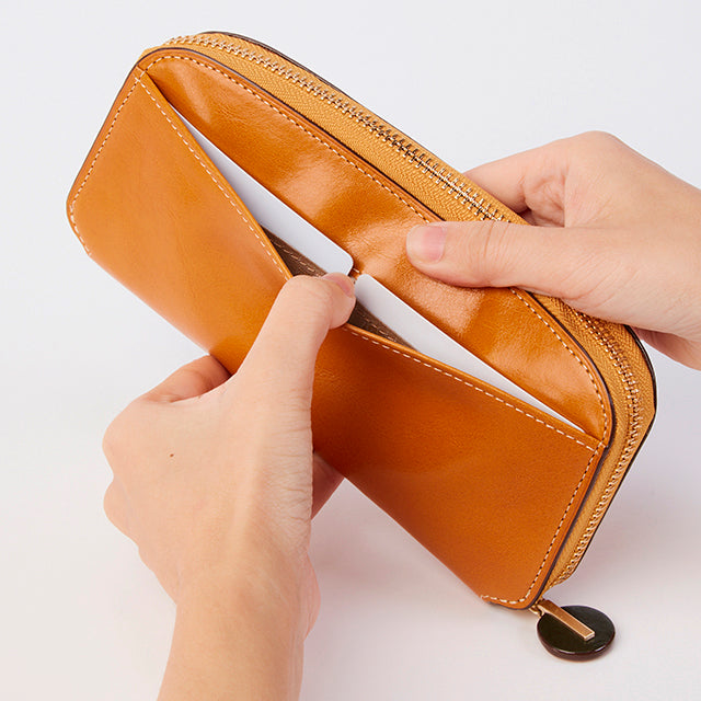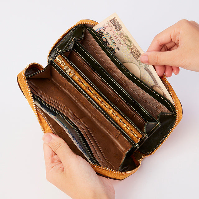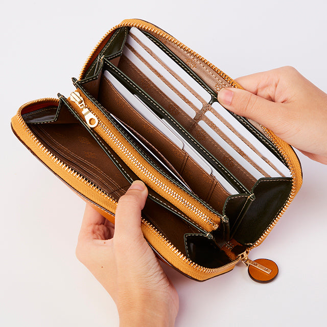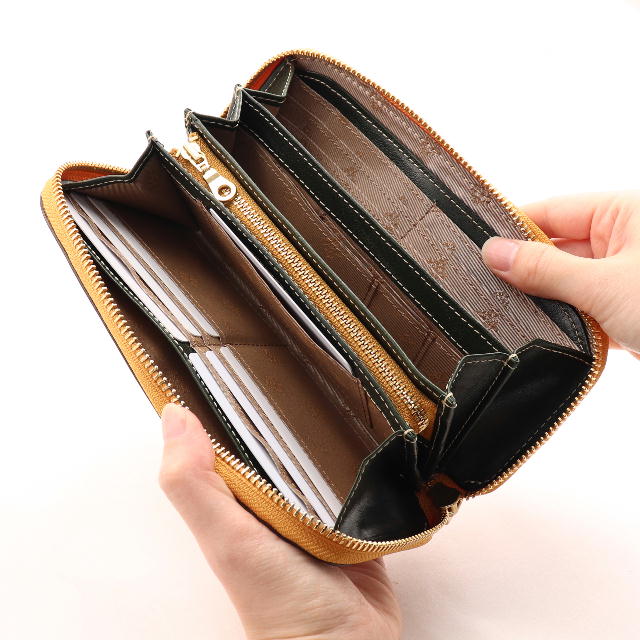 丸みを持たせたフォルムと、丸い引手が魅力のラウンドファスナー長財布です。お札入れスペースは、3箇所備わっており、カードは、合計19枚入れることができるので、しっかりとした収納力があります。背面には、カードが2枚収納できるオープンポケット付き。