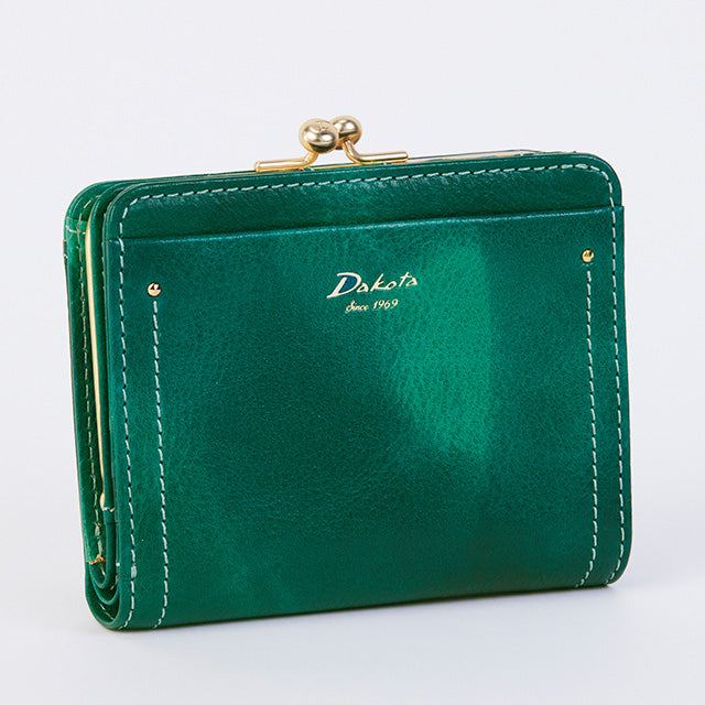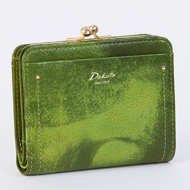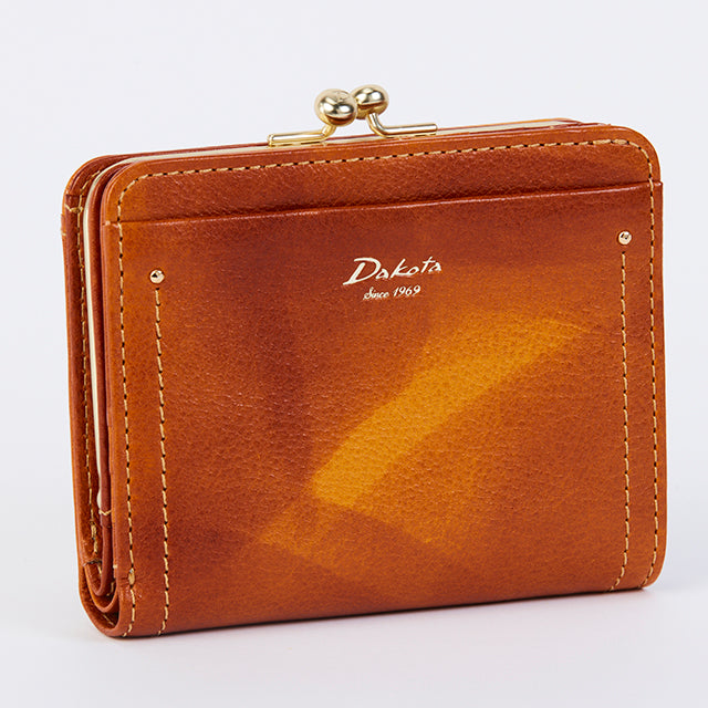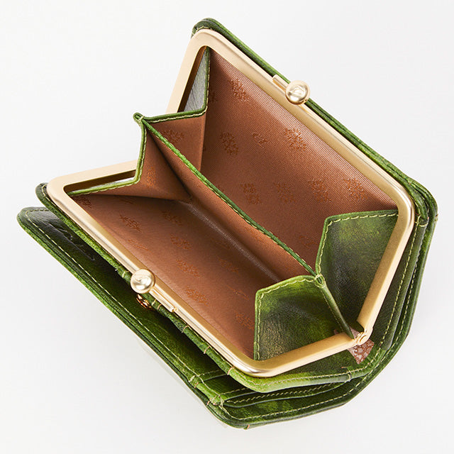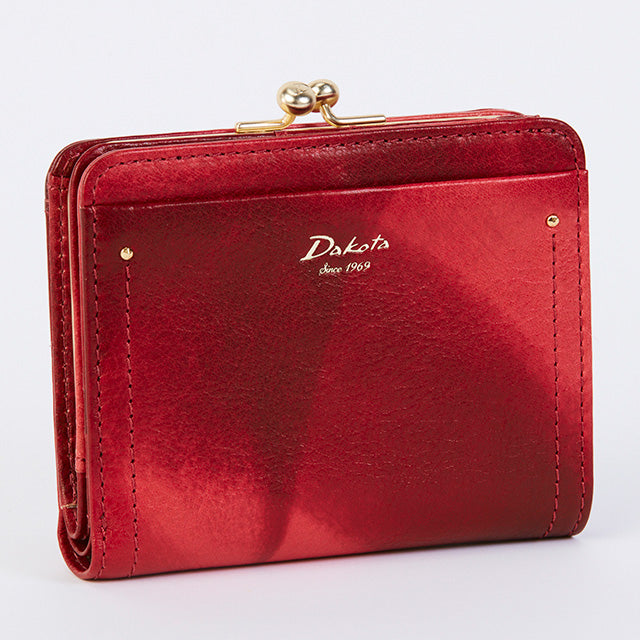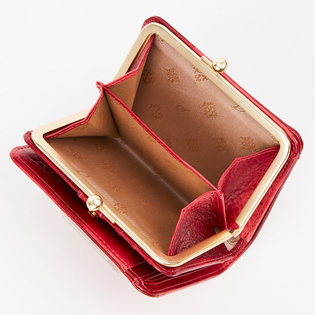 がま口デザインが可愛らしい二つ折り財布です。小銭入れは、出し入れのしやすいがま口タイプ。札入れには仕切りがあり、カードは6枚収納できます。