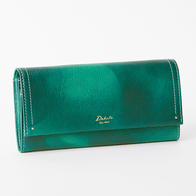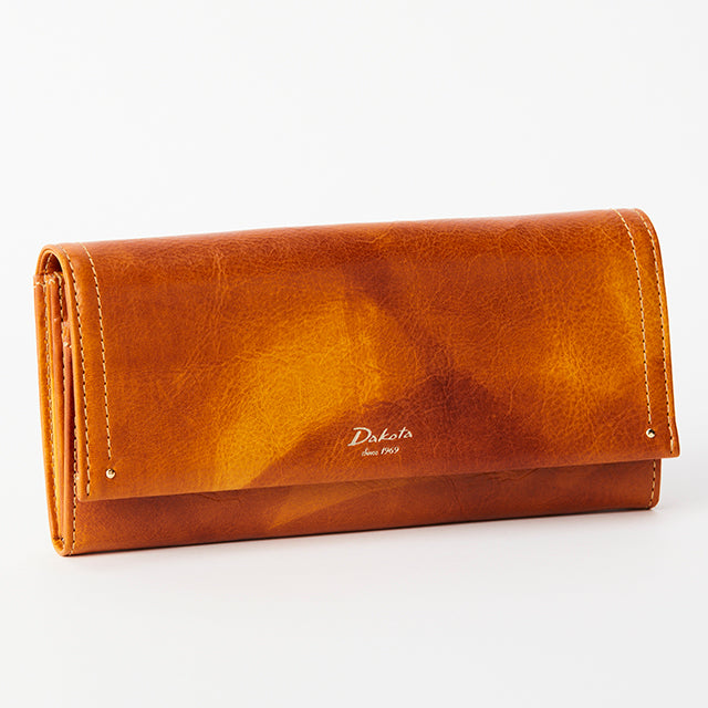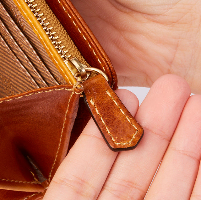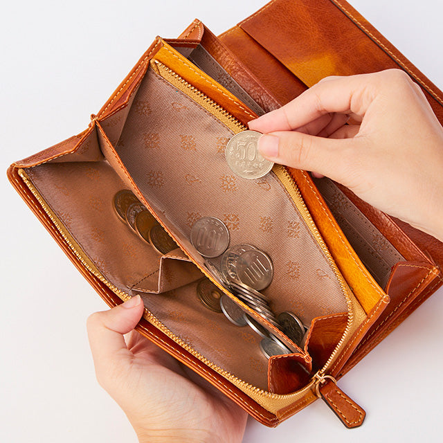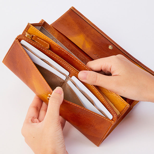 ベーシックなかぶせデザインの長財布。大きく開く札入れスペースが2つあります。L字ファスナー式の小銭入れは、3つに仕切られているので、整理整頓がしやすいです。カードはたっぷり22枚収納可能です。