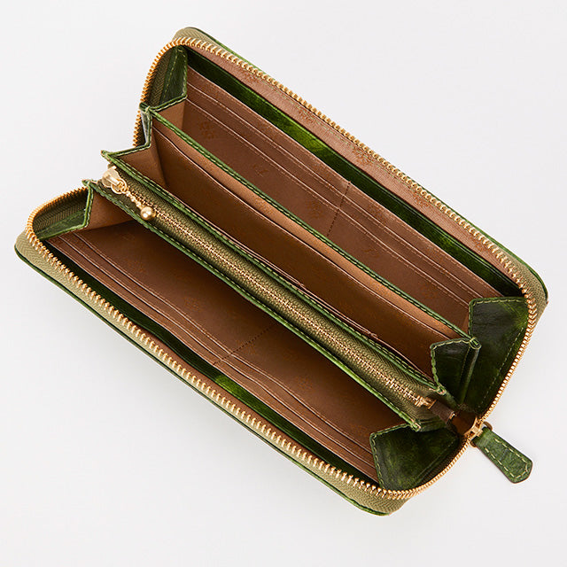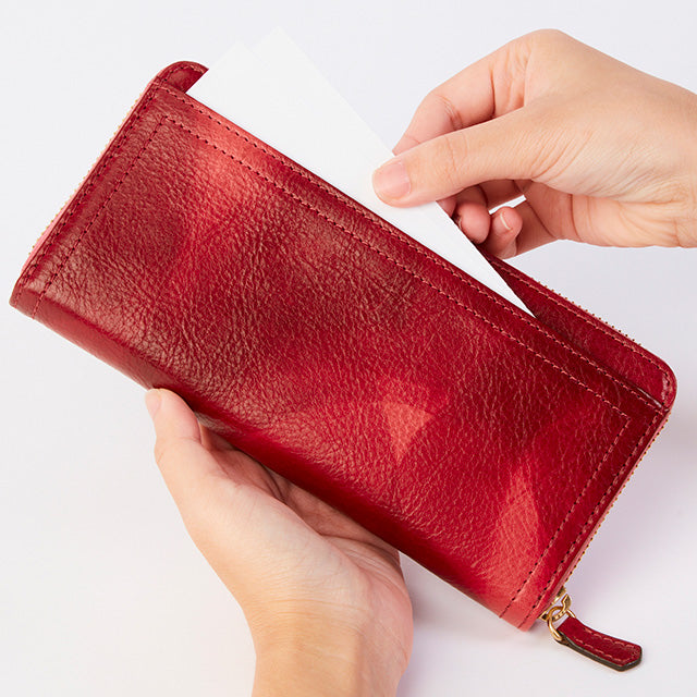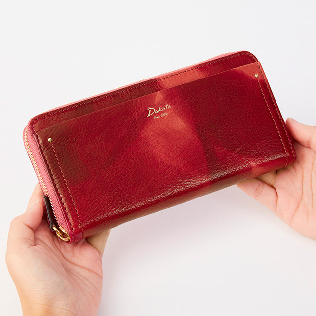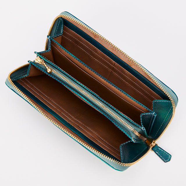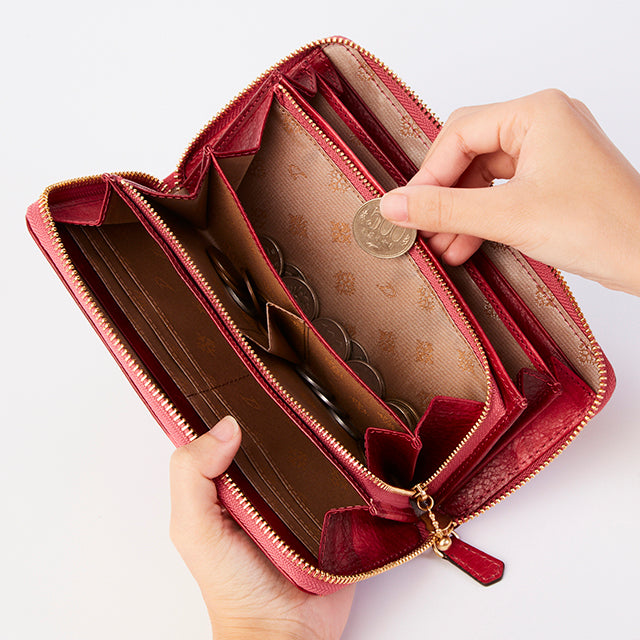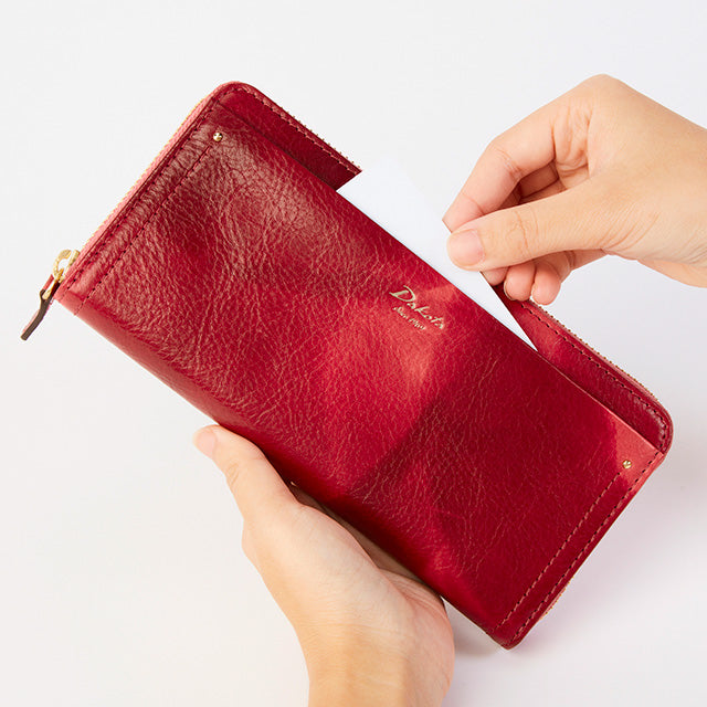 ラウンドファスナータイプの長財布。札入れスペースは3つあり、整理整頓がしやすい造り。ファスナー収納がL字型ファスナーなので大きく開き、小銭の出し入れがスムーズにできます。前後にオープンポケットがあるので、レシート等の収納に便利です。