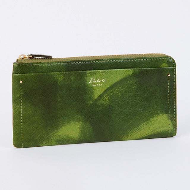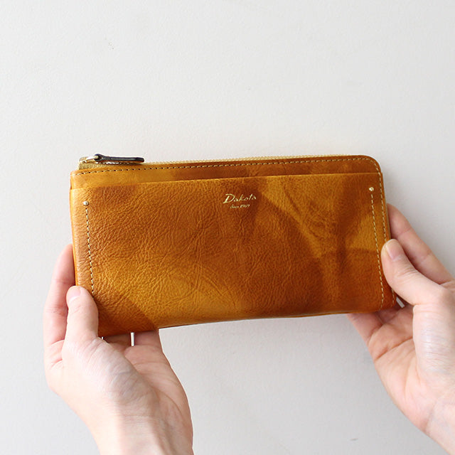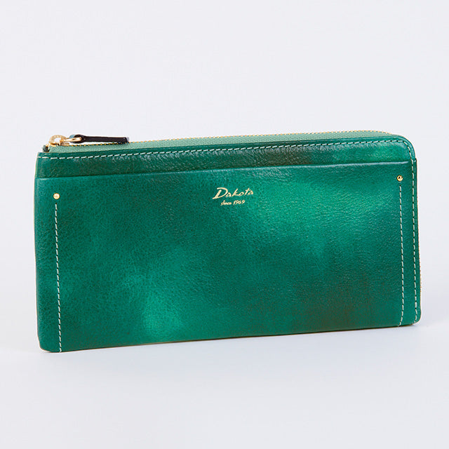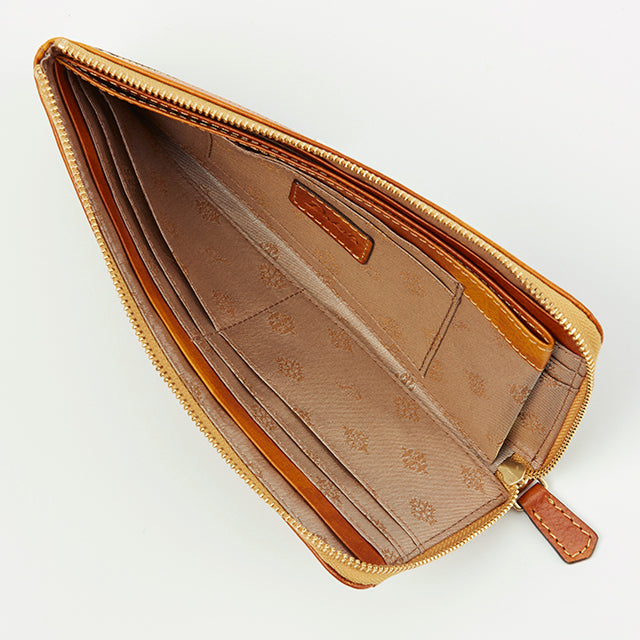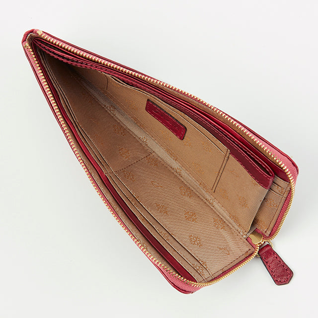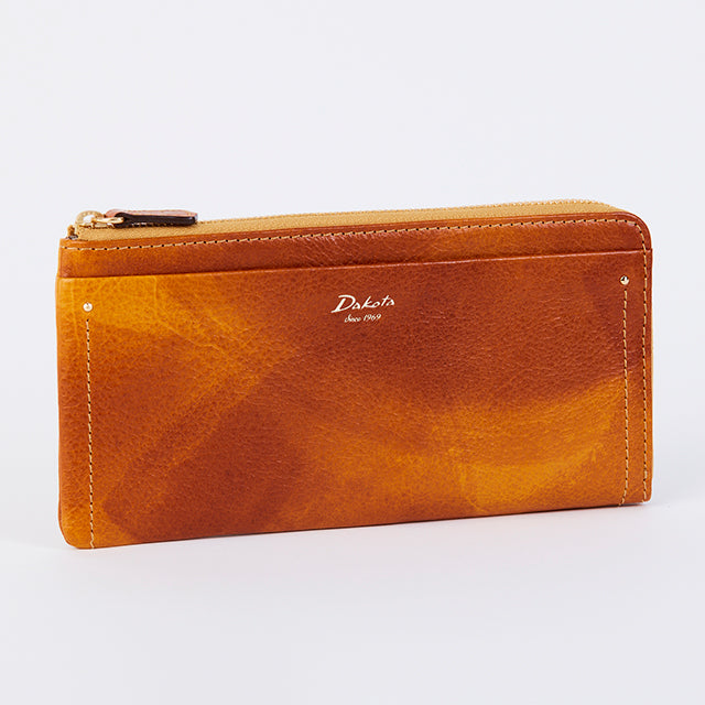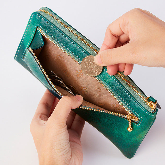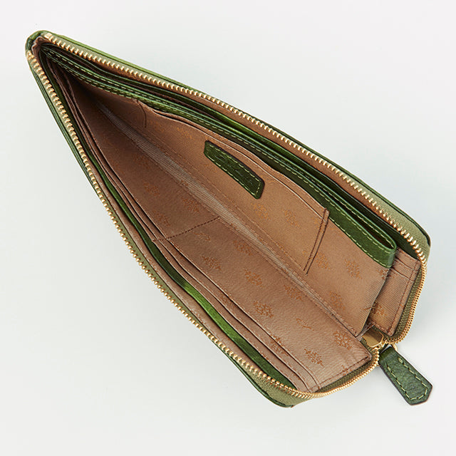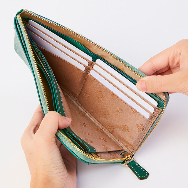 マチの無いスリムなL字ファスナー長財布です。内側の小銭入れスペースがファスナーレスなので、ワンアクションでお札も小銭もカードも一目瞭然な、機能的なデザインです。