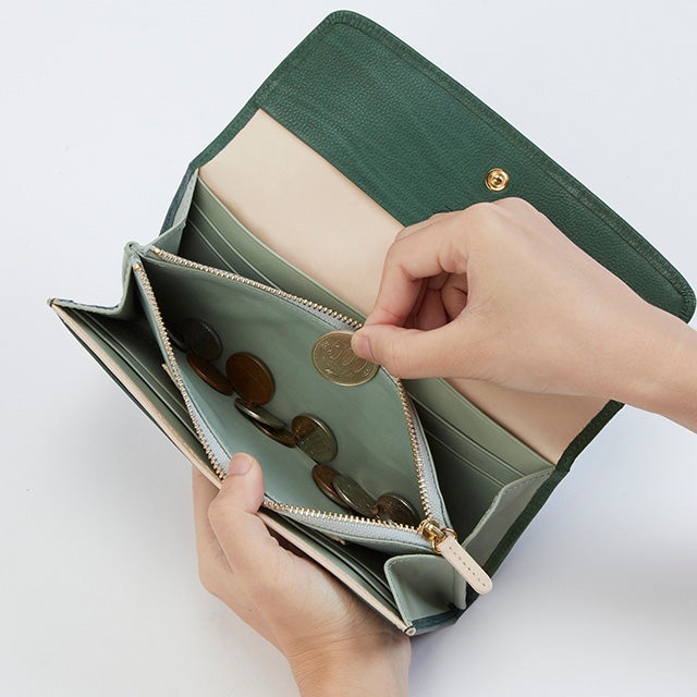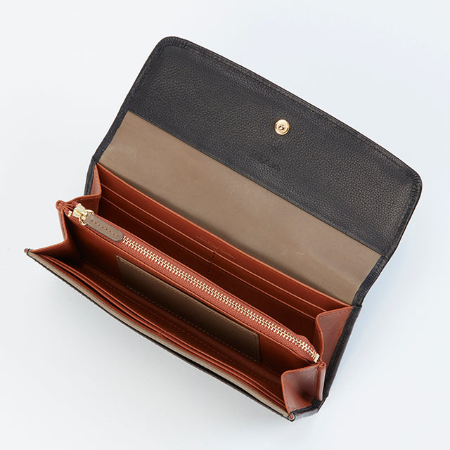 フラップタイプの長財布です。メイン収納は2か所あり、L字ファスナータイプの小銭入れは、片マチ付きのスリムなデザイン。カードは全体で13枚収納できるシンプル設計です。