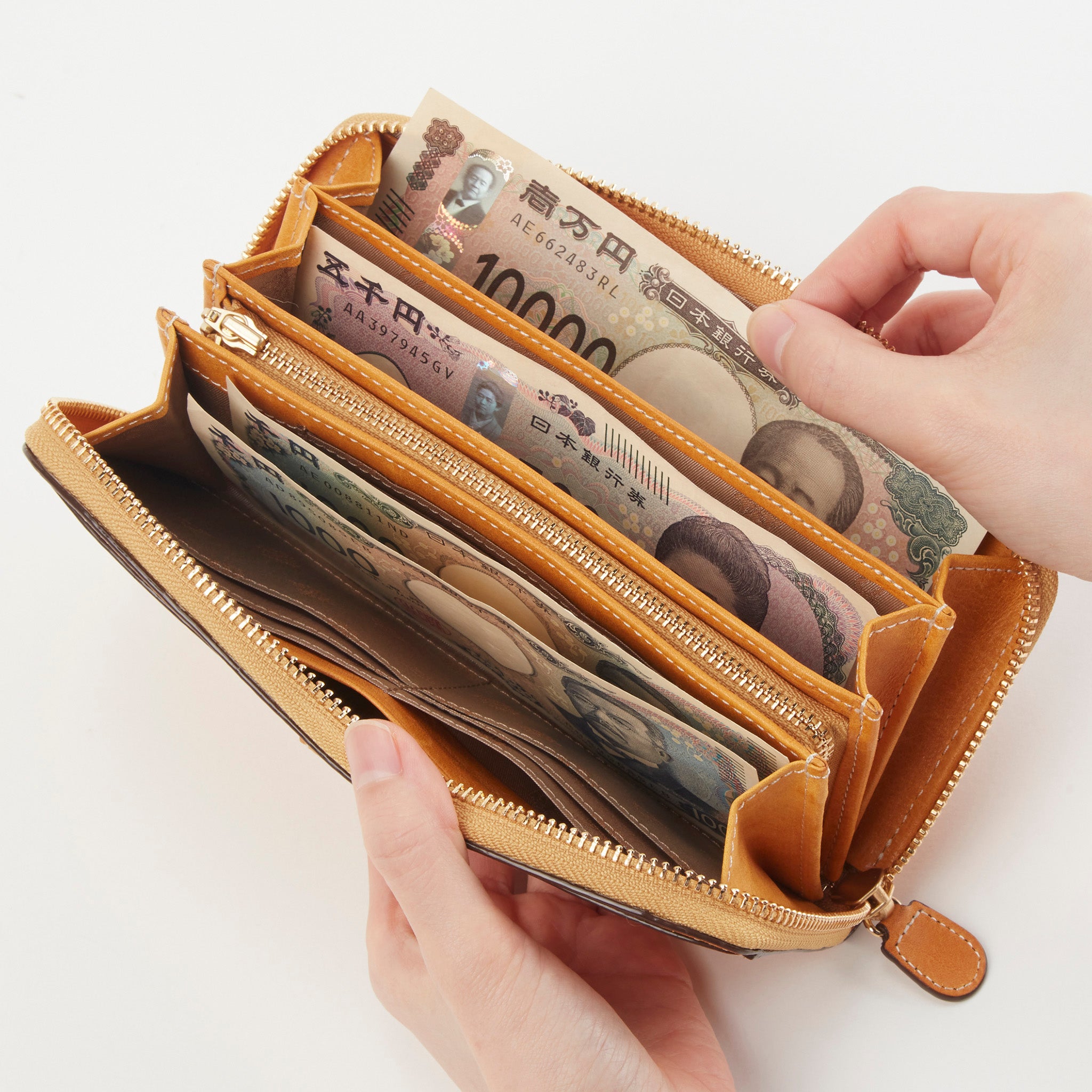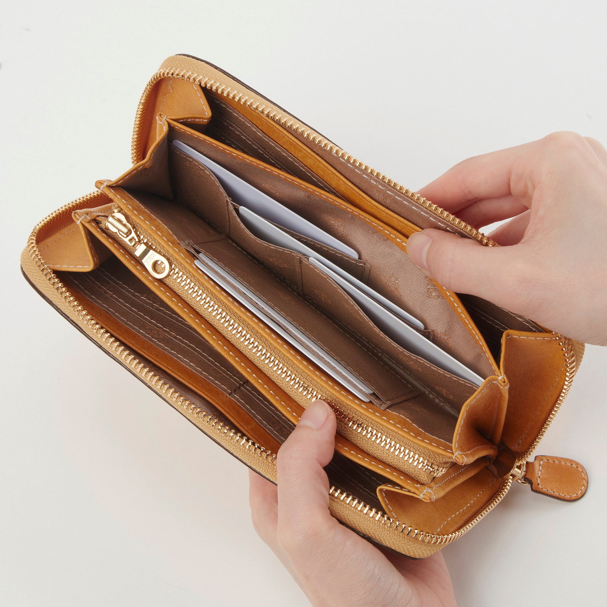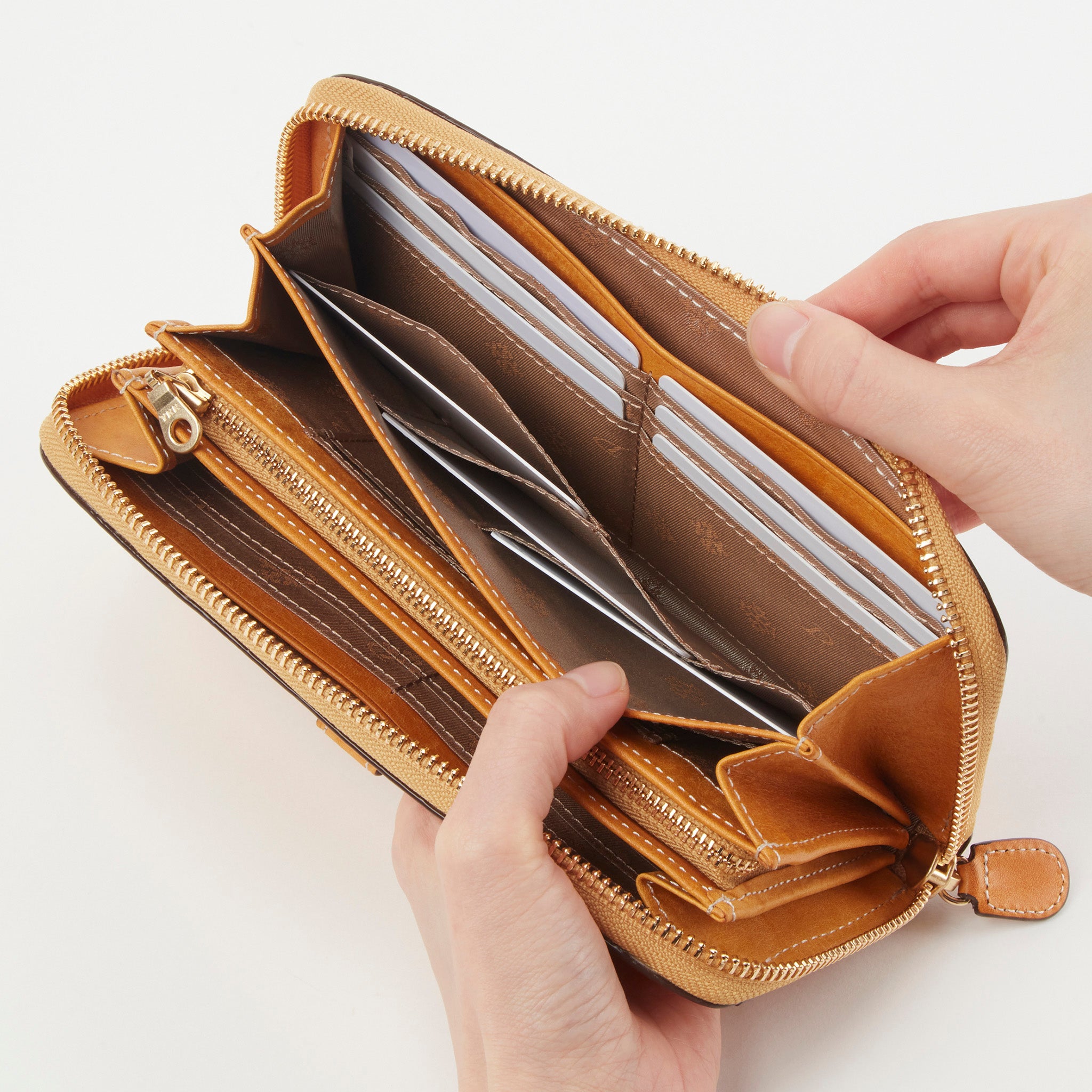 緩い弧を描くフォルムがやさしい印象の、ラウンドファスナータイプの長財布。内側のファスナー収納はL字型に大きく開き、小銭の出し入れがスムーズにできます。カードが22枚収納できる大容量で、機能的な作りです。