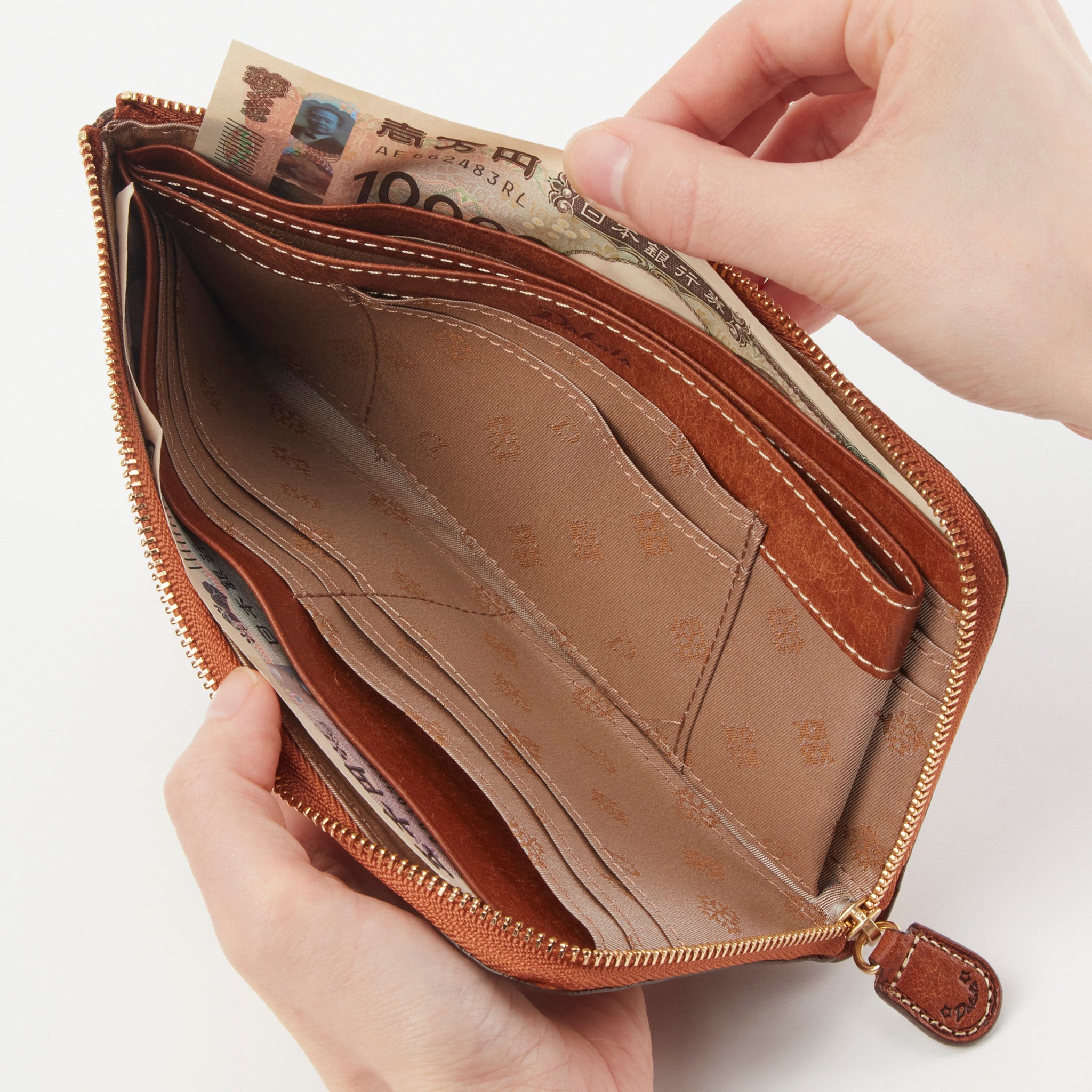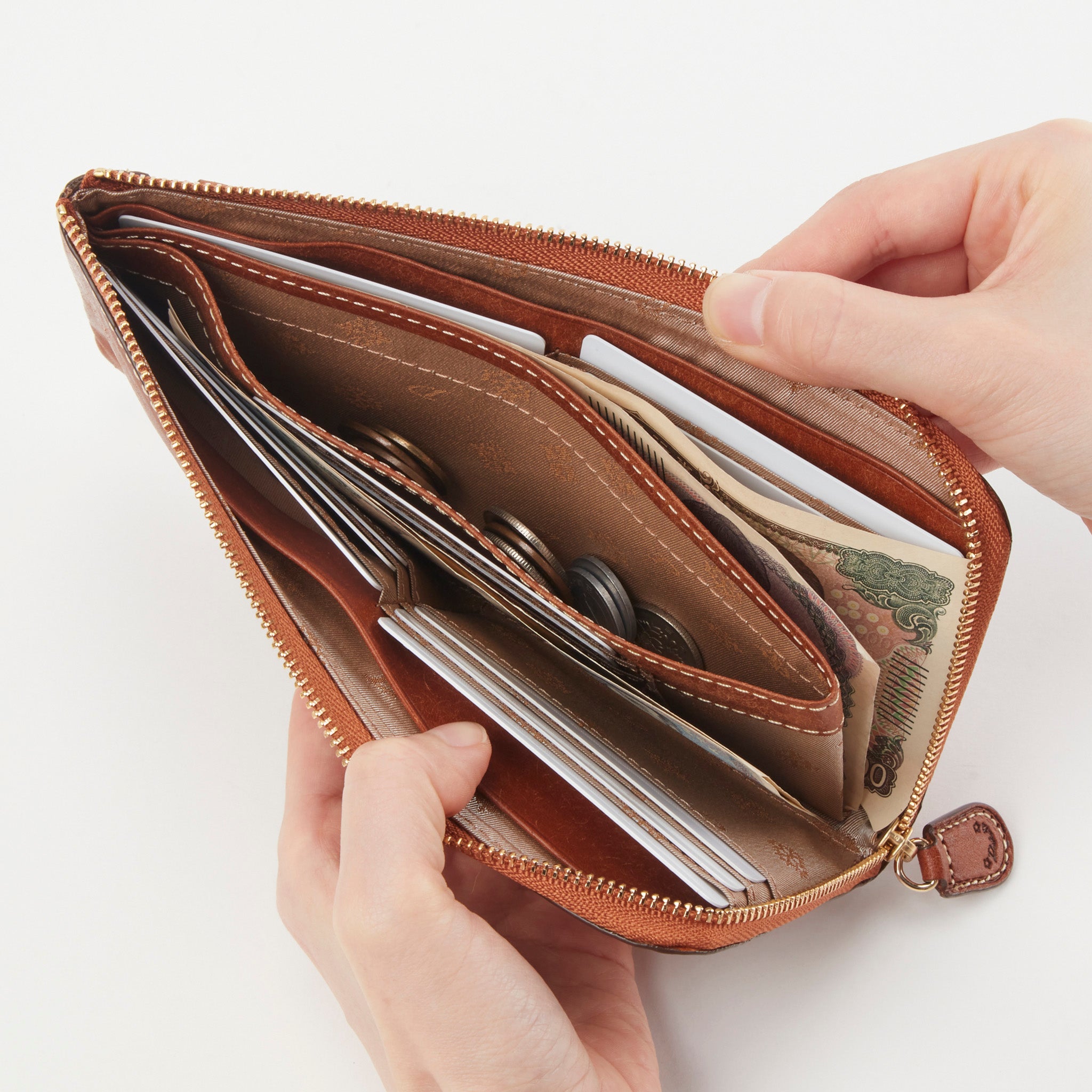 中央にあしらわれた馬蹄と星のモチーフが印象的な、薄マチ長財布。内側の小銭入れはファスナーレスになっているので、メインファスナーを開けば、お札もカードも小銭もパッと一目で見渡せる、スマートな機能性が人気のデザインです。背面にファスナーポケットがあるので、そこに小銭を収納することもできます。