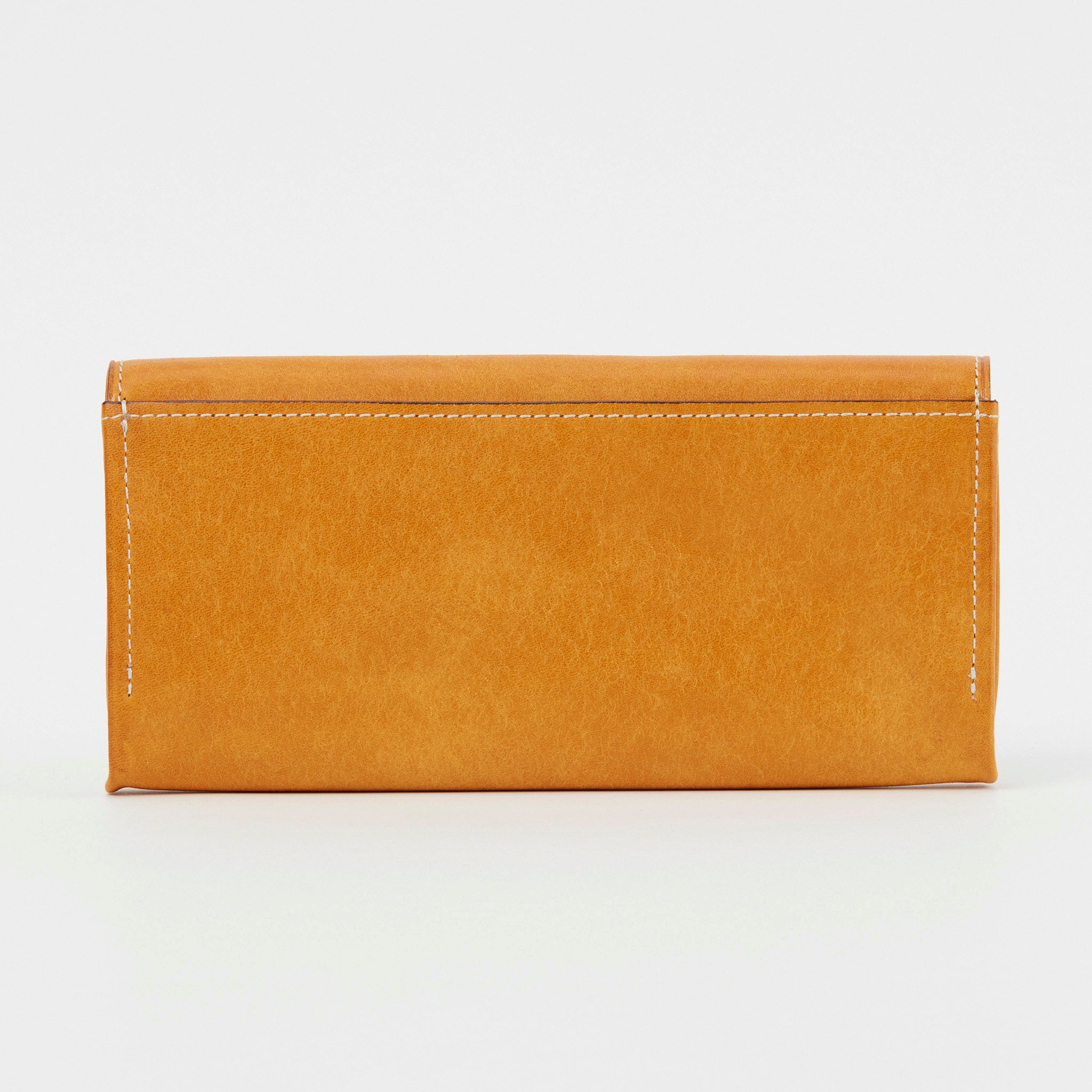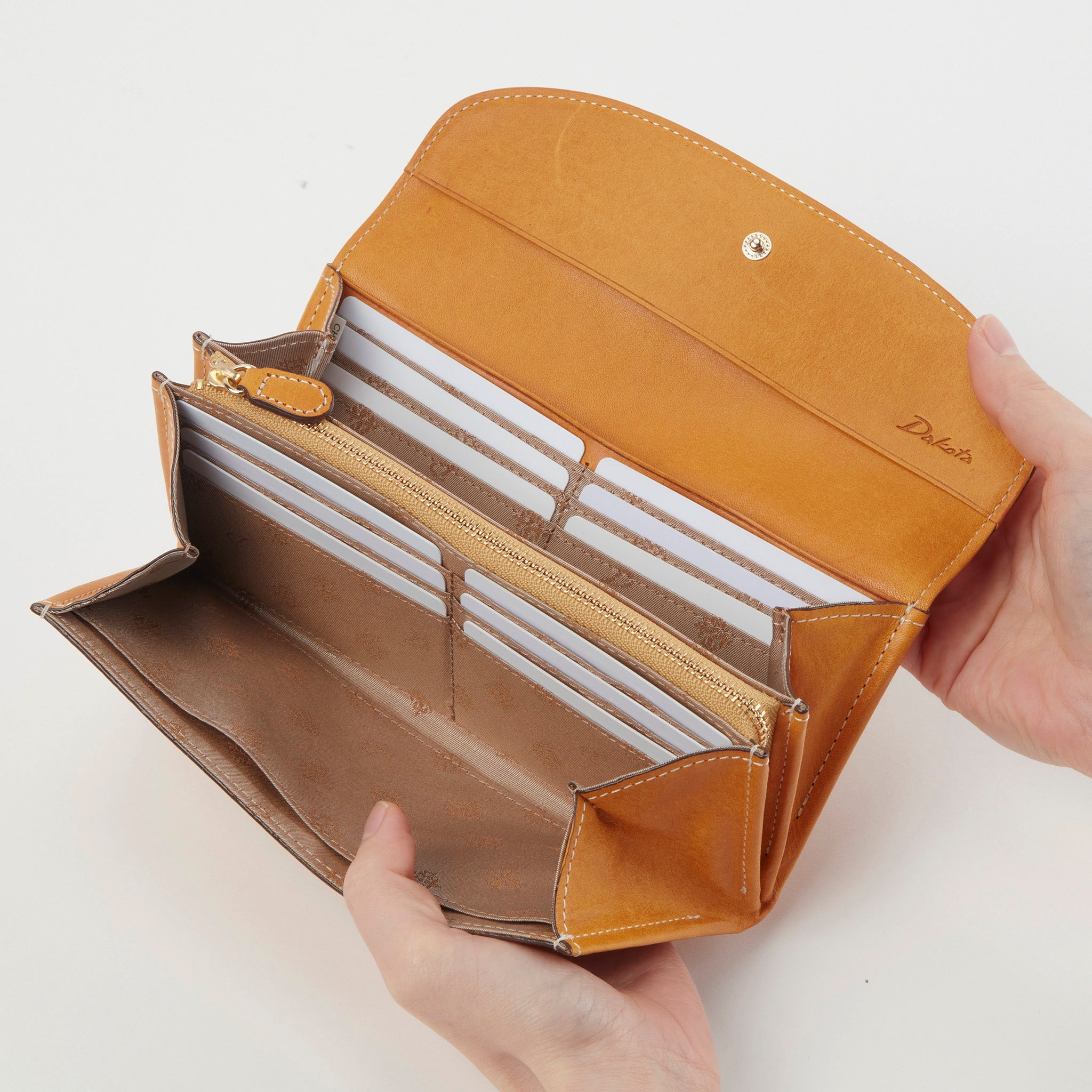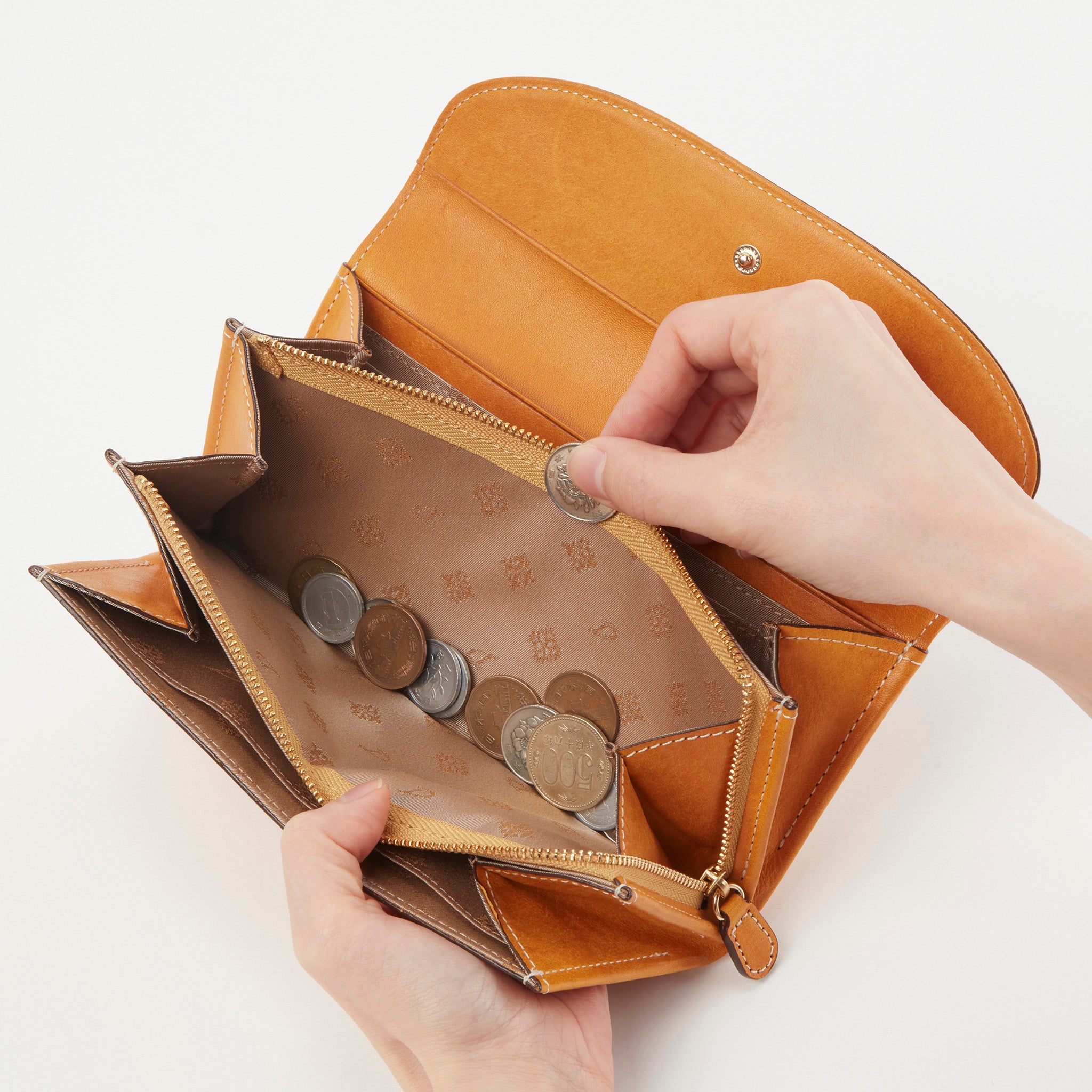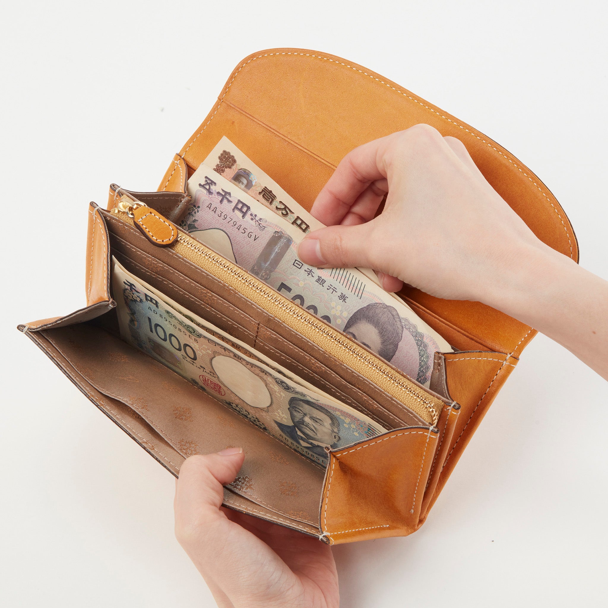 スリムな作りの、フラップ式長財布。大きく開くオープンスペースが特徴です。ファスナー収納はスリムながらもL字型になっているので開きやすく、小銭の出し入れがラクラクできます。