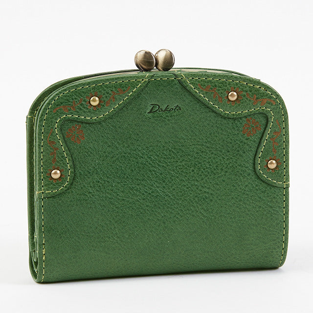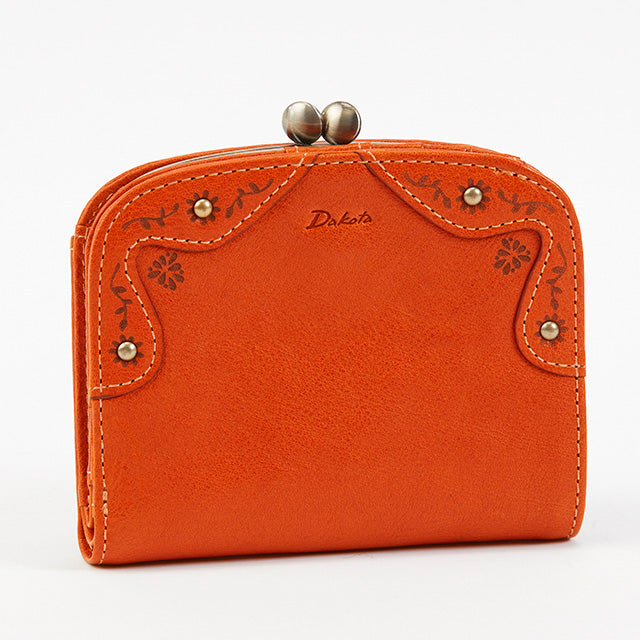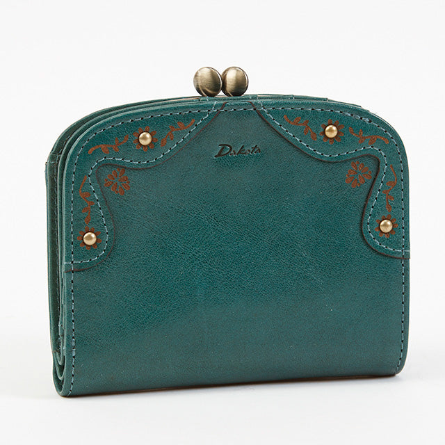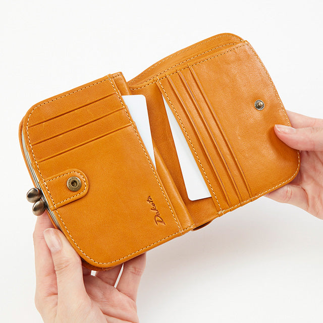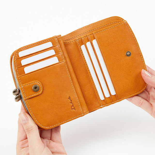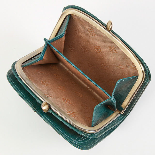 アンティーク感のあるがま口金具と平たく特徴的なつまみ金具が印象的な二つ折り財布です。がま口開閉の小銭入れは、パチンとワンアクションで開閉が出来るので、お会計もスマートにこなせます。