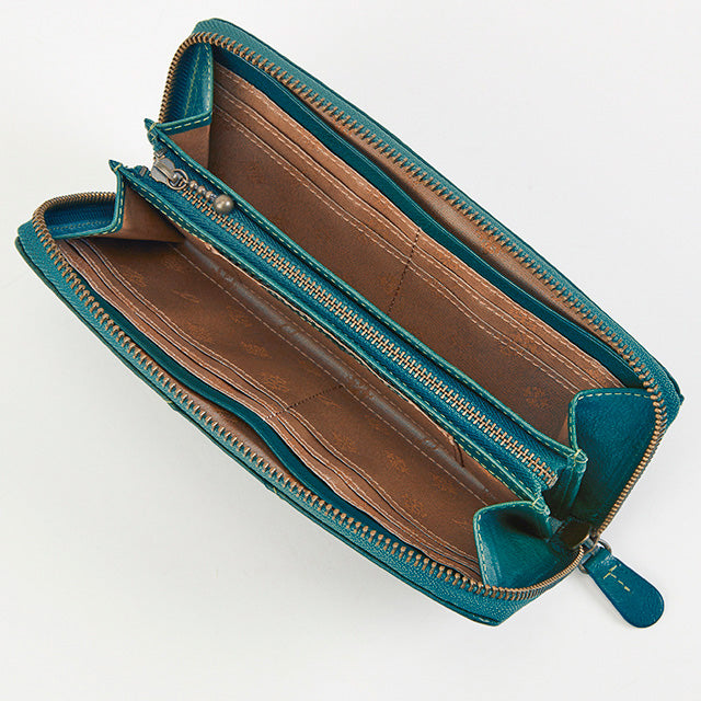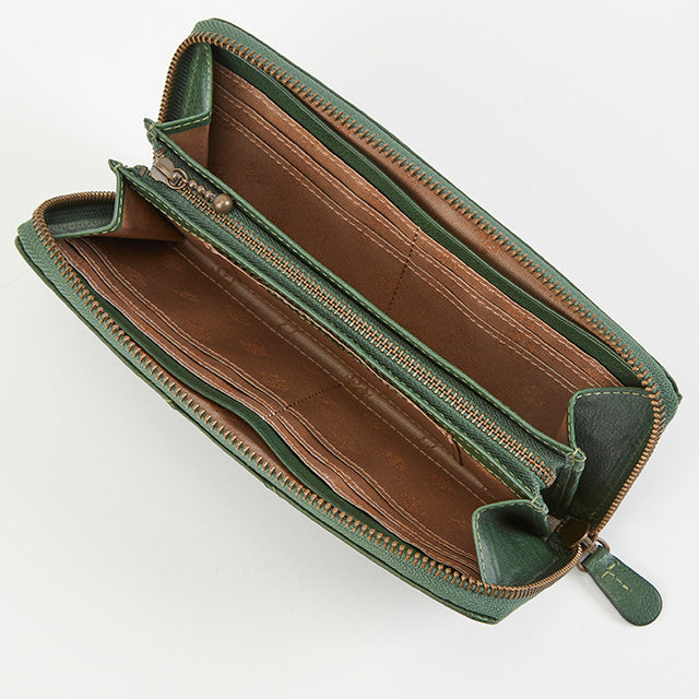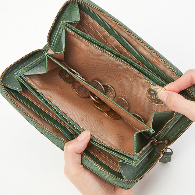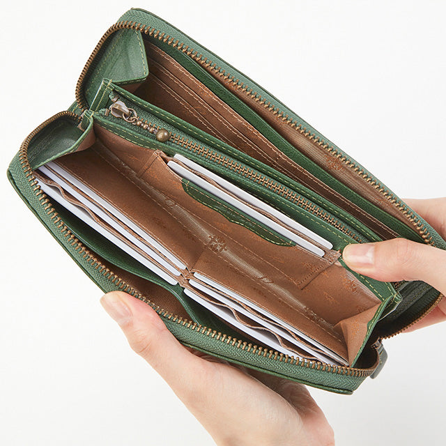 たっぷりと収納が出来るラウンドファスナー長財布です。小銭入れを挟んで左右に札入れ収納スペースがあります。自分用と家族用で分けたり、紙幣とレシートで収納を分けたり、シンプルながらも様々な使い方ができます。カードは18枚収納可能です。