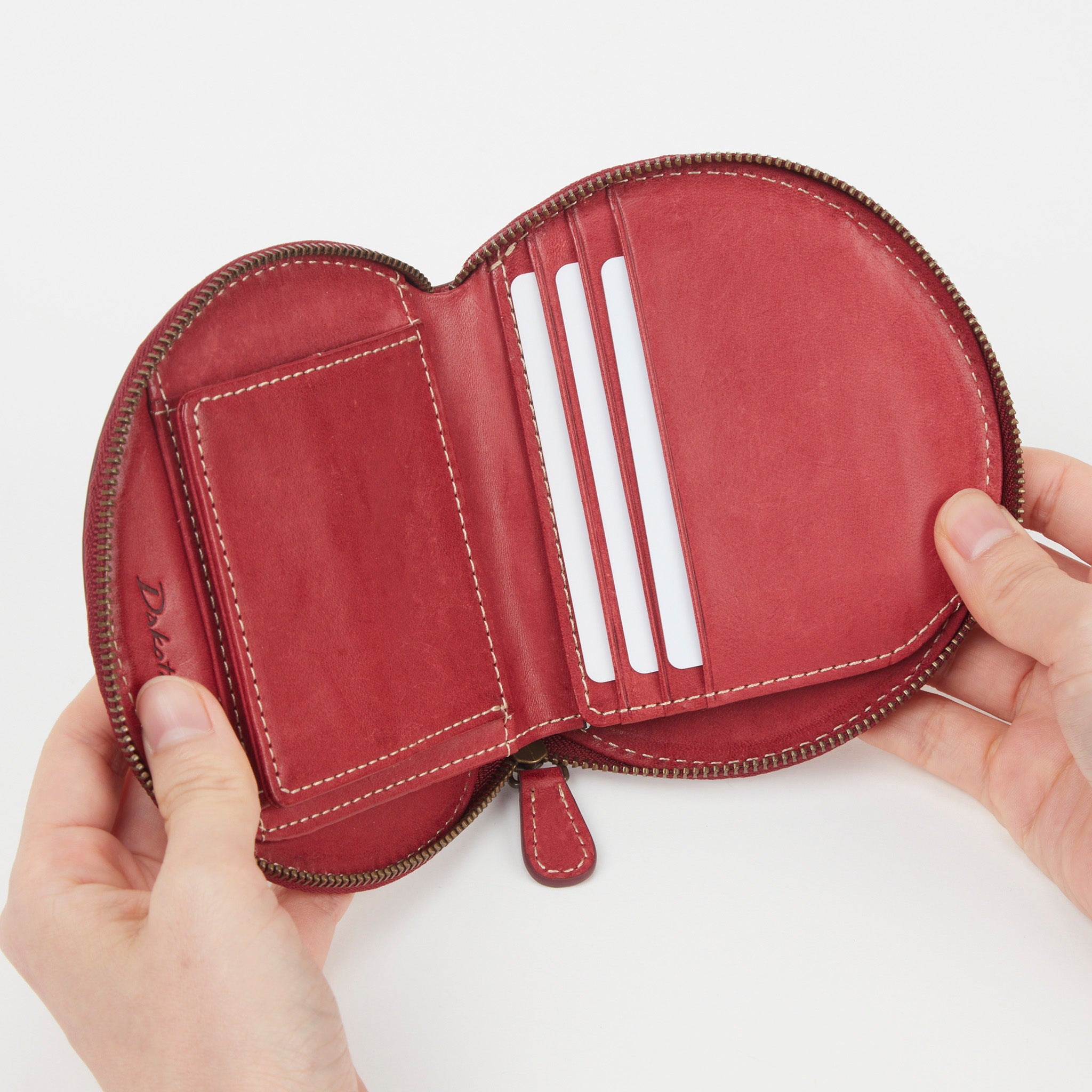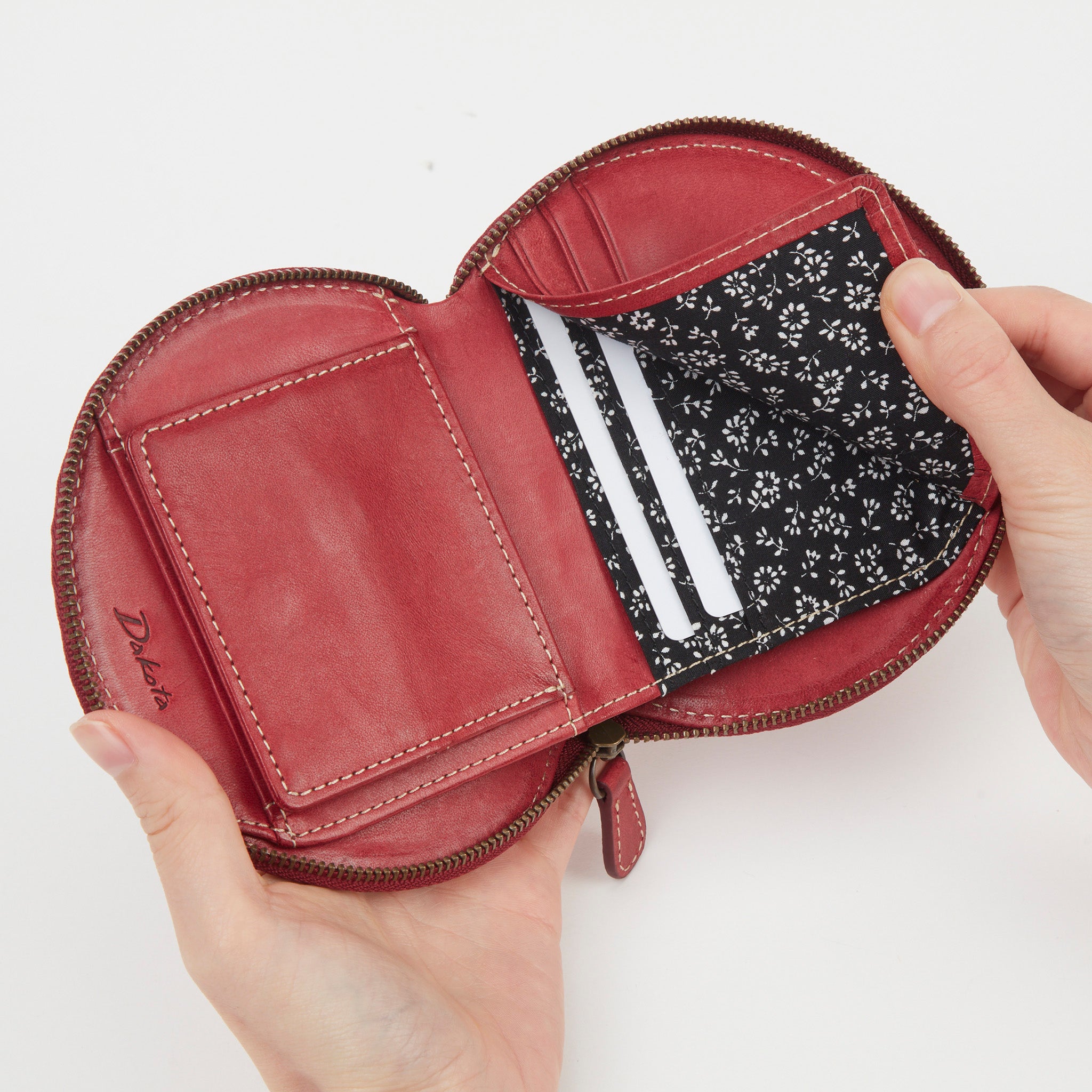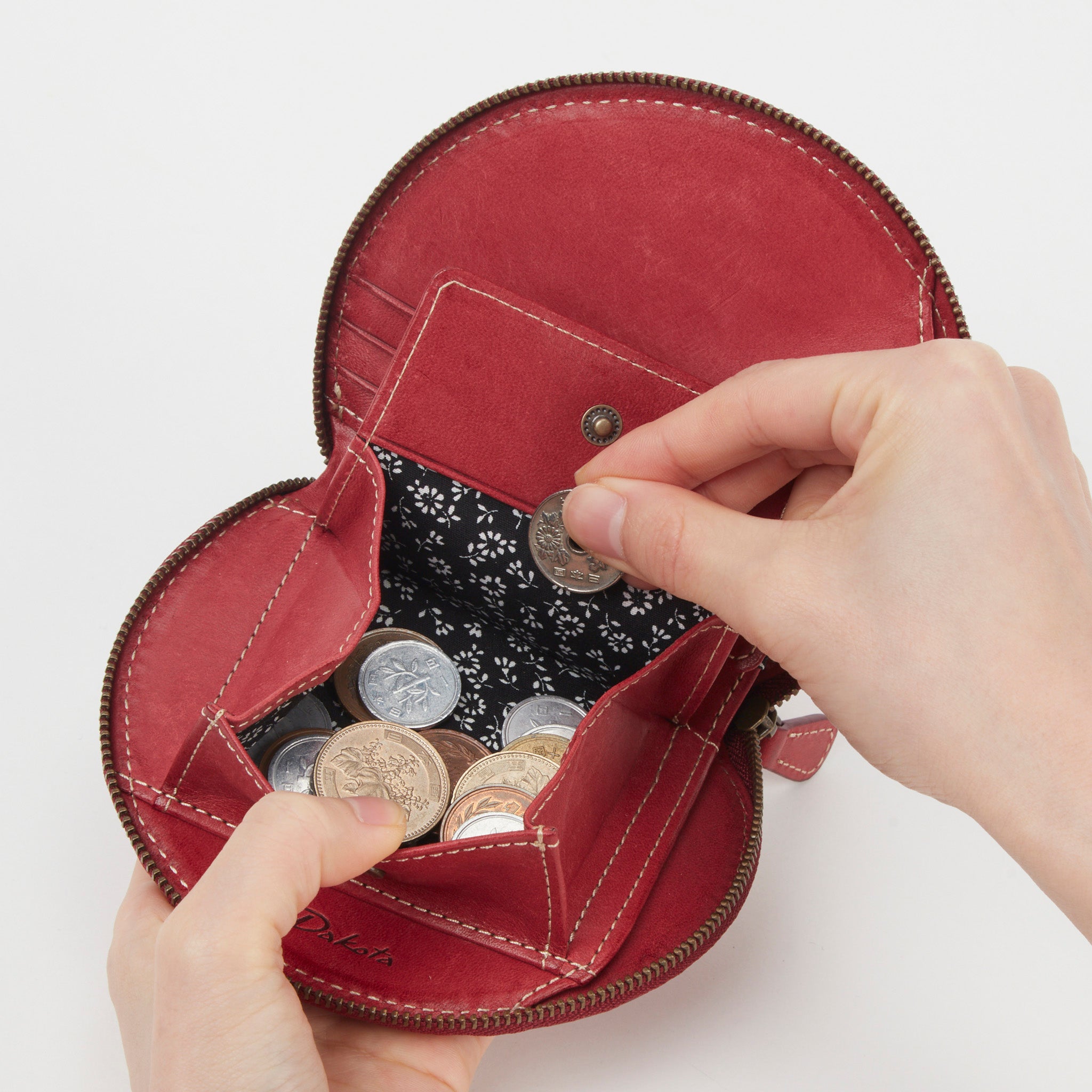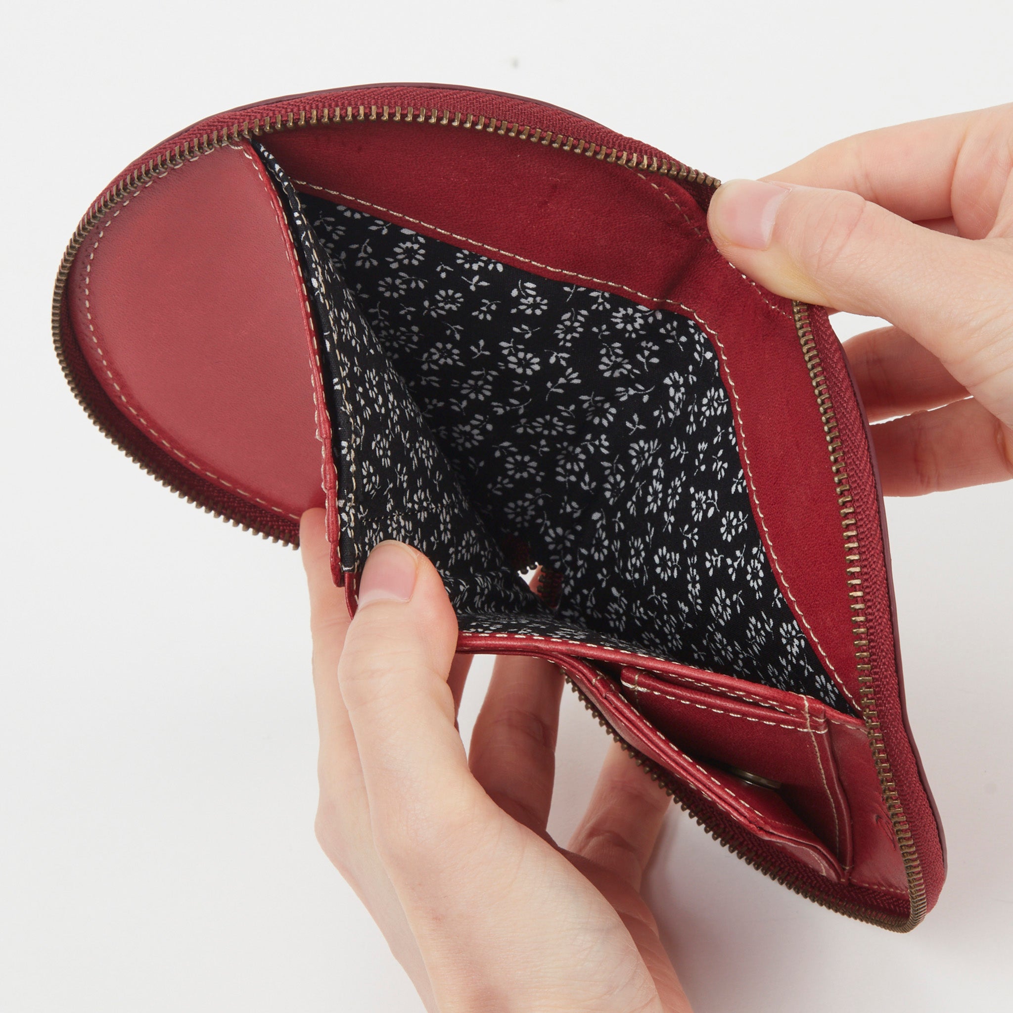 曲線美が魅力のラウンドファスナータイプの二つ折り財布です。シンプルな見た目ですが、カードは5枚収納出来、札入れスペースも大きく開きます。小銭入れは、小さいながらもbox型で出し入れがしやすい作りです。