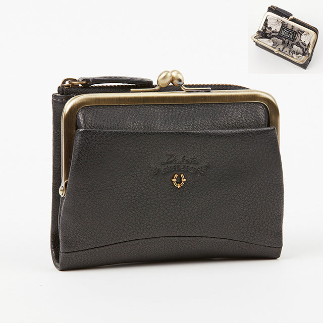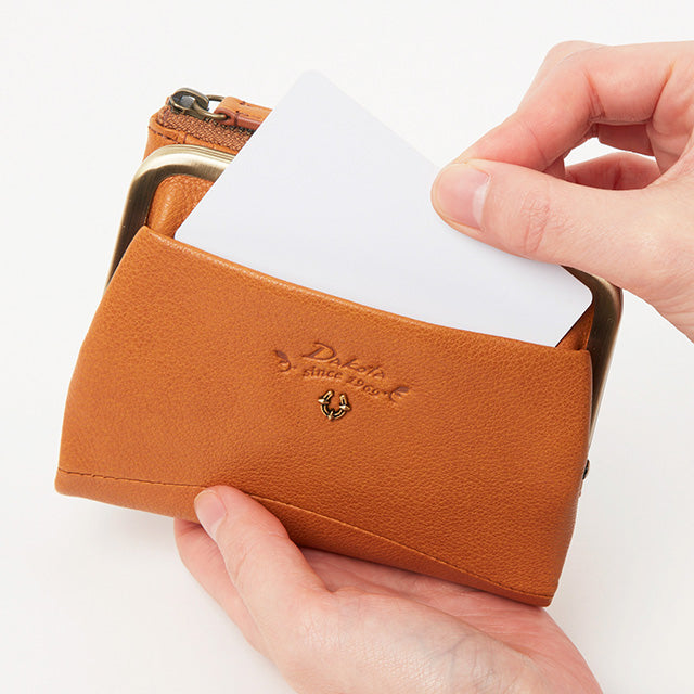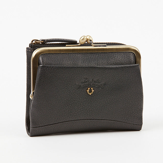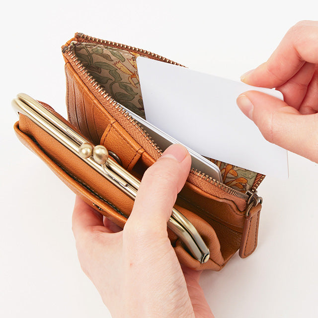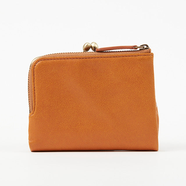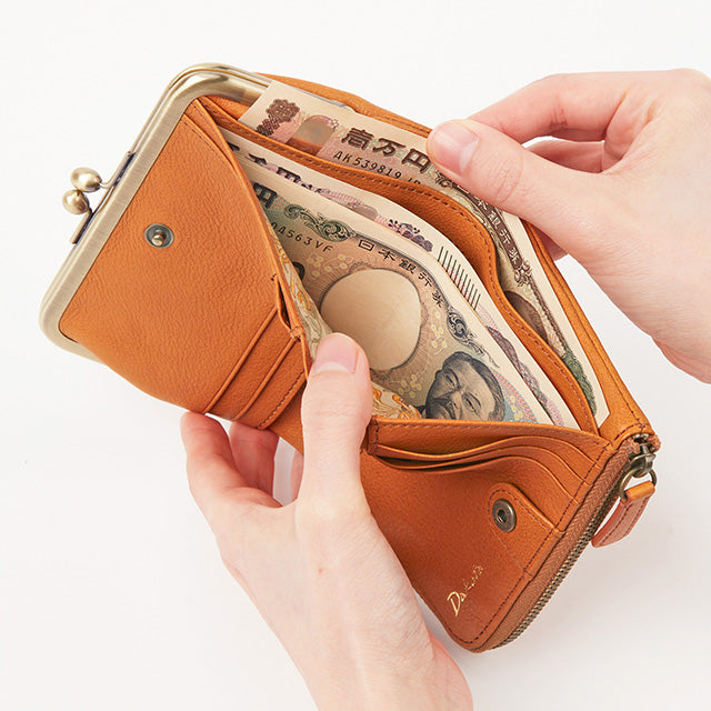 ふっくらとしたフォルムがかわいい、がま口デザインの二つ折り財布です。がま口は大きく開き、小銭の出し入れがしやすいつくりになっています。また、背面側にある、L字ファスナー収納にはカードをまとめて入れることができ、見た目以上にたっぷりと収納できます。