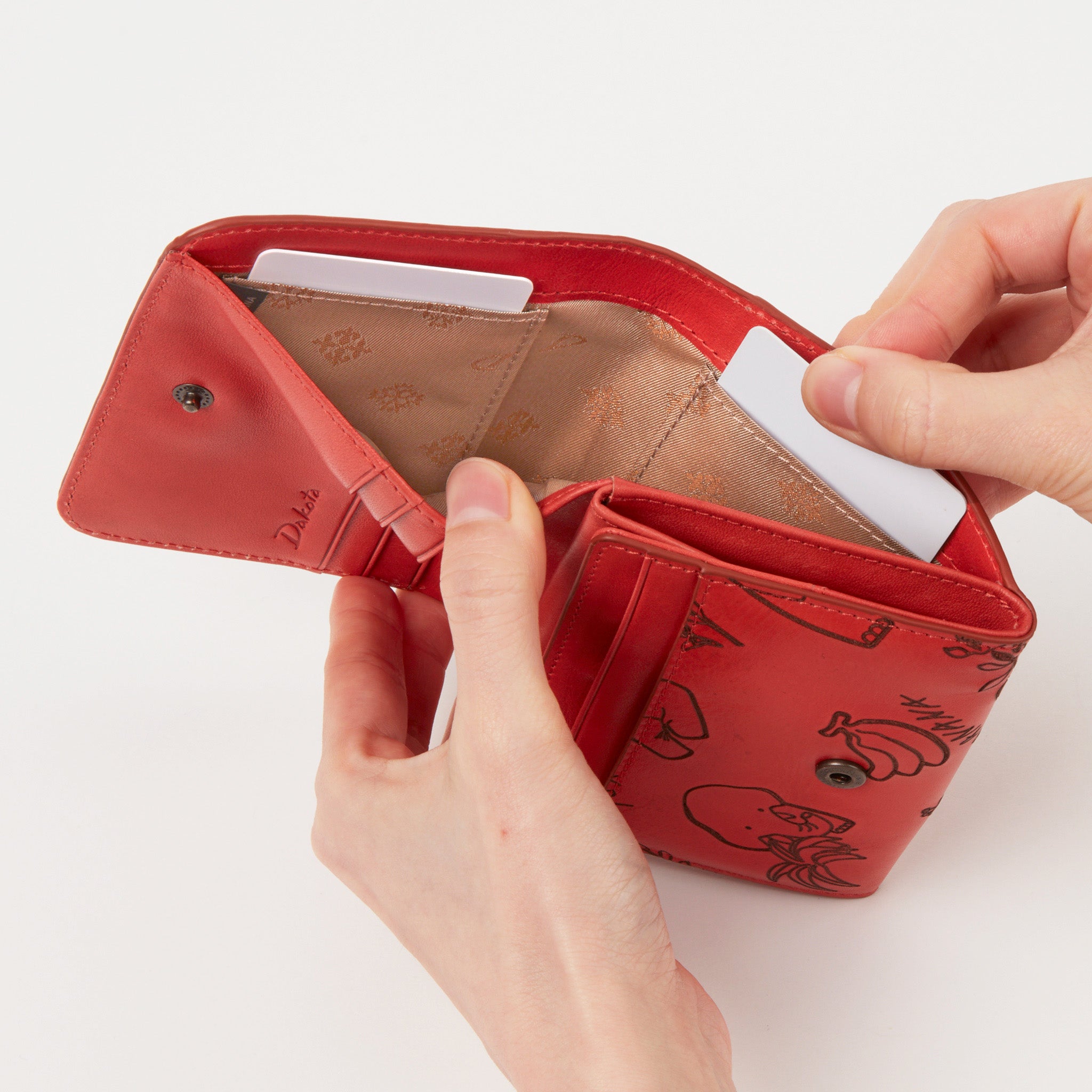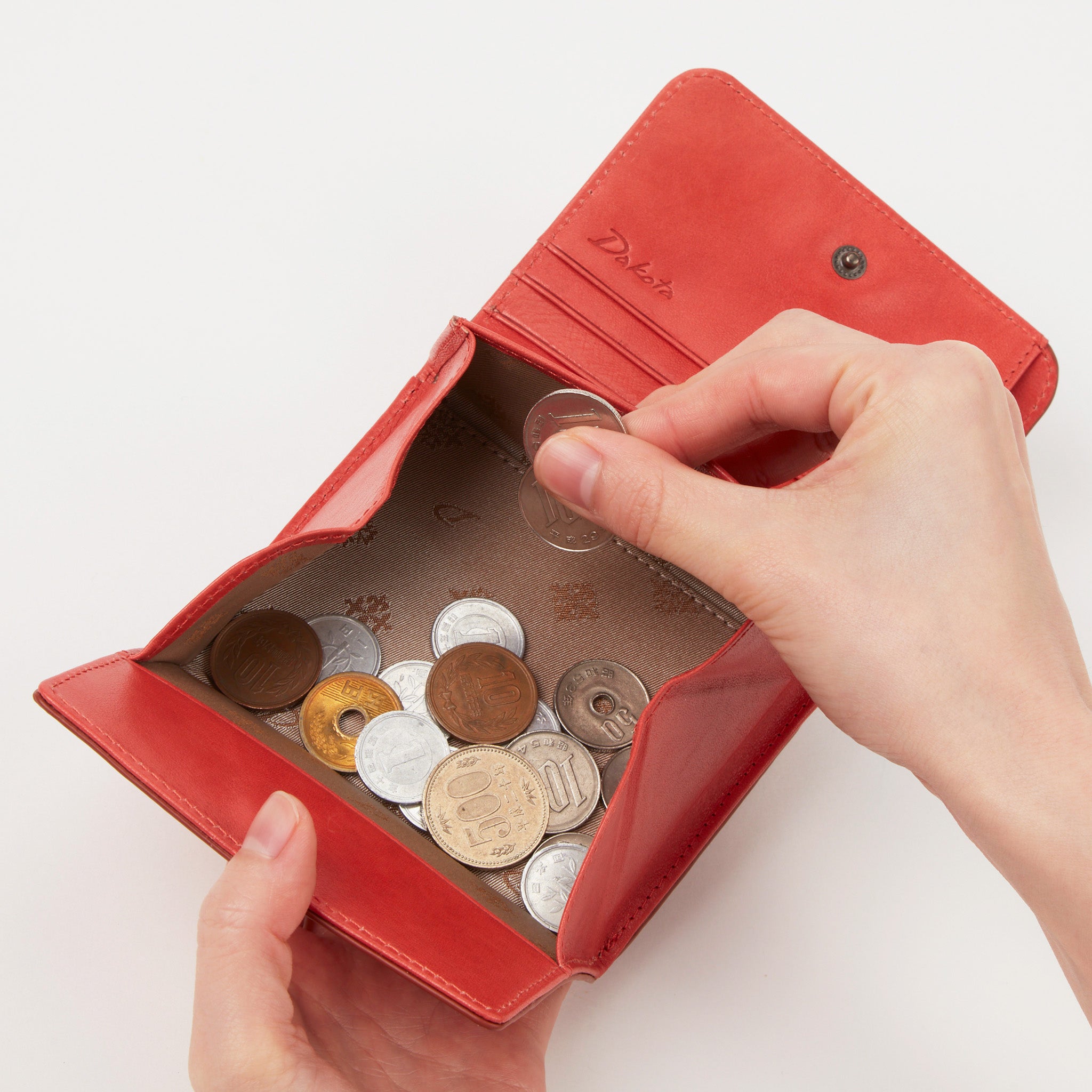 BOX型の小銭入れが付いた二つ折り財布です。カードポケットは合計6つあり、コンパクトですが必要なカードはしっかりと入れることができます。また、カードポケットの裏側についたBOX型小銭入れは、大きく開き、取り出しやすい便利な設計です。