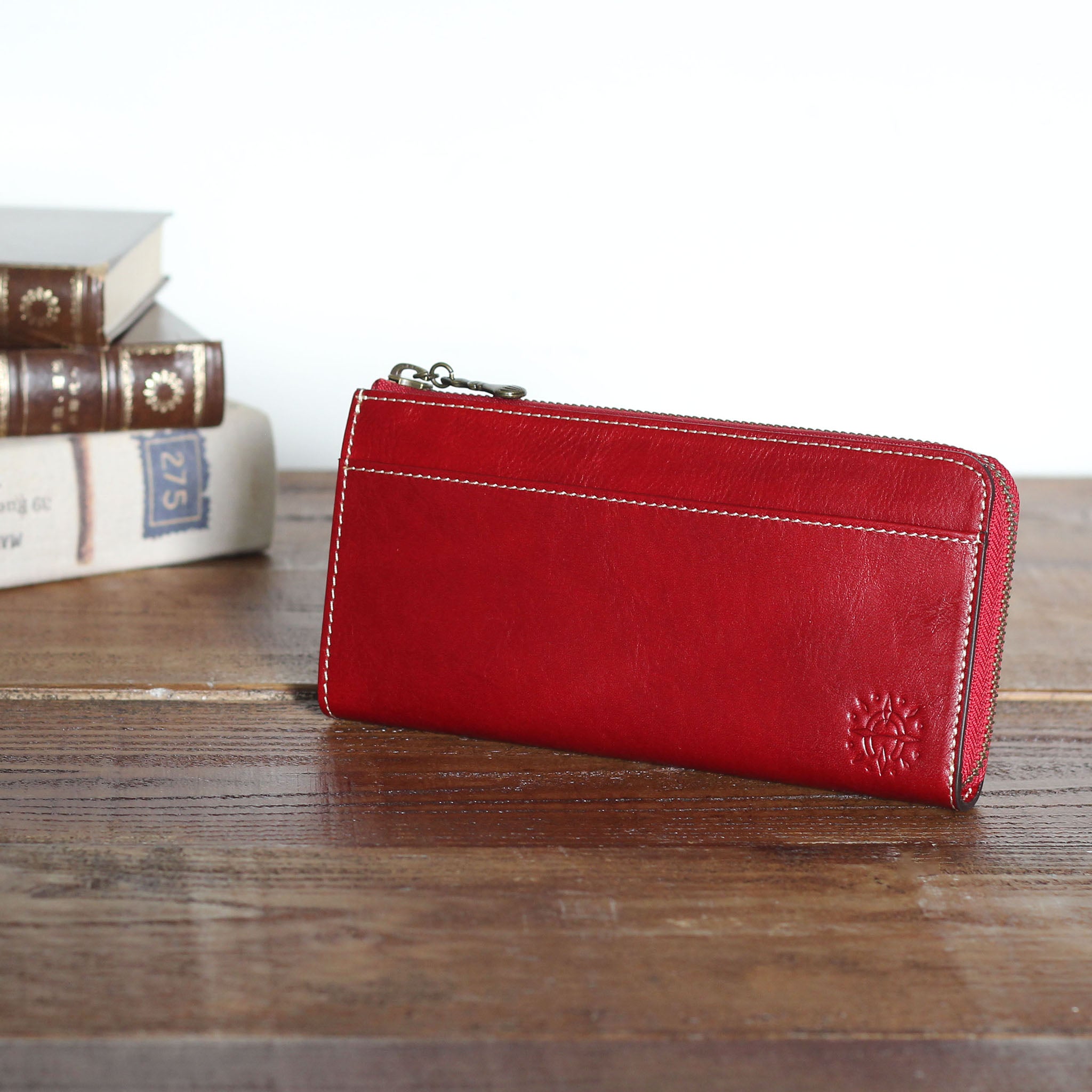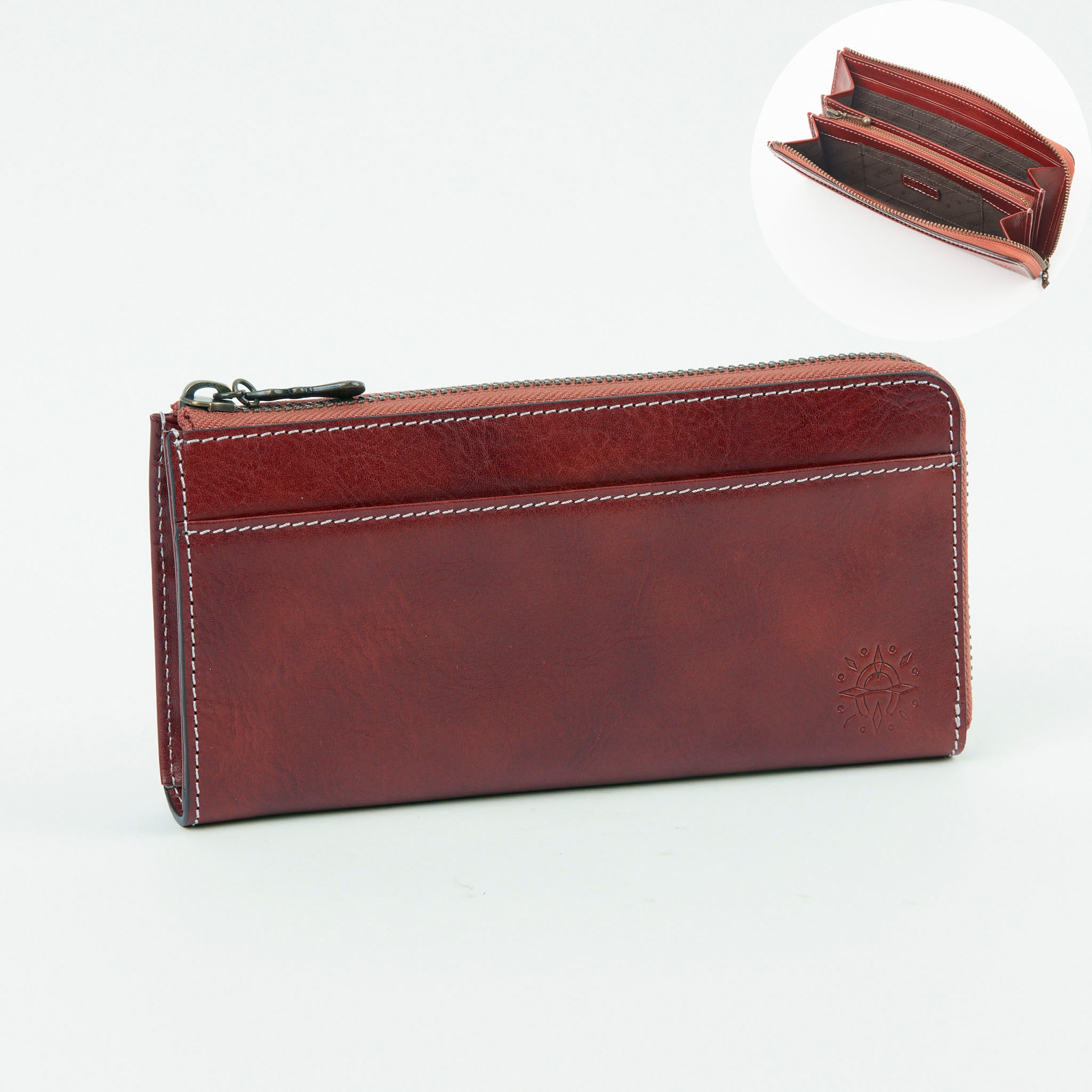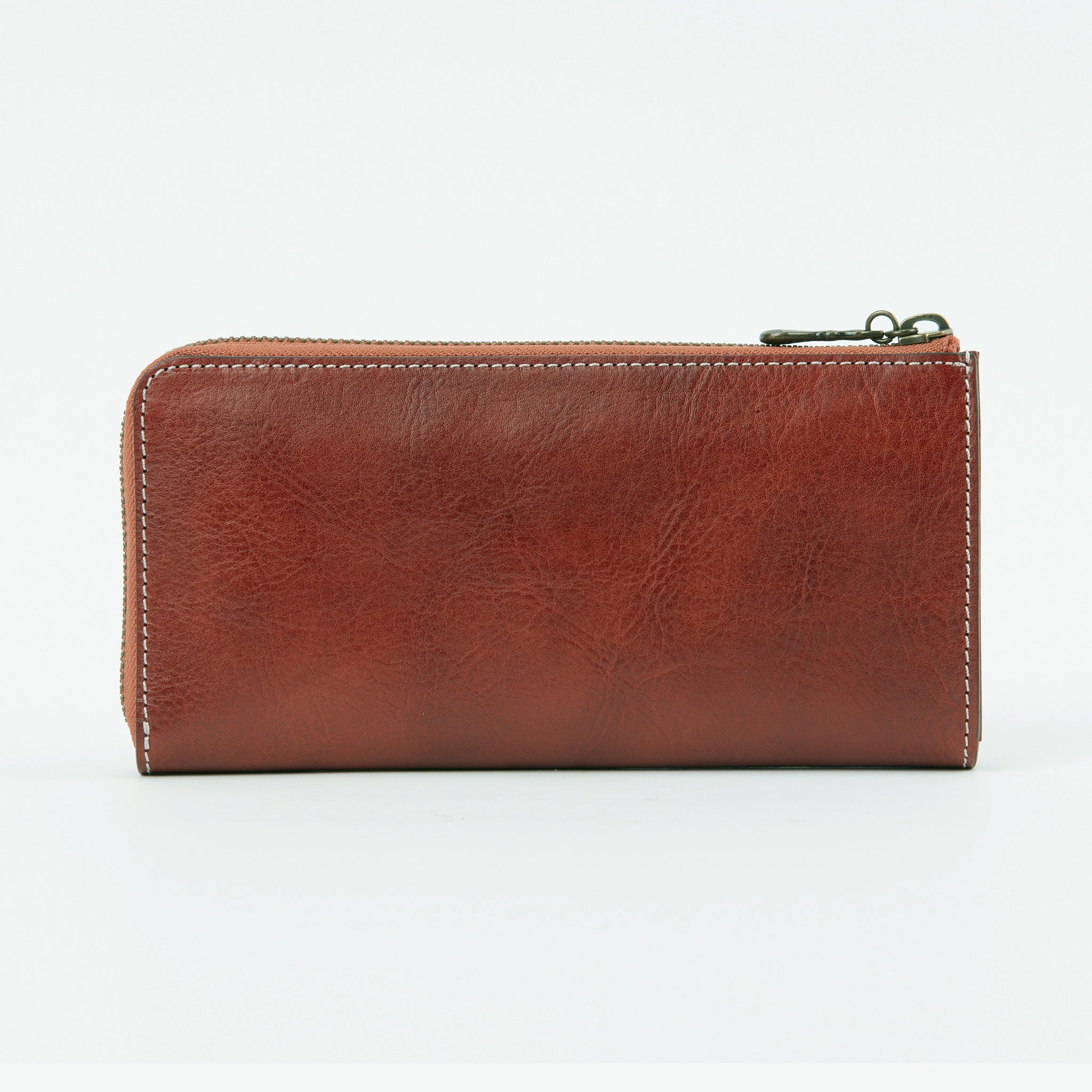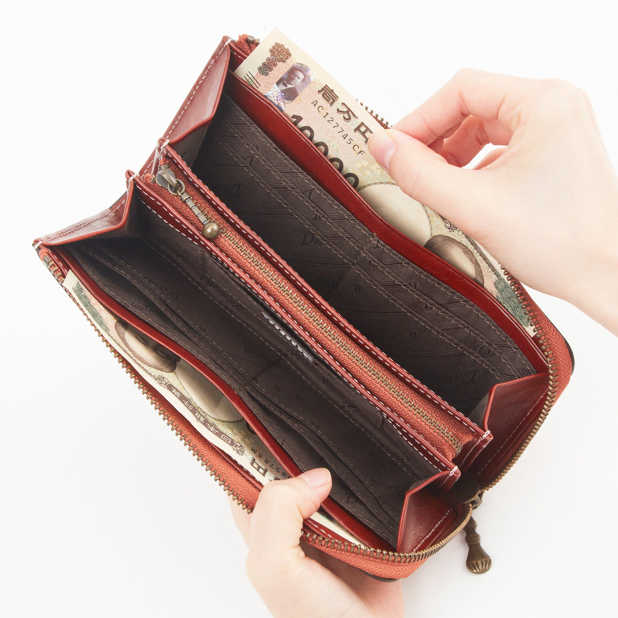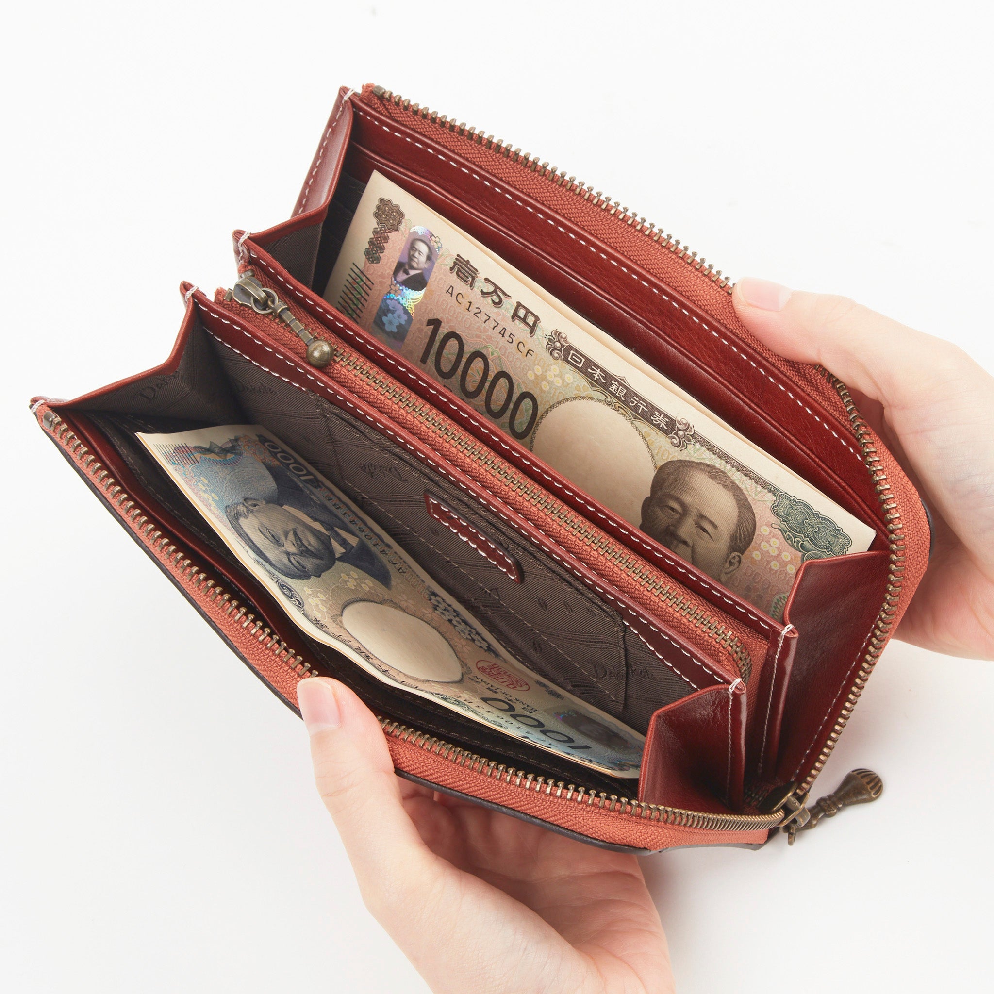 マチ付きタイプのL字ファスナー長財布。前面には、オープンポケットが付いているので、レシートやクーポンなどすぐに出し入れしたいアイテムの収納にも便利です。お札入れスペースは2つ、カードは合計16枚入れることができます。