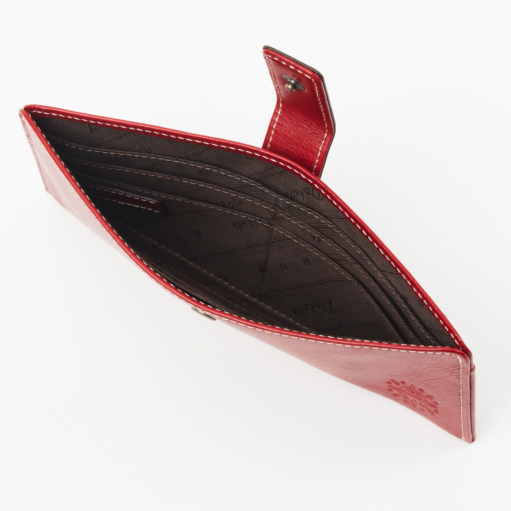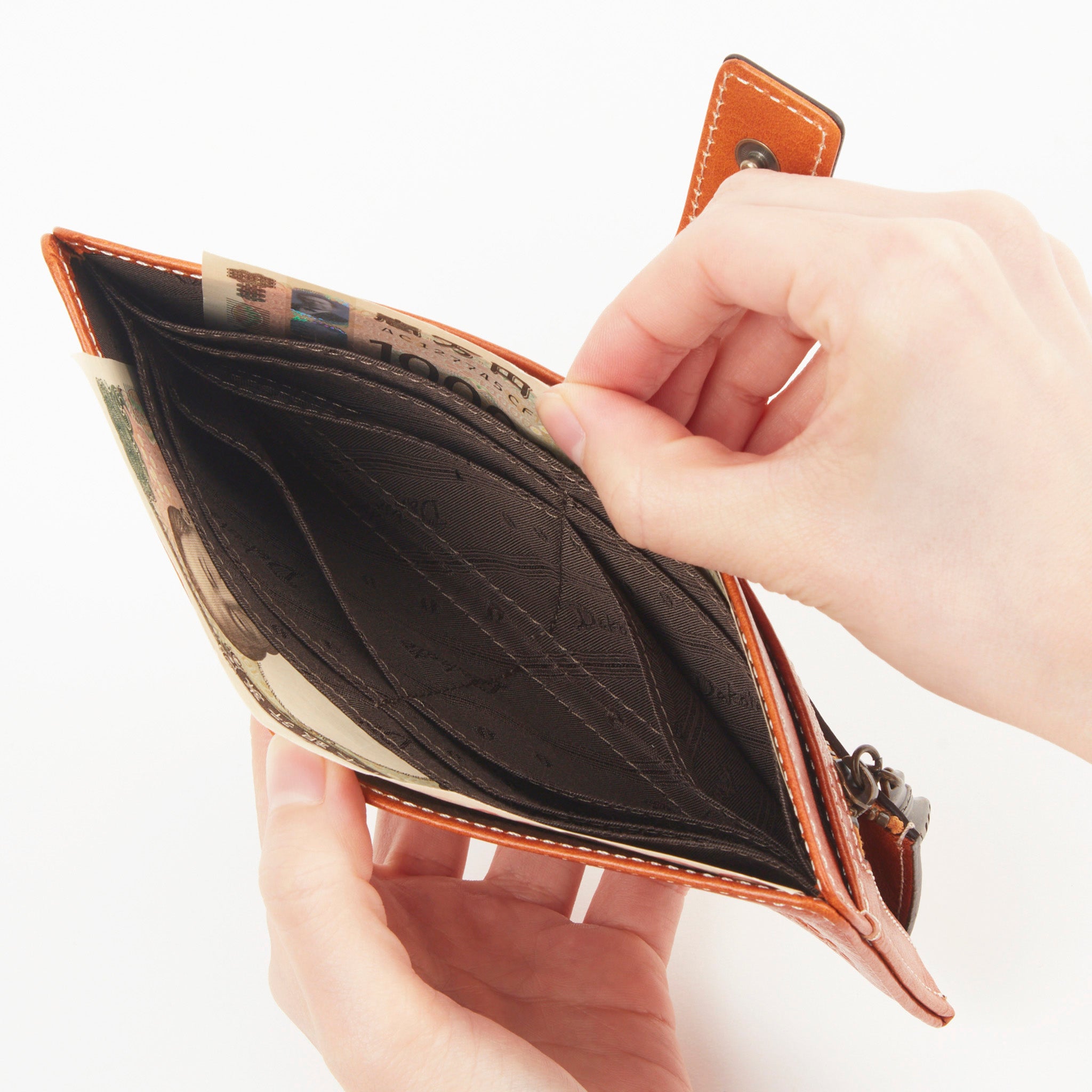 マチのないスリムなフォルムの長財布。ベロ付きのホックボタン開閉で、中には、カードポケットが4つ付いた紙幣も収納できるオープンスペースが備わっています。背面には、外ファスナーポケット小銭入れが付いています。