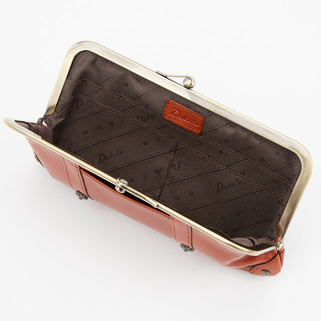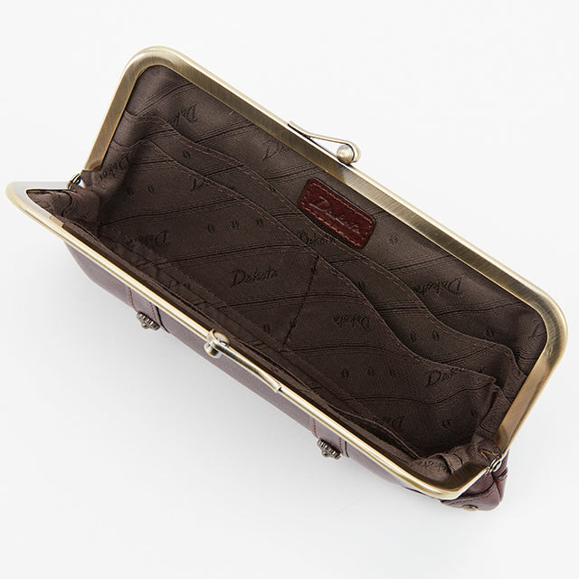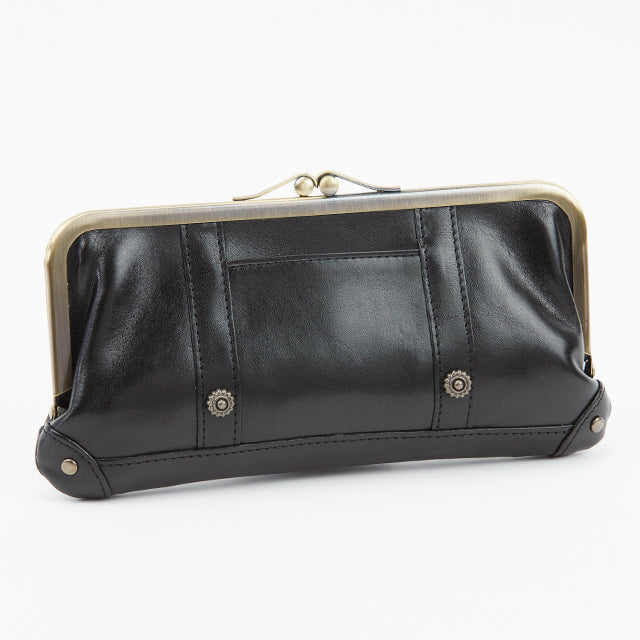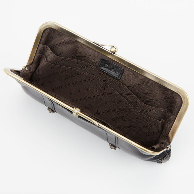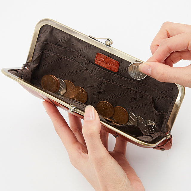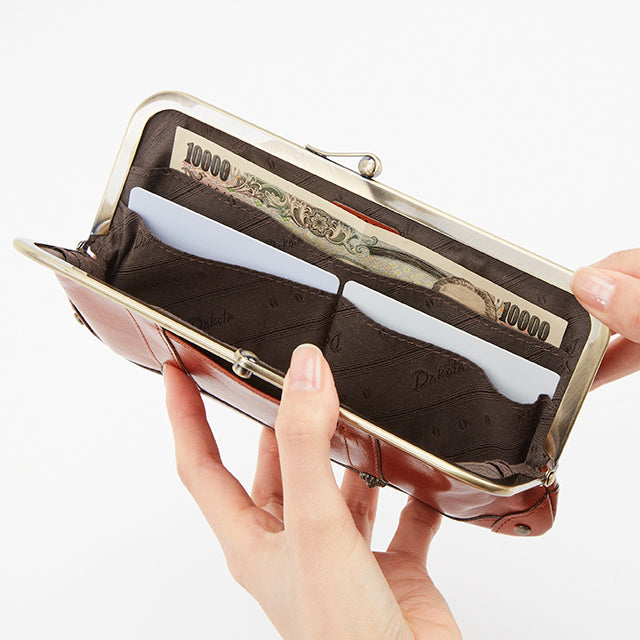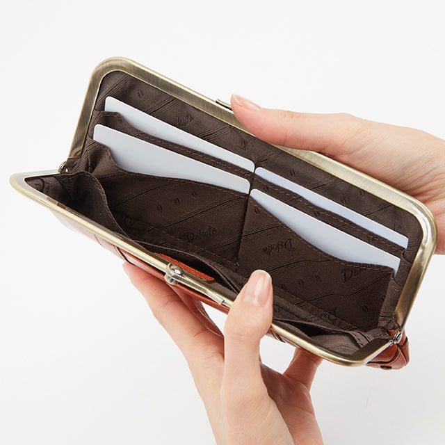 アンティーク調のがま口がレトロでかわいい、スリムな長財布。内部の作りは至ってシンプルですが、お札や小銭、カードが一目瞭然。すっきりスマートに持てるお財布です。