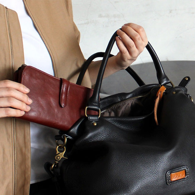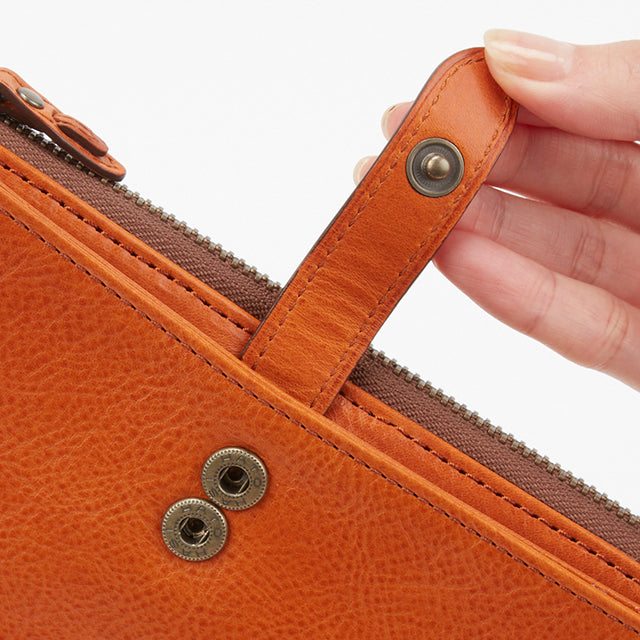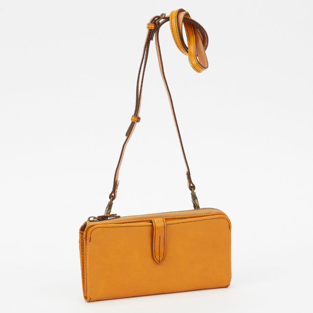 お財布ショルダーバッグよりもコンパクトに身につけられるショルダーストラップ付き長財布。お財布として使うためのコンパクトなサイズ感と機能性を見据えながら、斜めがけにも対応できるアイテムに仕上げました。