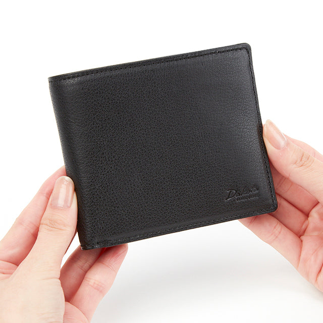 内側にフラップタイプの小銭入れがついたベーシックで使いやすい二つ折り財布です。カード段のラインを特徴的な仕様にすることで厚みを抑えた形になっています。