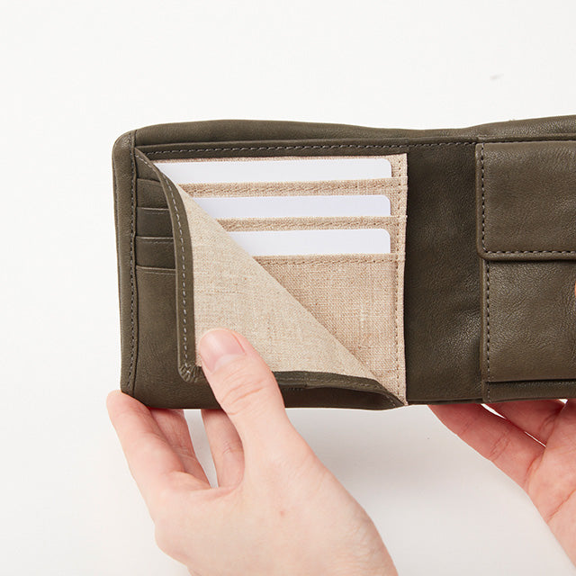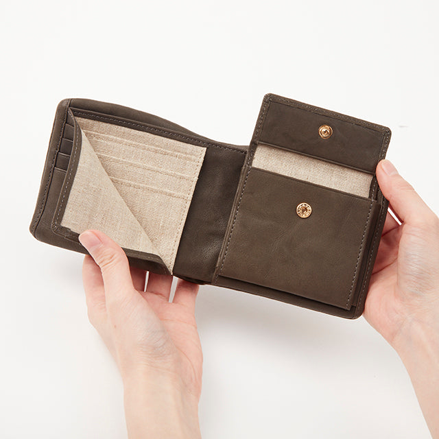 揉み加工によって生まれる革の独特な凹凸感と、オイルを含ませることで感じられる柔らかな質感が特徴のお財布シリーズ。幾多の工程と時間を経て仕上げられた迫力ある革は、使い込むほどに艶が増し、深みのある風合いへと育っていきます。また、内装には麻の生地を使用。ナチュラルな素材本来の魅力に、あたたかみを添えくれます。