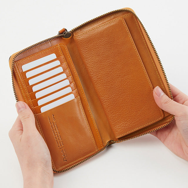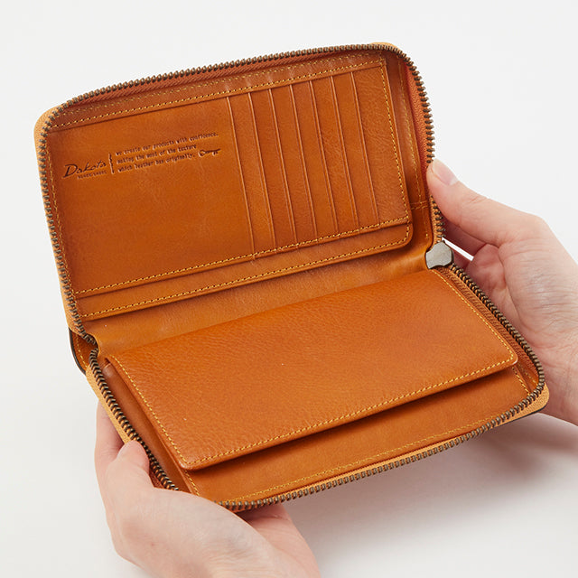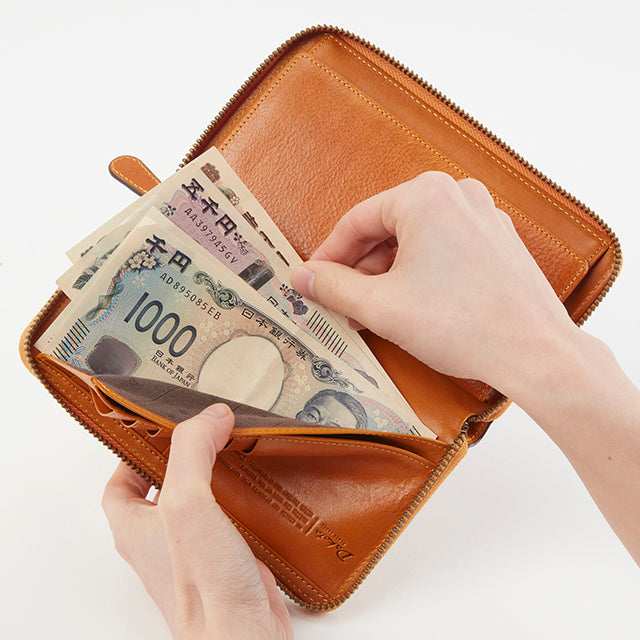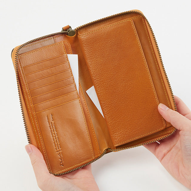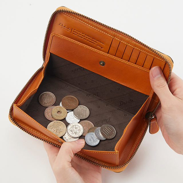 横幅を抑えたスマートなサイズ感で、すっきりと持ちやすいラウンドファスナータイプの長財布です。開くと中がしっかり確認できる構造で、小銭入れには出し入れしやすい大きめのボックス型を採用。使いやすさにもこだわった設計です。