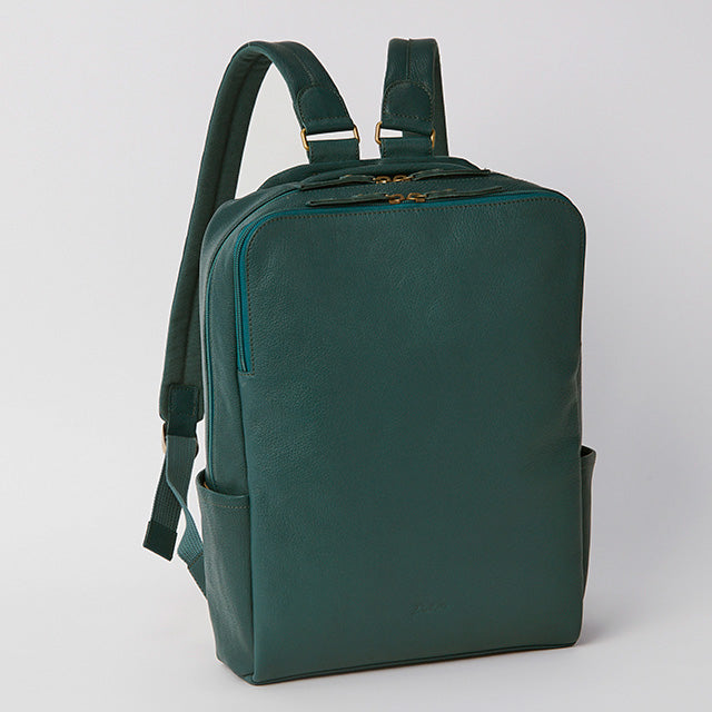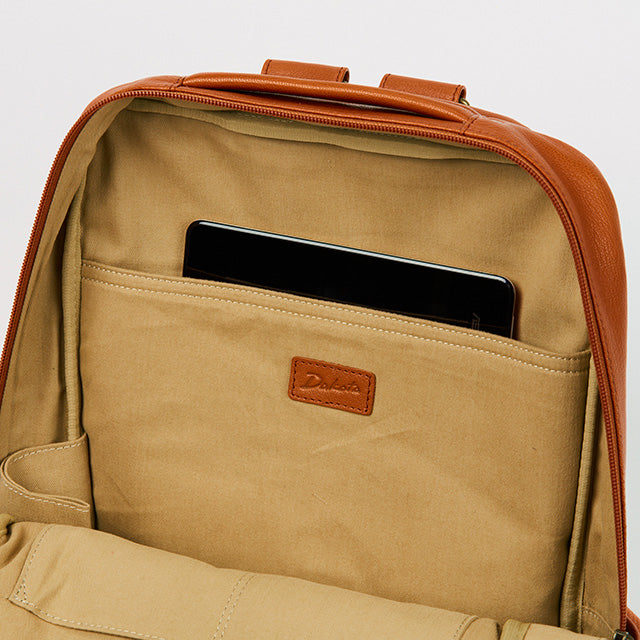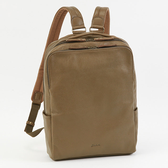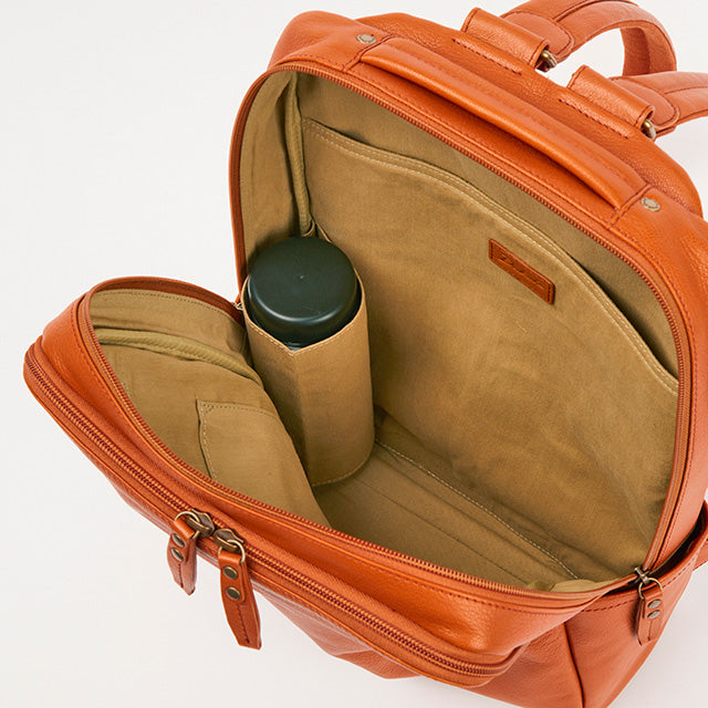 通勤・通学に使いやすいA4サイズ対応のレザーリュックです。メイン収納内には、ノートPCやタブレット、資料等を収納できるスリーブポケットがあります。また、ペットボトルホルダーが付いているので、しっかりと立てて収納することができます。ショルダー部分にはクッション性をプラスし、背負いやすい仕様にしました。やぎ革ならではの程よいツヤ感が、品のある雰囲気を引き立てくれるので、幅広い装い、シーンで持ちやすいです。