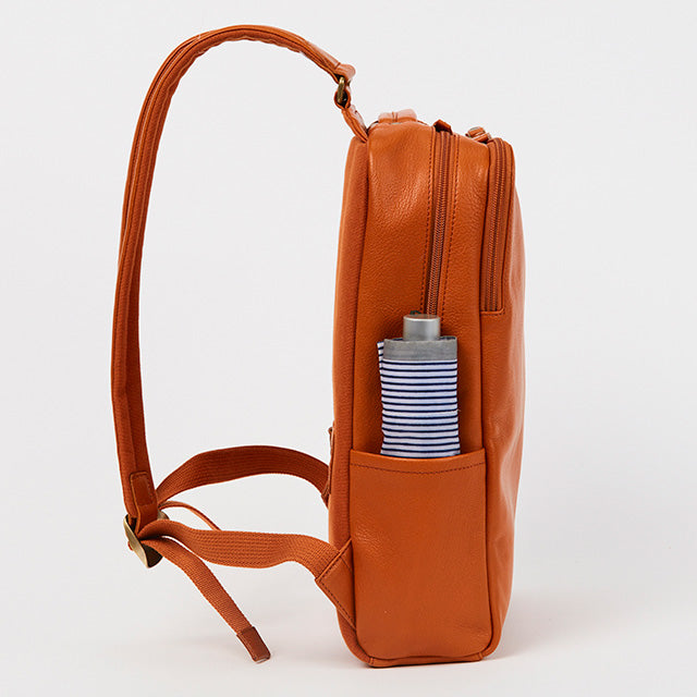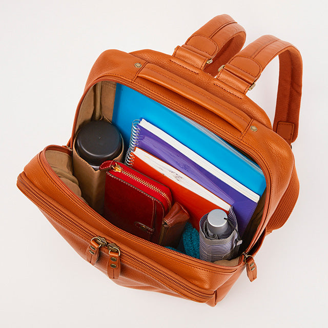 細やかなシボ感が特徴のやぎ革を、機能的なリュックに仕立てました。カジュアルになりがちなリュックも、レザー仕立てなら落ち着いた雰囲気でお持ちいただけます。普段使いはもちろん、ご旅行などにもおすすめです。