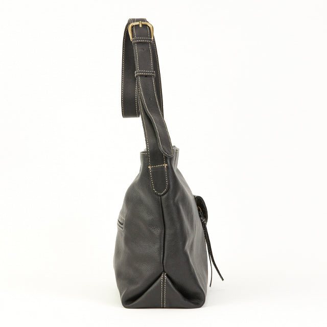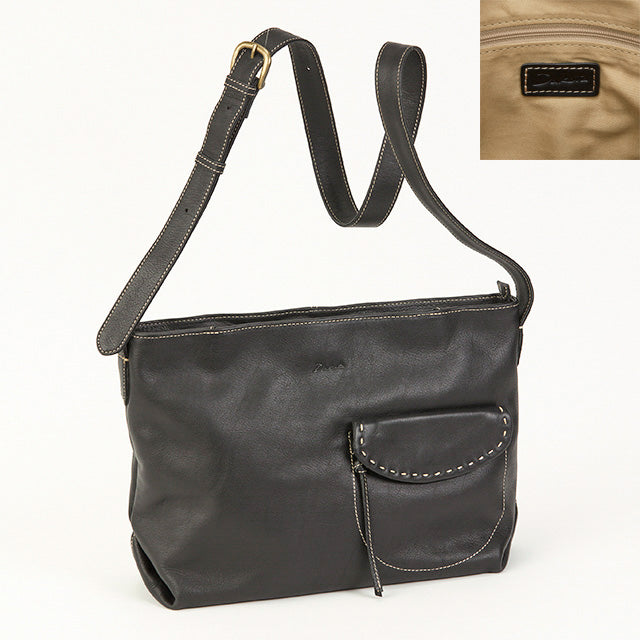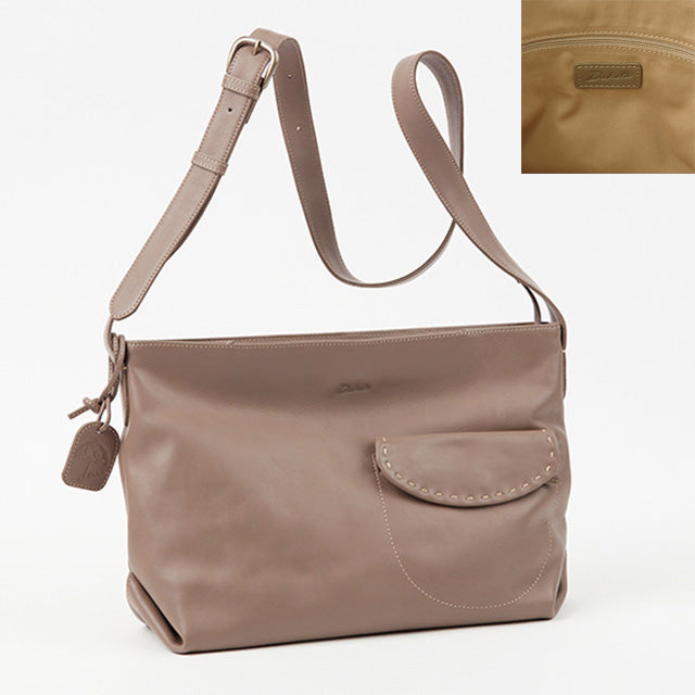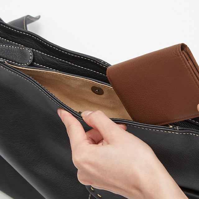 タブレットPCもすっぽり入る、たっぷりサイズのショルダーバッグです。ポケットをかたどった丸いステッチが可愛らしいアクセントになっています。雨の日は荷物をまとめて持ちたい方にオススメです。