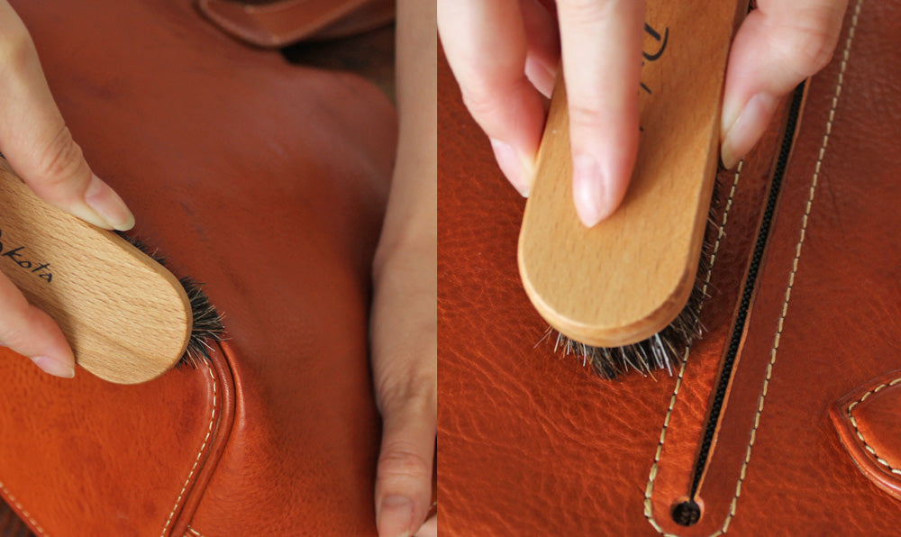 ツヤだし・汚れ落とし・保革の3つの効果を1本で可能にするレザーモイストローション。バッグや財布のホコリを落としやすい馬毛のブラシ。手洗い可能なローション塗布・乾拭き用の専用クロス。レザーグッズのお手入れに必要なアイテムがコンパクトに揃ったセットです。愛用中のバッグ・財布のお手入れとしてはもちろん、バッグ・財布を使い始める前にもお使いいただけます。