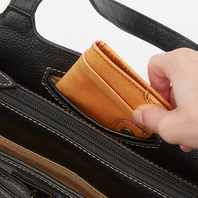A4ファイル収納可能なトートバッグです。肩掛けをしたままでも使いやすいトップポケットや片アオリポケットが付いており、小物収納がしやすいデザインです。キレイめな印象なので、オンオフ問わず幅広いシーンやコーデに合わせてお持ちいただけます。
