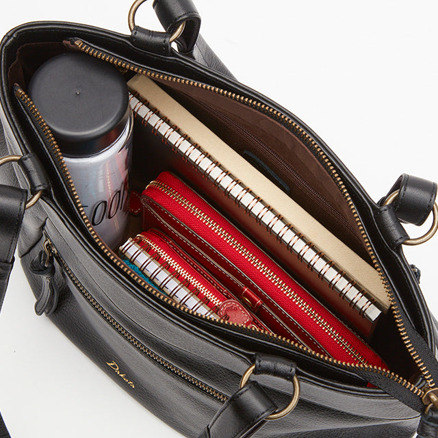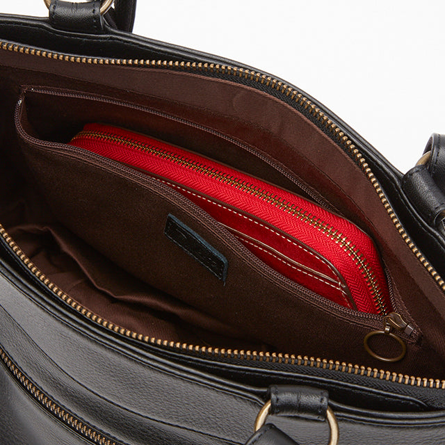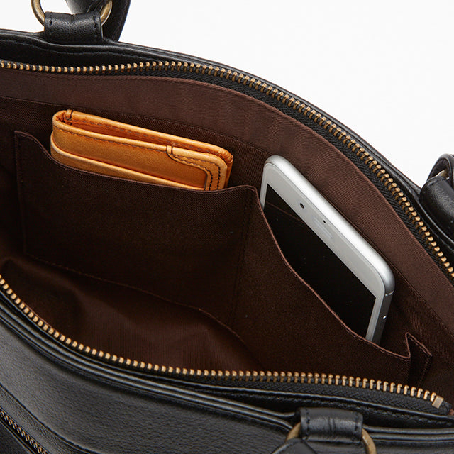 タック使いと箔押しのロゴでフェミニンな雰囲気に仕立てました。ポケットを多く配し、日常使いのしやすいデザインです。また、色焼けしづらく、傷もつきにくい牛革を使用しているので、オンオフ問わず幅広いシーンでお使いいただけます。