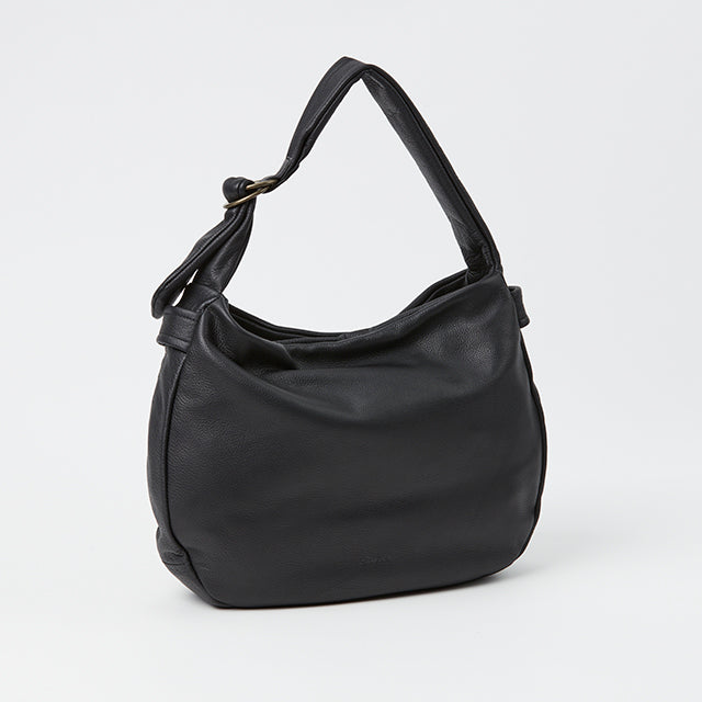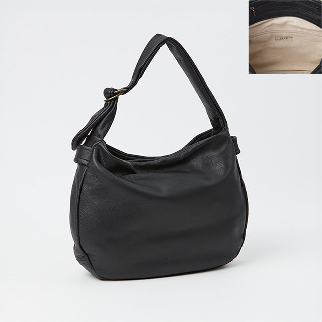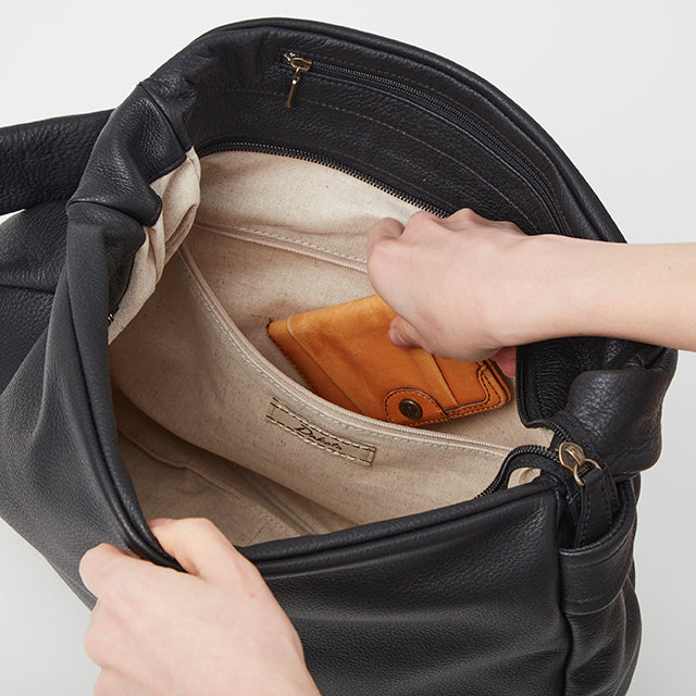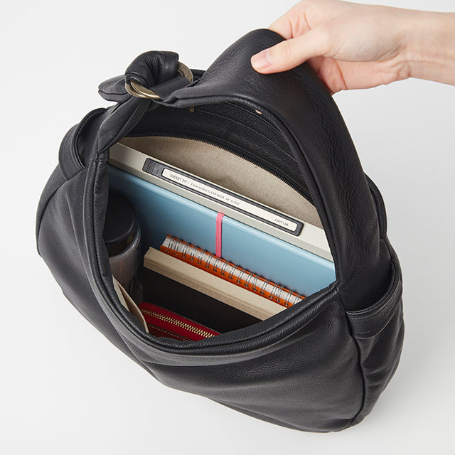 柔らかなタッチ感とふっくらとしたデザインが心地よい、デイリーユースなバッグです。物を入れるとくたっと底が落ち、より丸みを帯びたフォルムになります。袋縫いの太めの持ち手は、肩あたりがよく安定感があるのも魅力です。