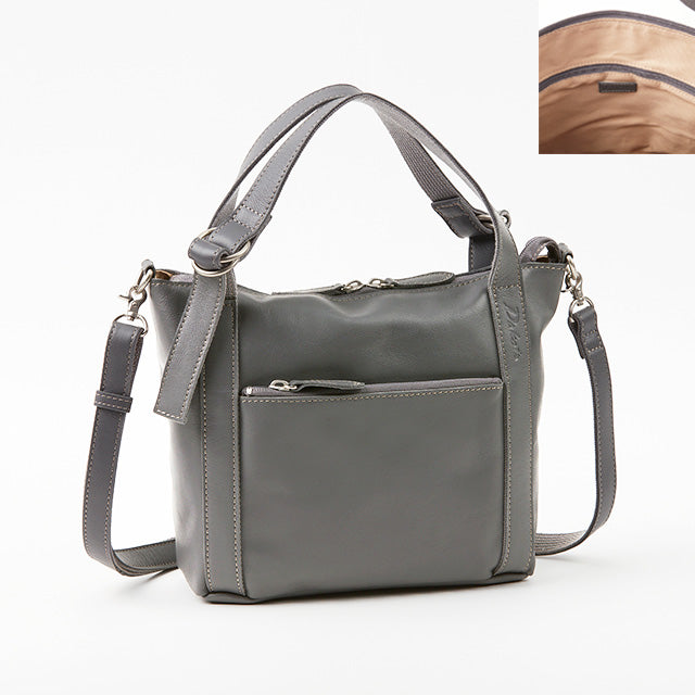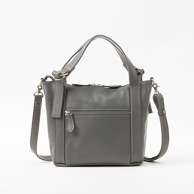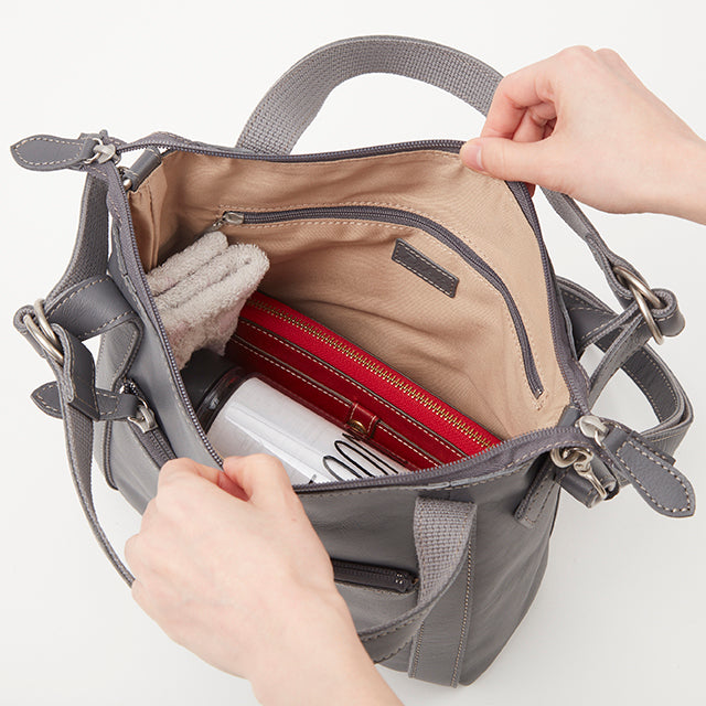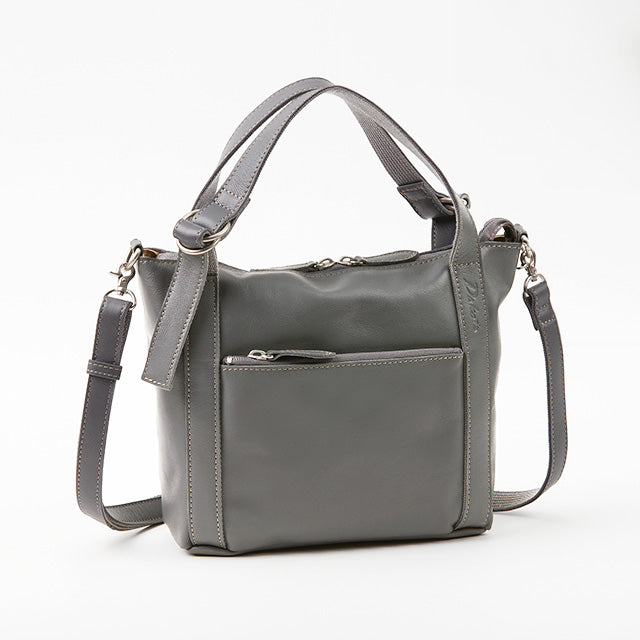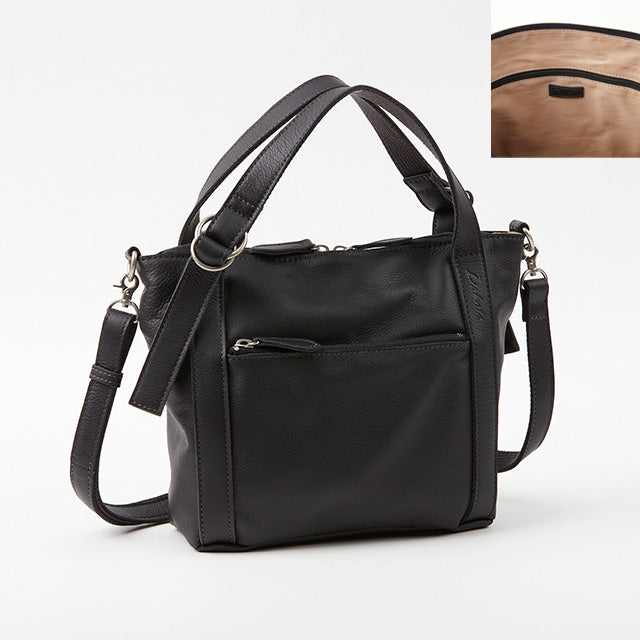 取り外し可能なショルダーベルト付きで、ハンドバッグとしてもショルダーバッグとしても使える2wayタイプのバッグです。長財布や折りたたみ傘など、日常の必需品がすっきり収まる、使い勝手の良いサイズ感です。ハンドル部分にあしらわれたダブルリングの調節金具は、シンプルなデザインにさりげないアクセントをプラスしています。