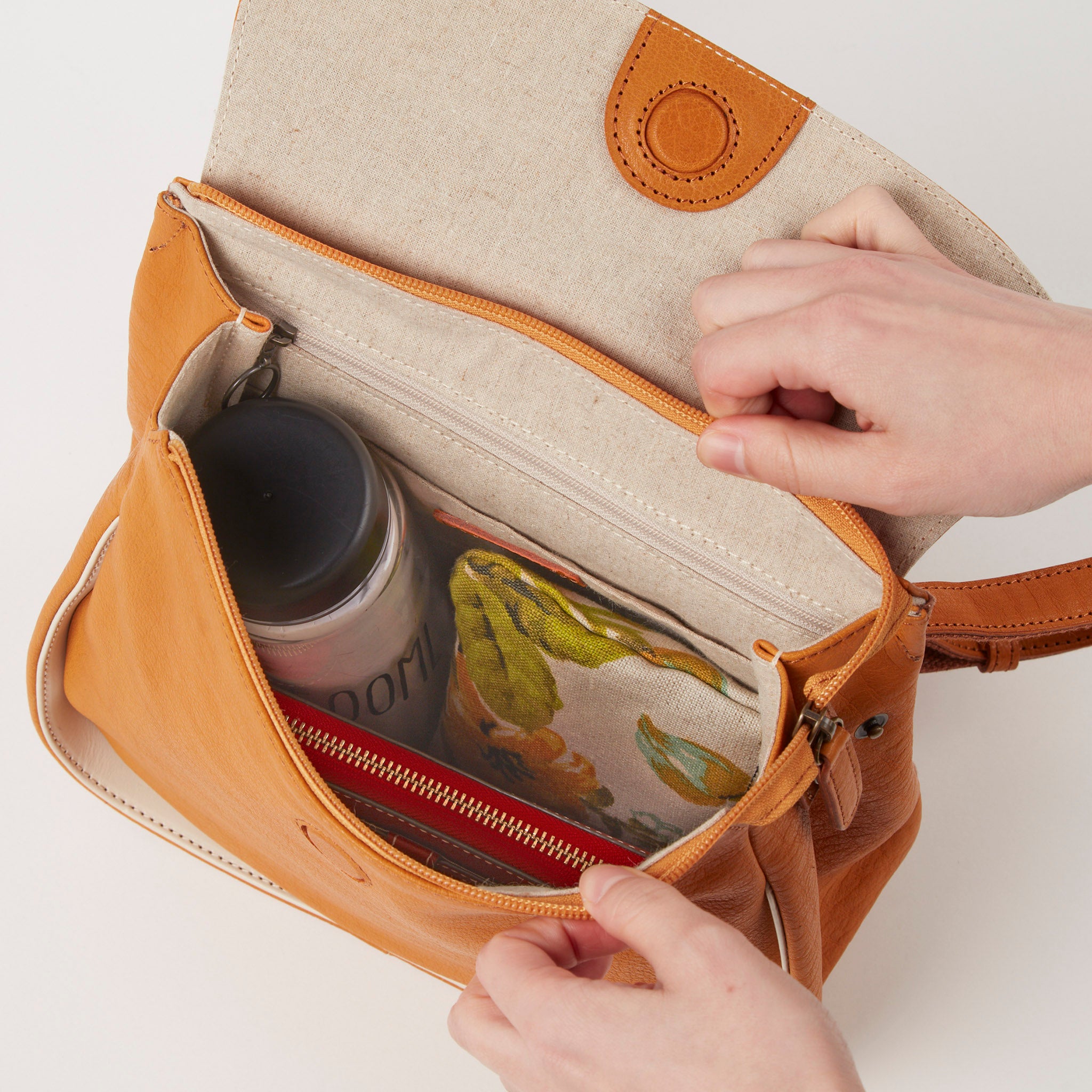 ヒートシュリンク加工を施した、軽やかで柔らかな手ざわりのレザーを使用。大人のカジュアル感が引き立つ、オンオフどちらでも持ちやすいバッグに仕上がっています。正面の特徴的なフチのデザインとそこに小さくあしらわれたブランドロゴが上品で洗練された印象を与えてくれます。