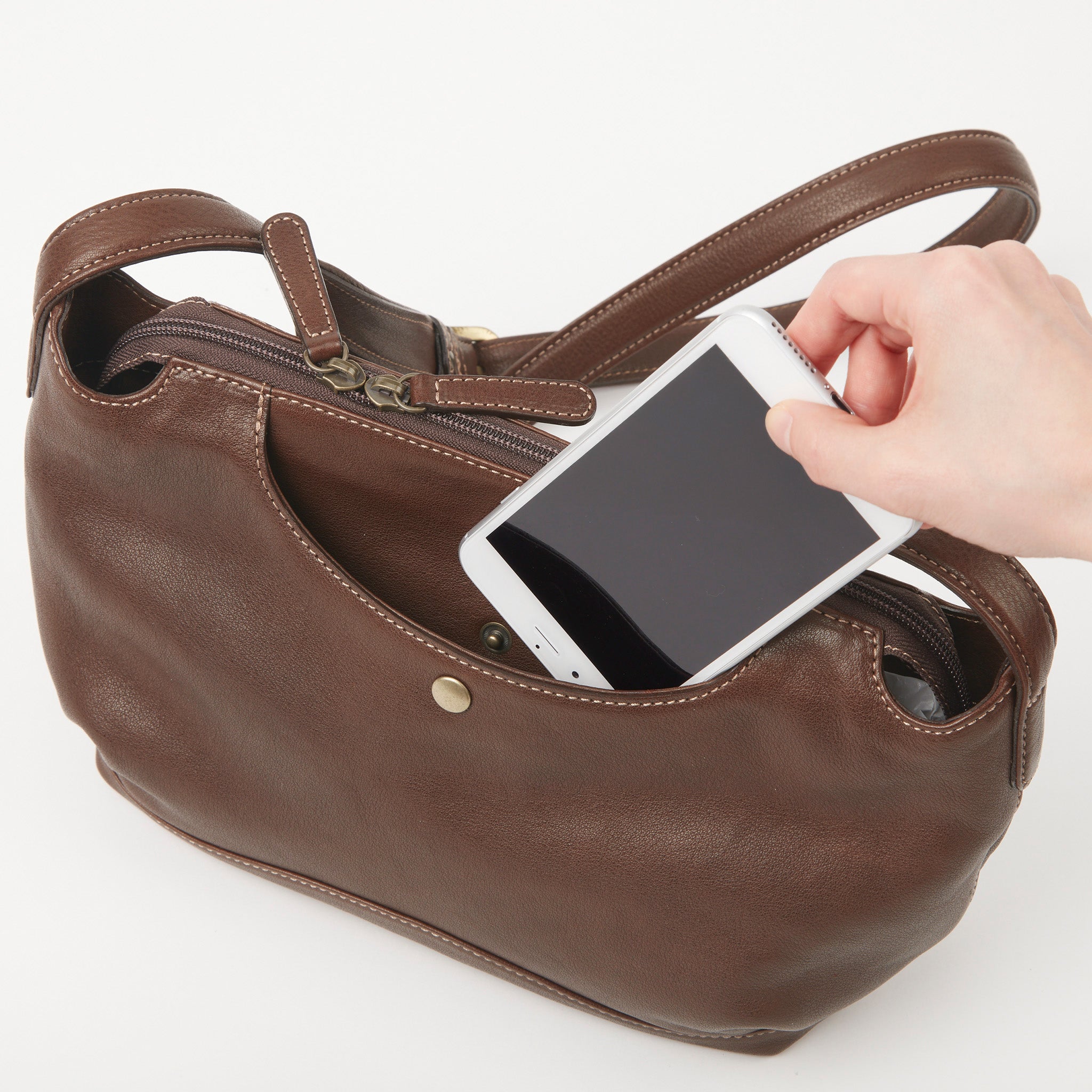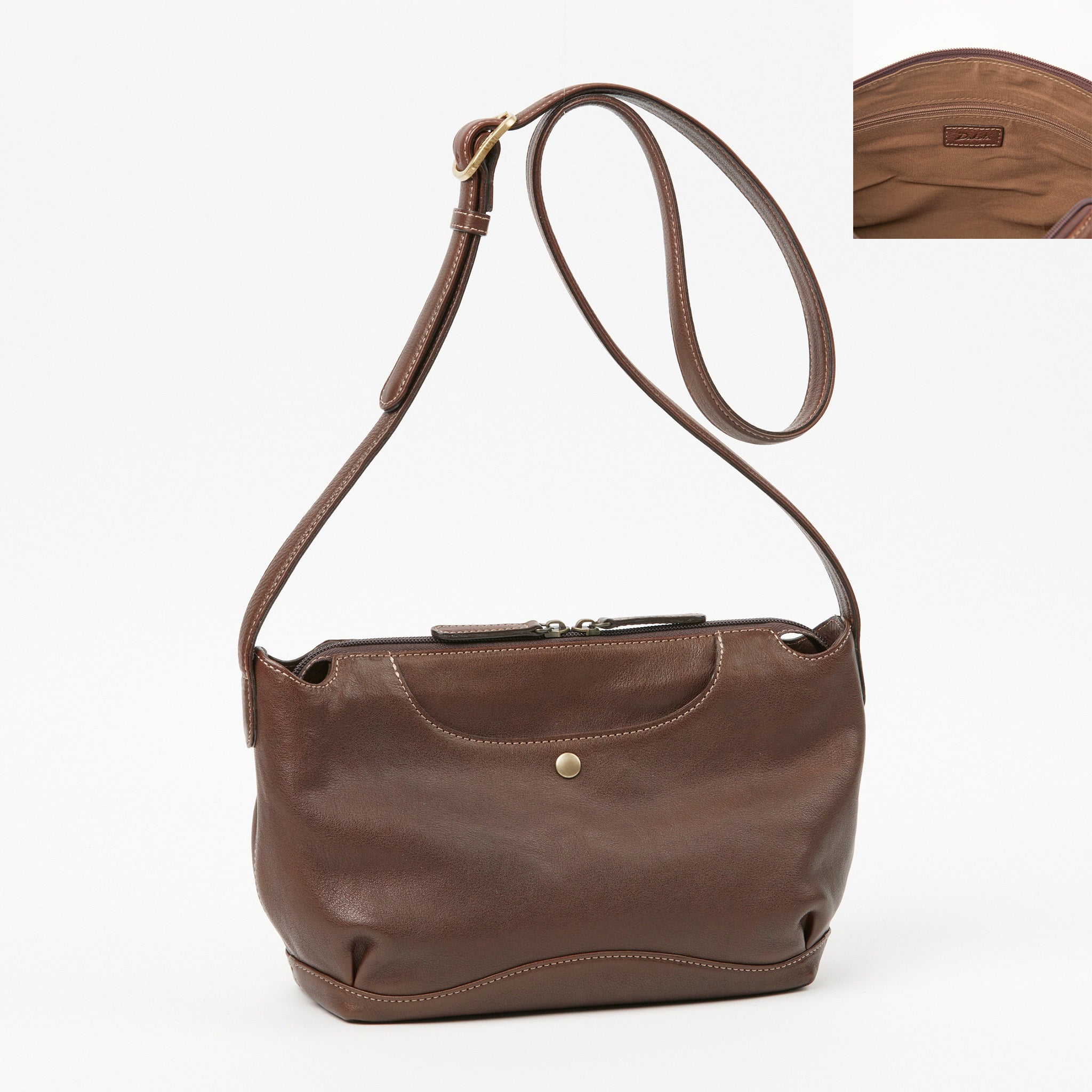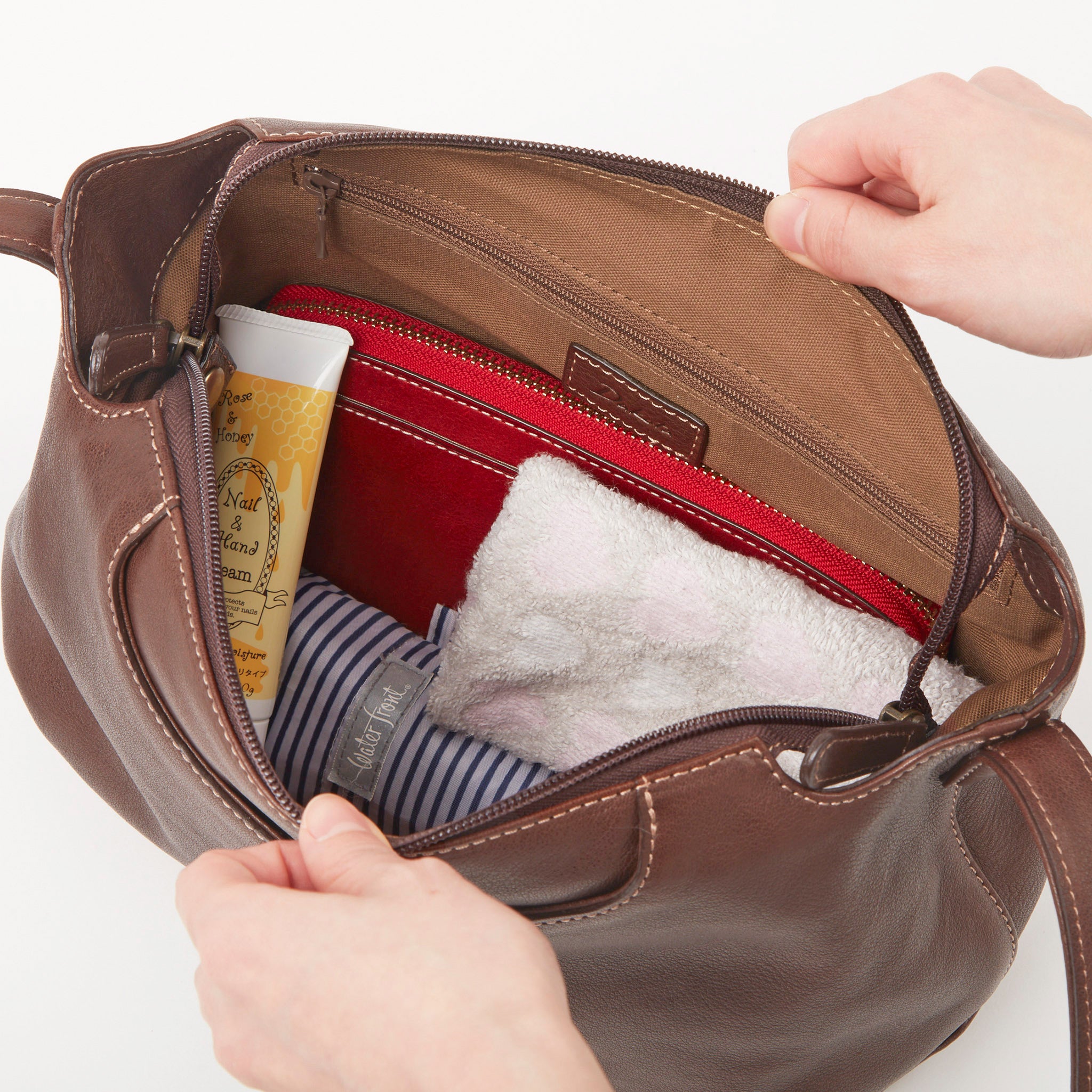 ペットボトルがちょうど入る、横長フォルムのショルダーバッグです。 ファスナー周りについているスナップボタンを外したら、端まで大きく開き、中が一瞬構造です。 また、外装の前面、背面それぞれにポケットがあり、頻繁に取り出すものを収納できます。