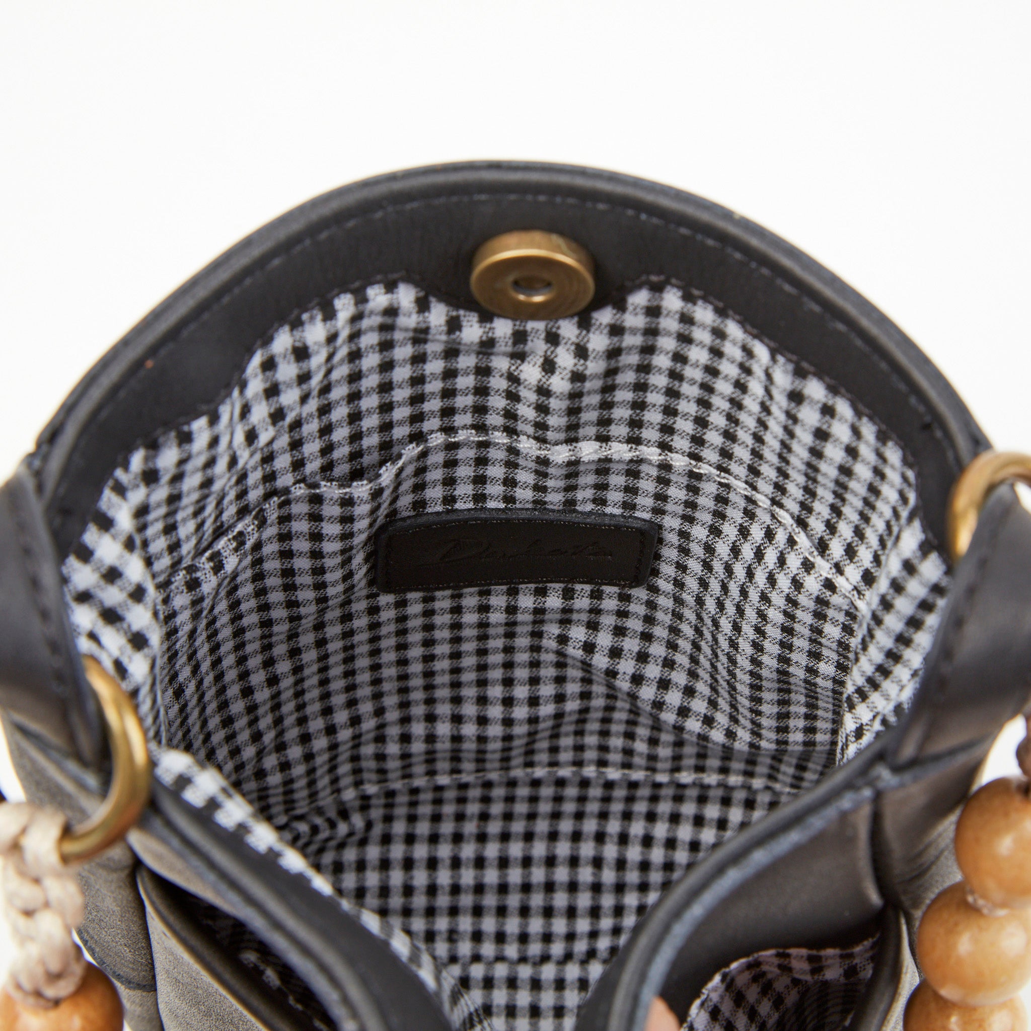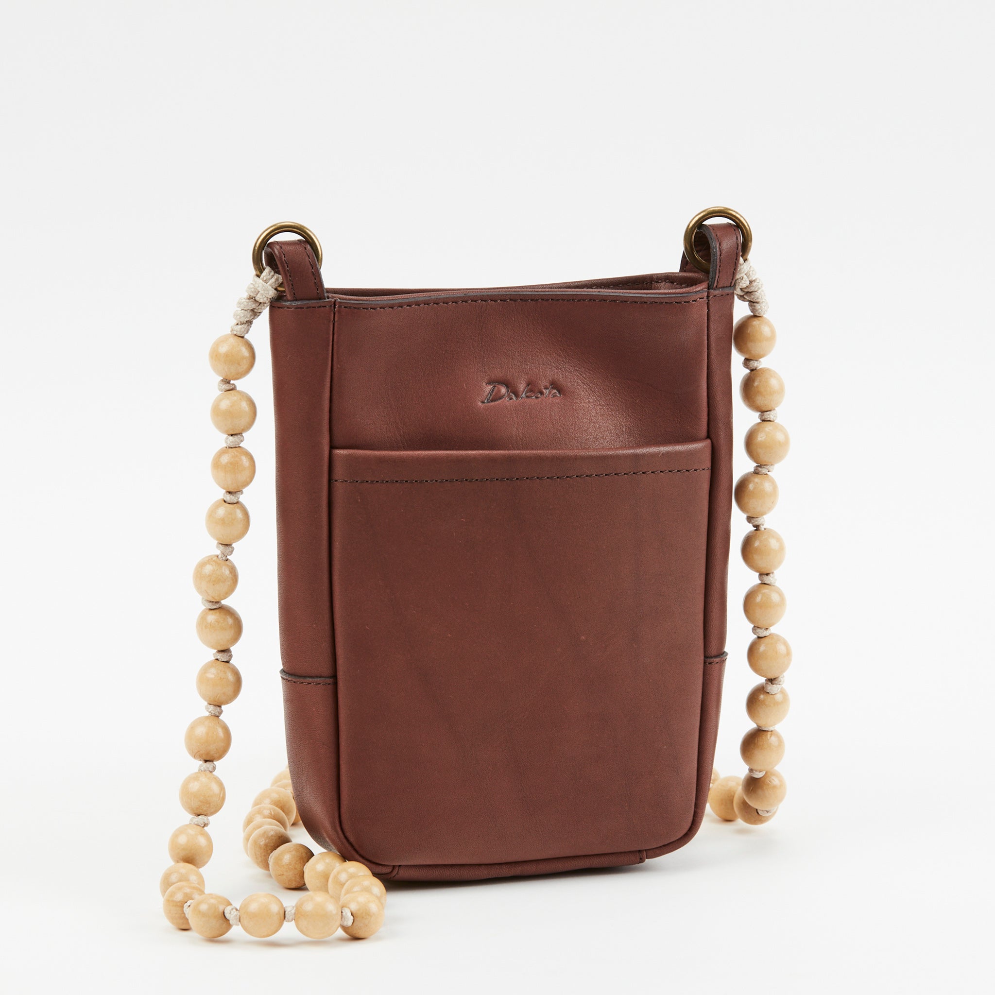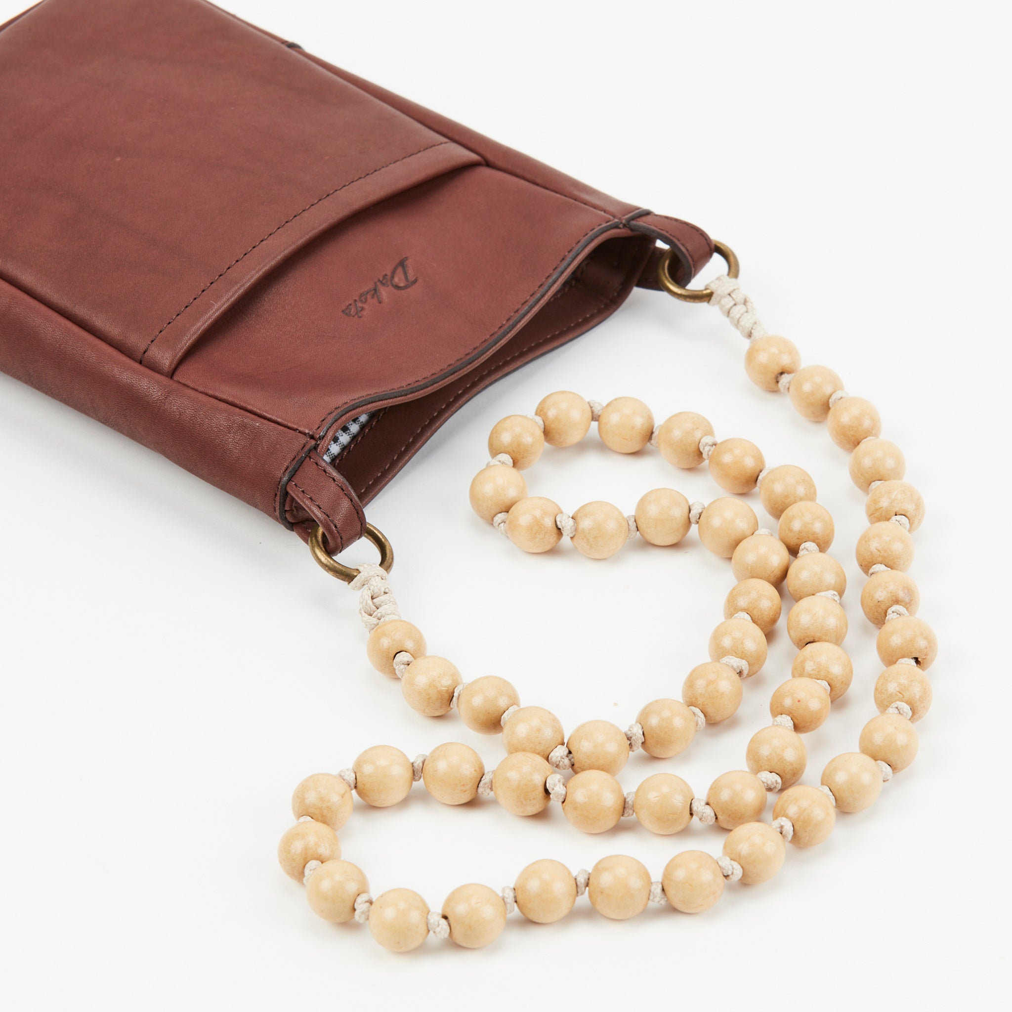 ウッドビーズのショルダー紐が目を引くミニショルダーバッグ。