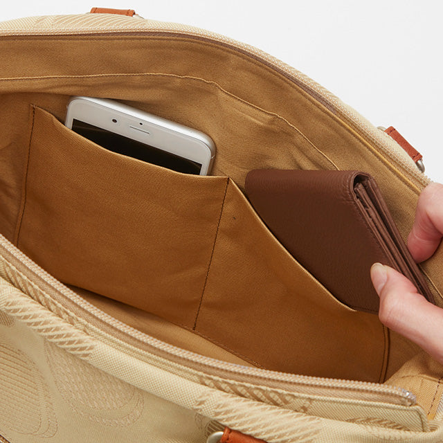 Dakotaでも人気のドット柄をジャカード織りで表現しました。さり気ないドット柄はカジュアルすぎず、お仕事コーデやキレイめコーデにも合わせやすいです。正面にファスナーポケットを配したり、アオリポケット仕様にしたり、見た目以上の収納力にもこだわりました。