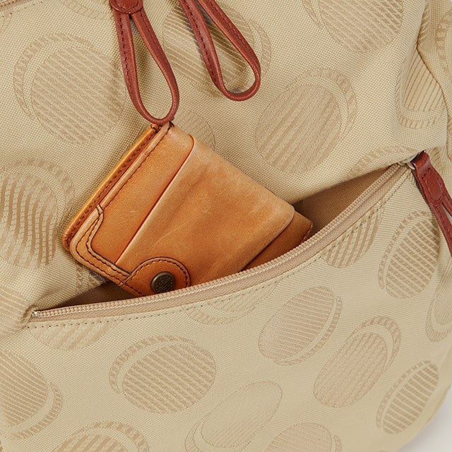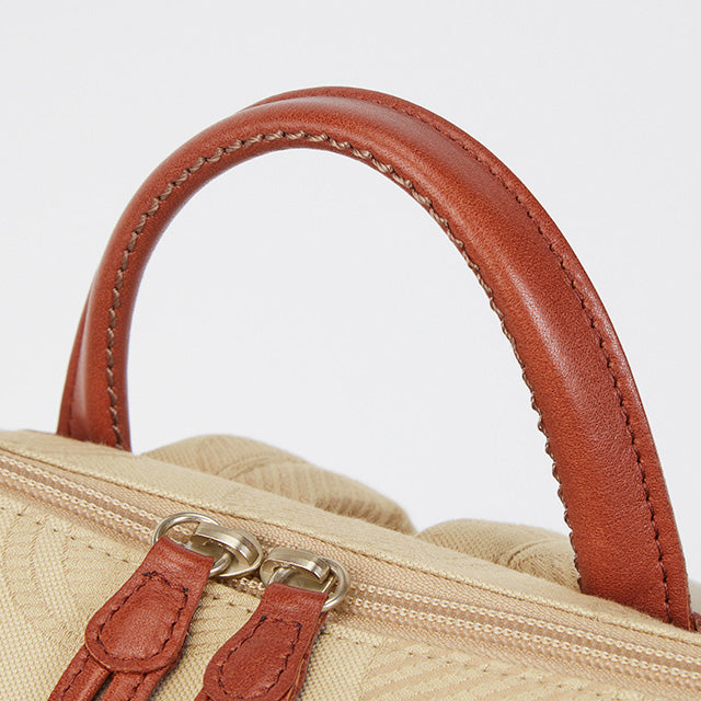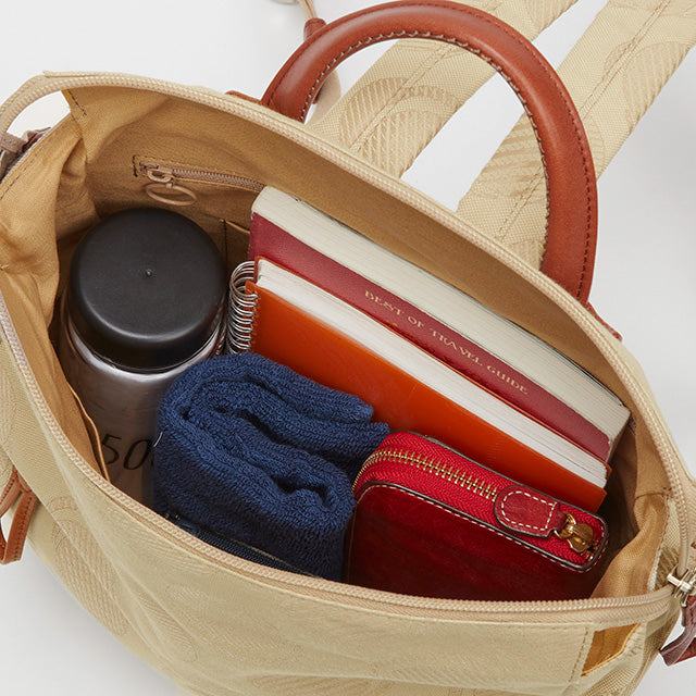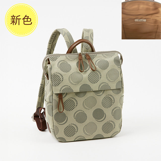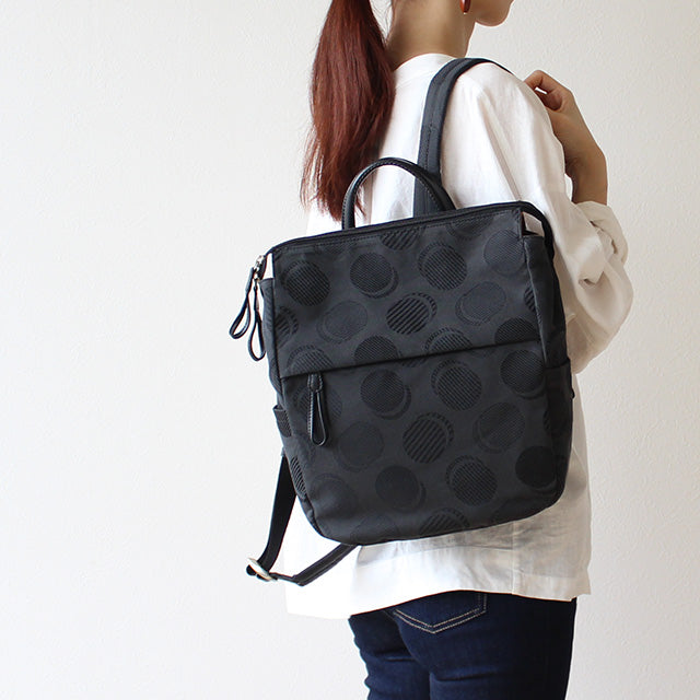 Dakotaでも人気のドット柄をジャカード織りで表現しました。さり気ないドット柄はカジュアルすぎず、お仕事コーデやキレイめコーデにも合わせやすいです。正面にファスナーポケットを配したり、アオリポケット仕様にしたり、見た目以上の収納力にもこだわりました。