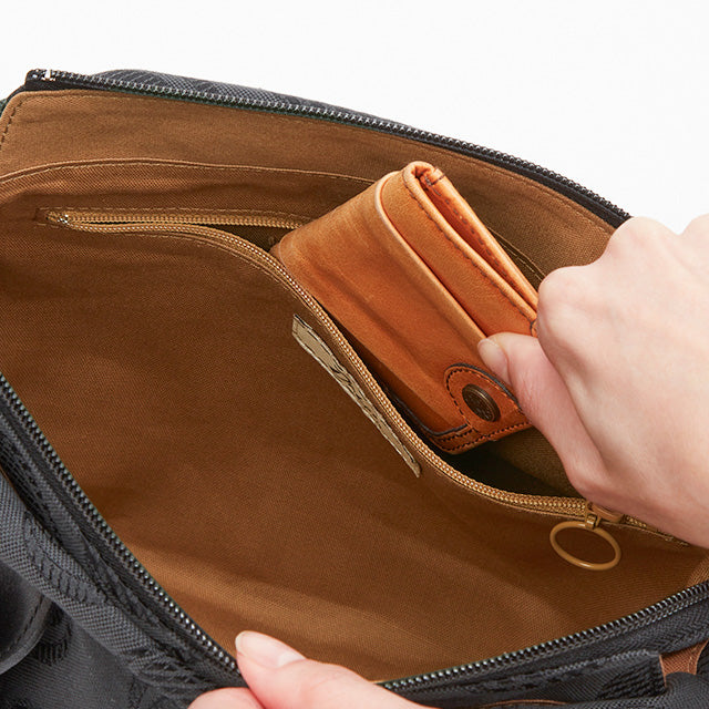 Dakotaでも人気のドット柄をジャカード織りで表現しました。さり気ないドット柄はカジュアルすぎず、お仕事コーデやキレイめコーデにも合わせやすいです。正面にファスナーポケットを配したり、アオリポケット仕様にしたり、見た目以上の収納力にもこだわりました。