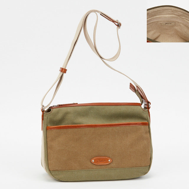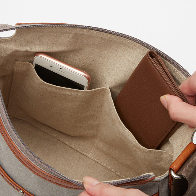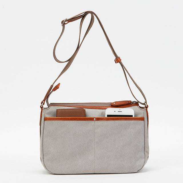 長財布やペットボトルを楽に収納できるサイズ感の帆布ショルダーバッグです。大きすぎないサイズ感、内外ともにポケットの多いデザインは、お出かけや旅行の際にも大活躍するアイテムです。