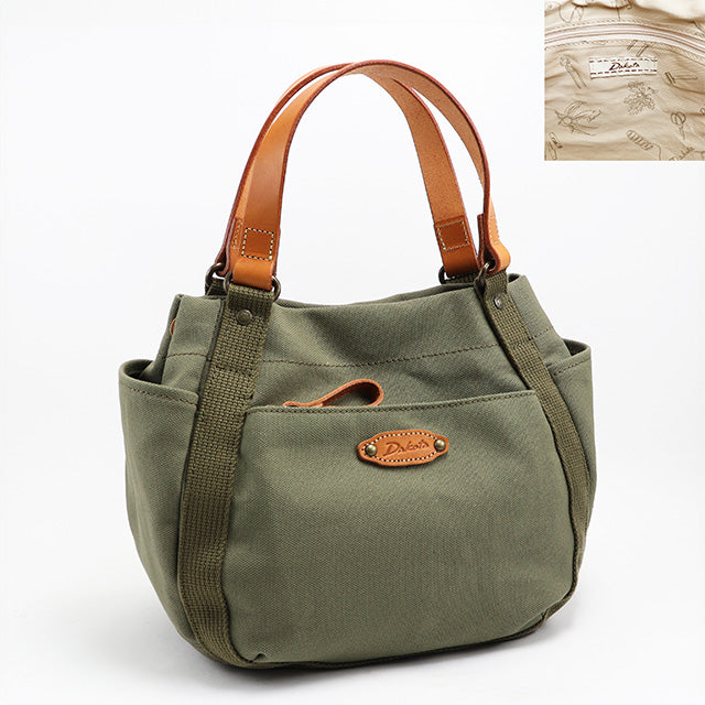 ハリ感のある帆布生地を使用したデイリーバッグシリーズです。ハンドルやブローチに厚ヌメ革をあしらい、カジュアルな雰囲気に仕上げました。飽きの来ないシンプルデザインで、オールシーズン活躍してくれます。