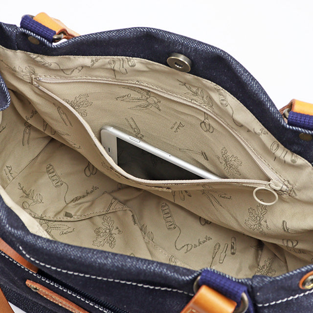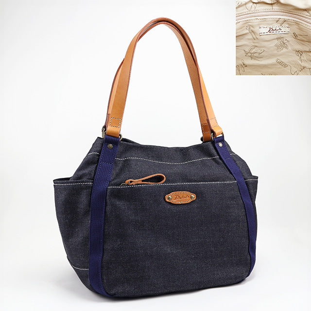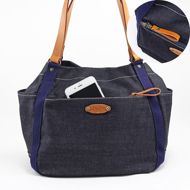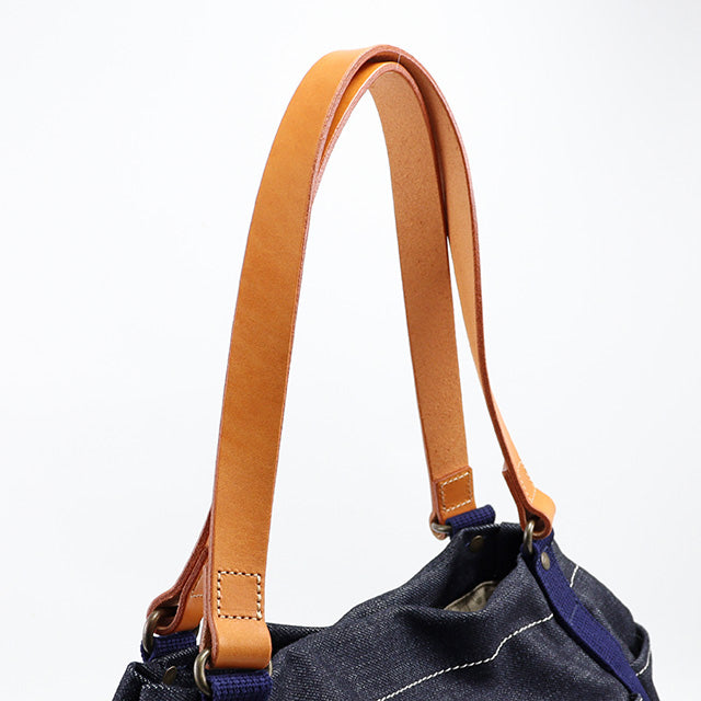 デニム生地で仕立てたデイリーバッグです。ハンドルやブローチに厚ヌメ革をあしらうことで、よりカジュアルに仕上げました。飽きの来ないシンプルデザインで、オールシーズン活躍してくれます。