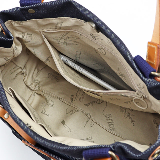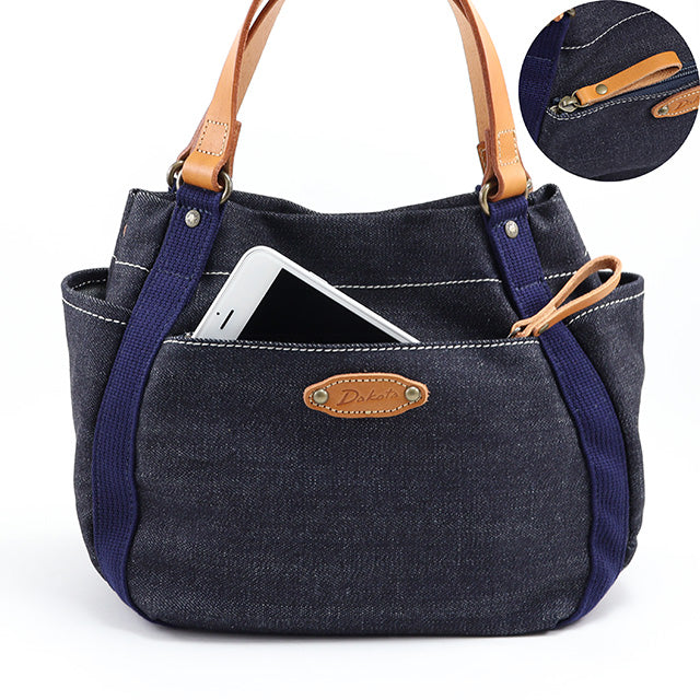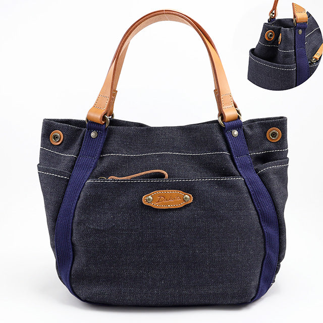 デニム生地で仕立てたデイリーバッグです。ハンドルやブローチに厚ヌメ革をあしらうことで、よりカジュアルに仕上げました。飽きの来ないシンプルデザインで、オールシーズン活躍してくれます。