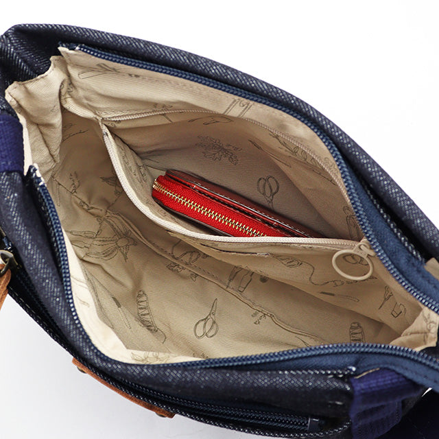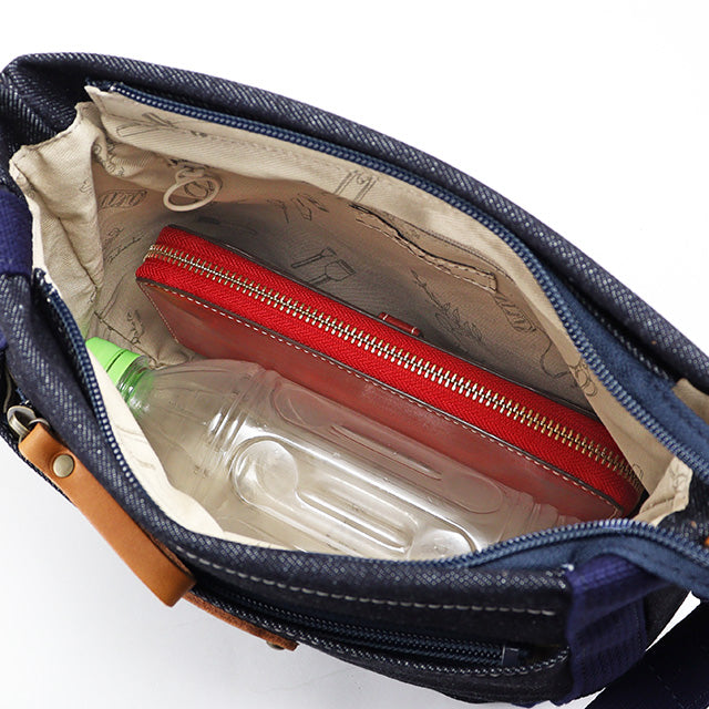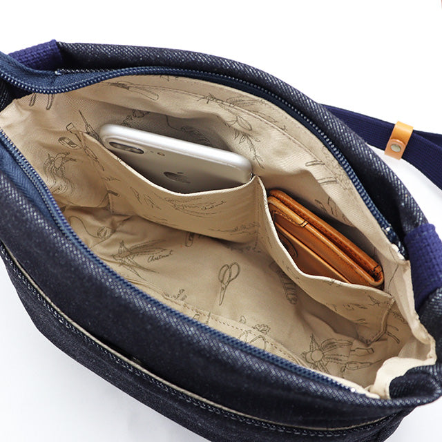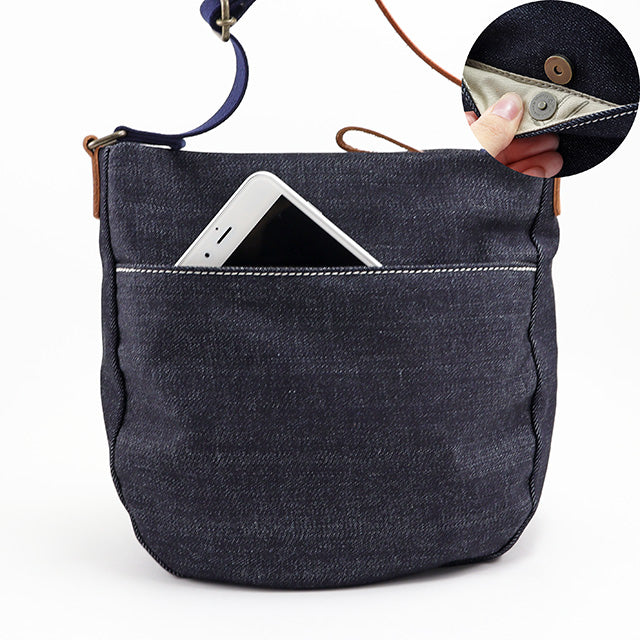 コロンと可愛らしいフォルムのショルダーバッグです。長財布が横向きでちょうど入るサイズ感で、デイリーに使うことができます。ショルダー紐の片側にはヌメ革を使用し、ラフ過ぎない大人カジュアルな印象に仕上げました。