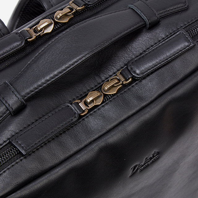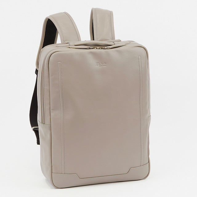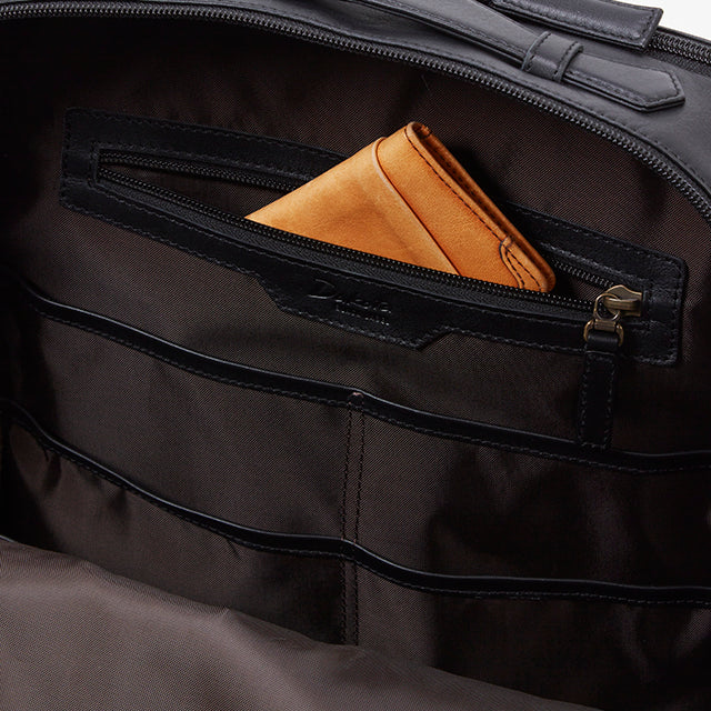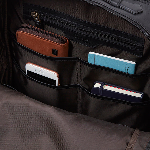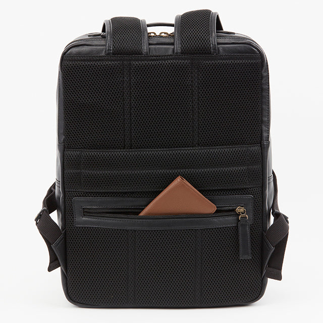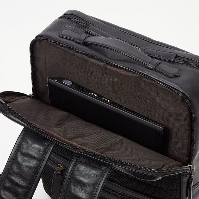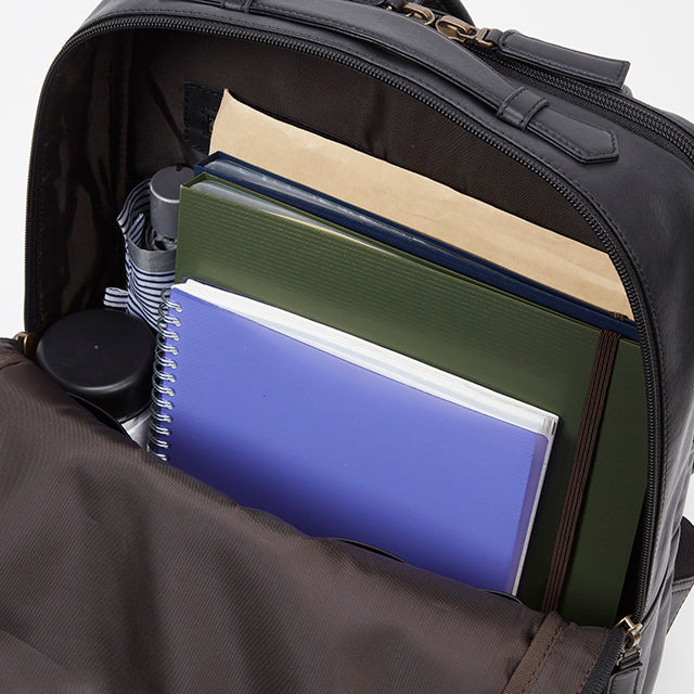スクエアフォルムで使いやすいビジネスリュックです。撥水加工を施しているので、外出先での急な雨でも安心してお持ちいただけます。A4資料が入る封筒も楽々入るサイズ感です。収納スペースは2層式なので、PCや資料と私物などを分けて収納することができ非常に便利です。