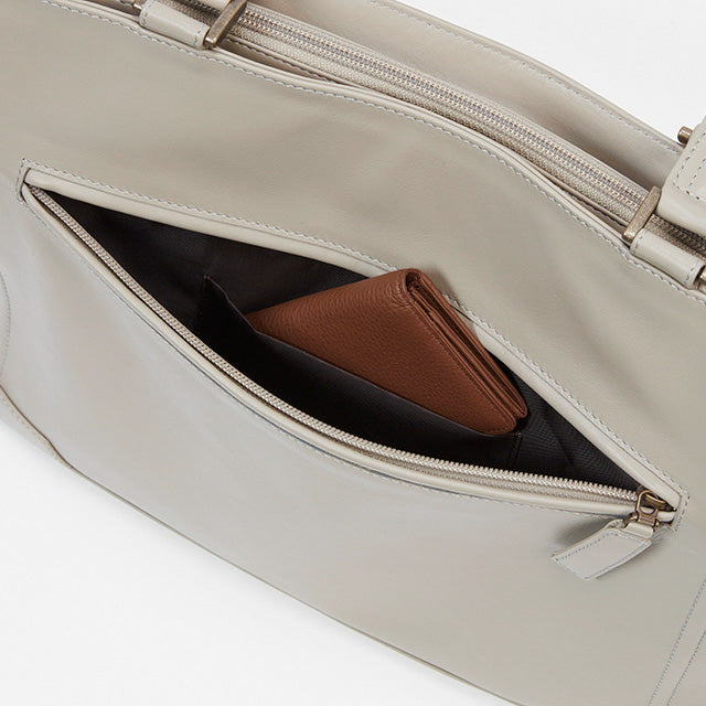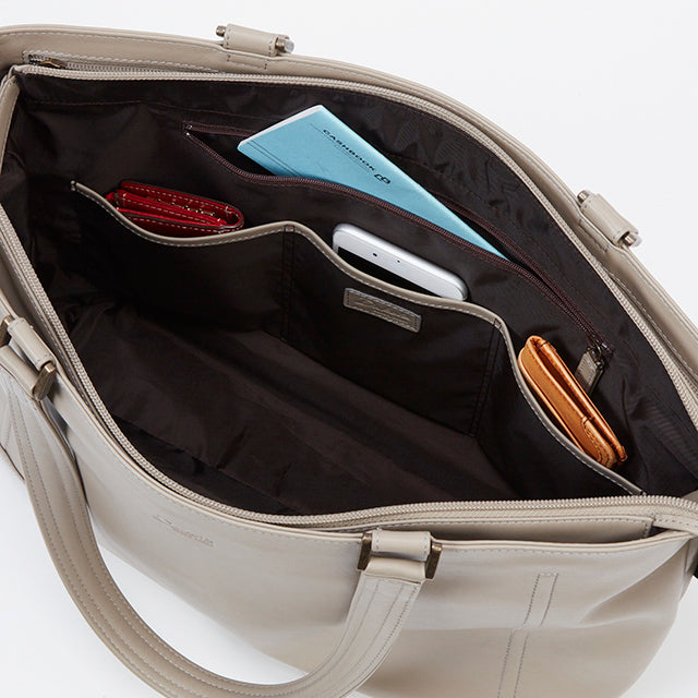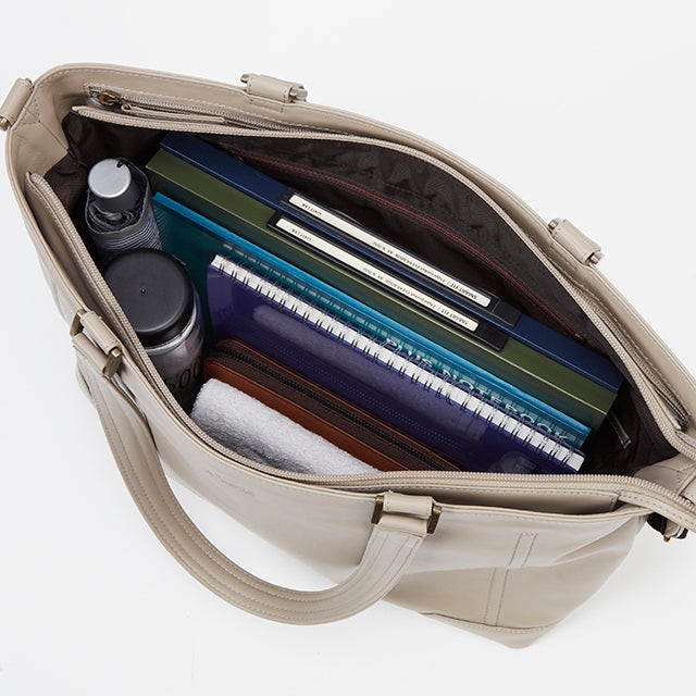 収納ポケットが充実したビジネスシーンで持ちやすいトートバッグです。内装ポケットが8箇所と充実しているので、トートバッグで困りがちな小物収納も楽々。A4封筒も折らずに収納できるファスナー開閉式の収納スペースもあります。