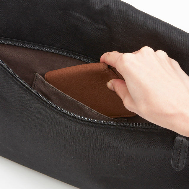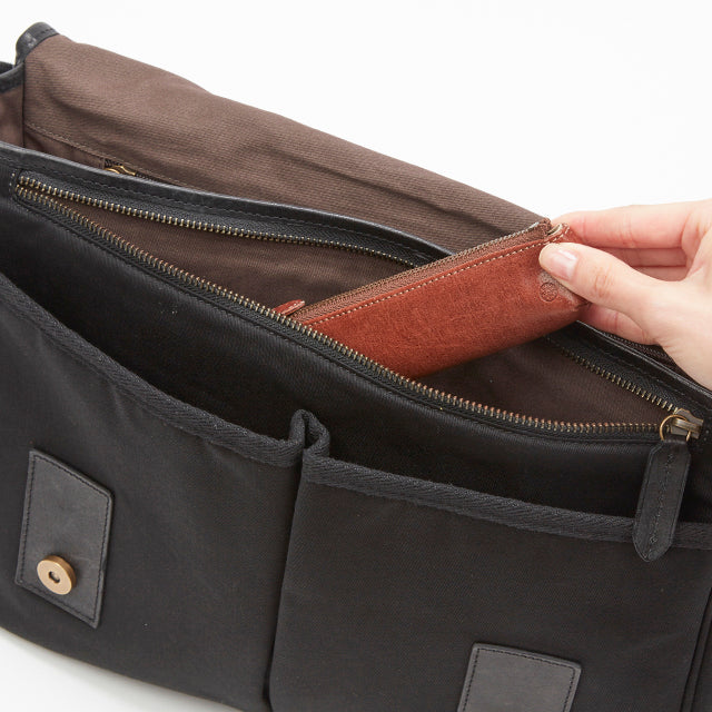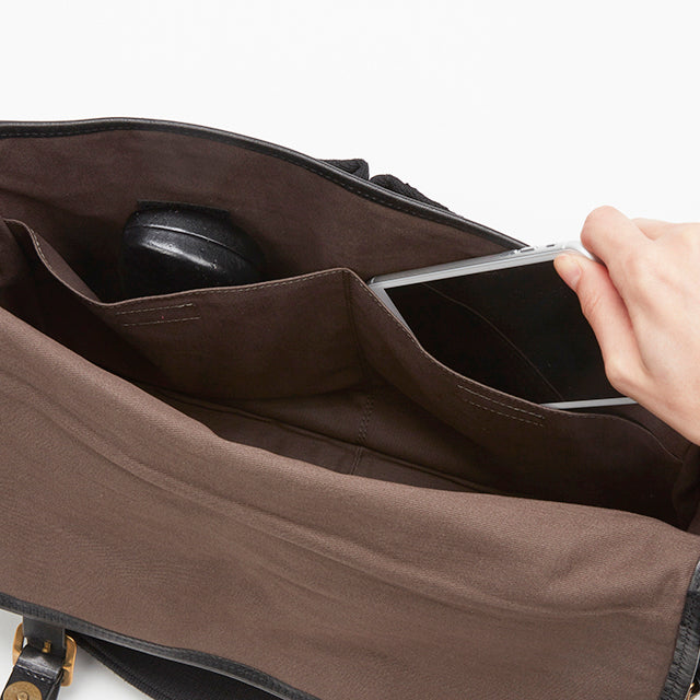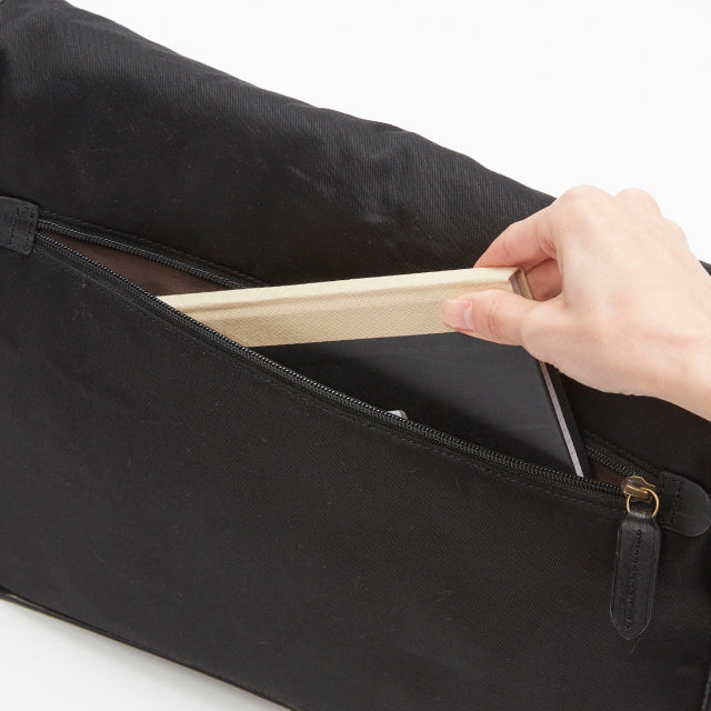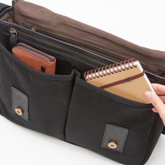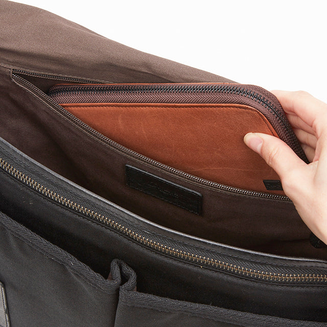 国産のチノクロスに撥水加工を施し、デイリーにタフに使い回せるショルダーバッグに仕立てました。付属はイタリア製牛革を使用し、上品さをプラス。幅広のショルダー紐や充実した収納ポケットなど、機能性も重視しました。