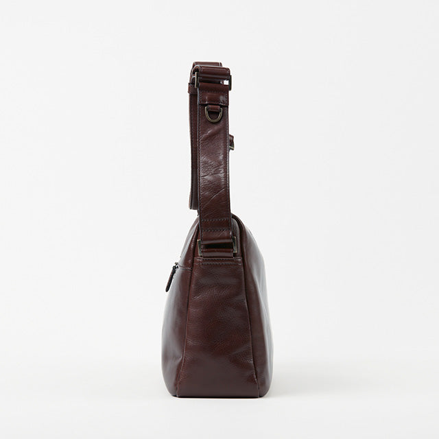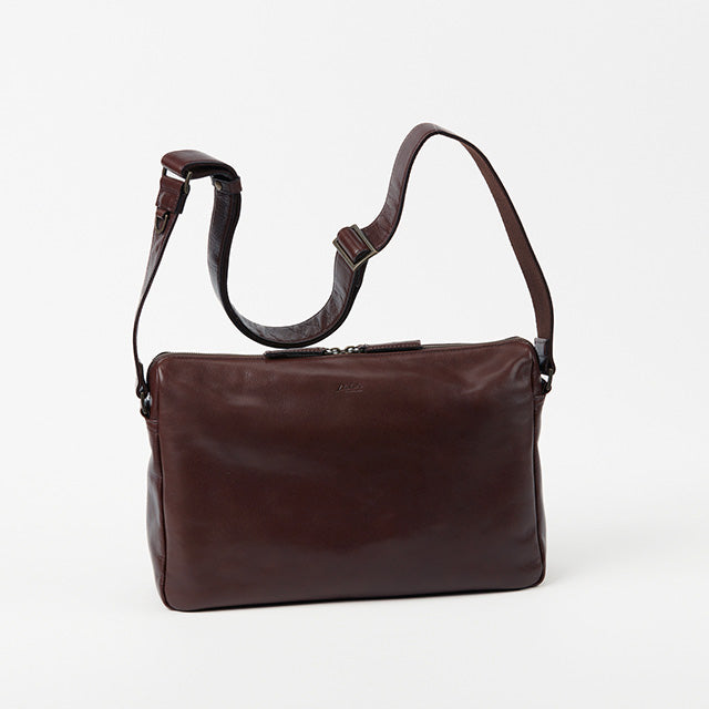 どこか懐かしさを感じさせるシルエットの本格レザーショルダーバッグ。
