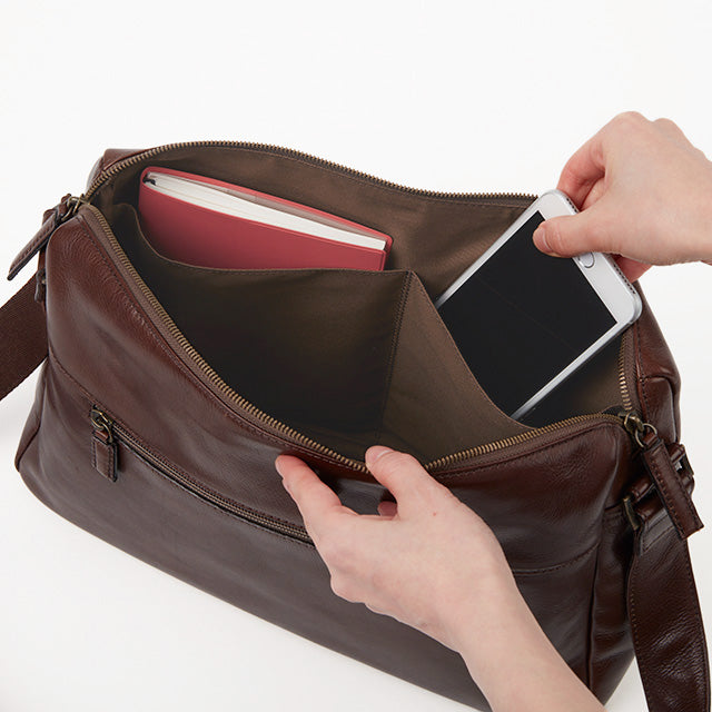 A4サイズがピッタリ入る、収納力のあるショルダーバッグ。背面にはファスナーポケットが備わっており、すぐに取り出したいアイテムの収納にも便利です。内部には、小物の整理がしやすいよう、オープンポケットが2つとファスナーポケットが1つ付いています。