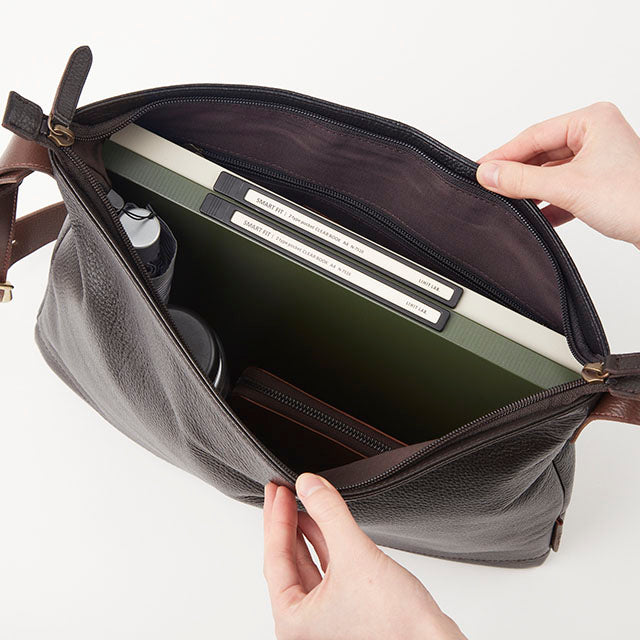 A4サイズ対応のスリムなショルダーバッグ。A4ファイルほか、500mlペットボトルなど毎日のお出かけに必要なアイテムが収納できます。内部には、スマホなどが入るオープンポケットが2つ、ファスナーポケットが1つ付いており、小物の整理もしやすくなっています。